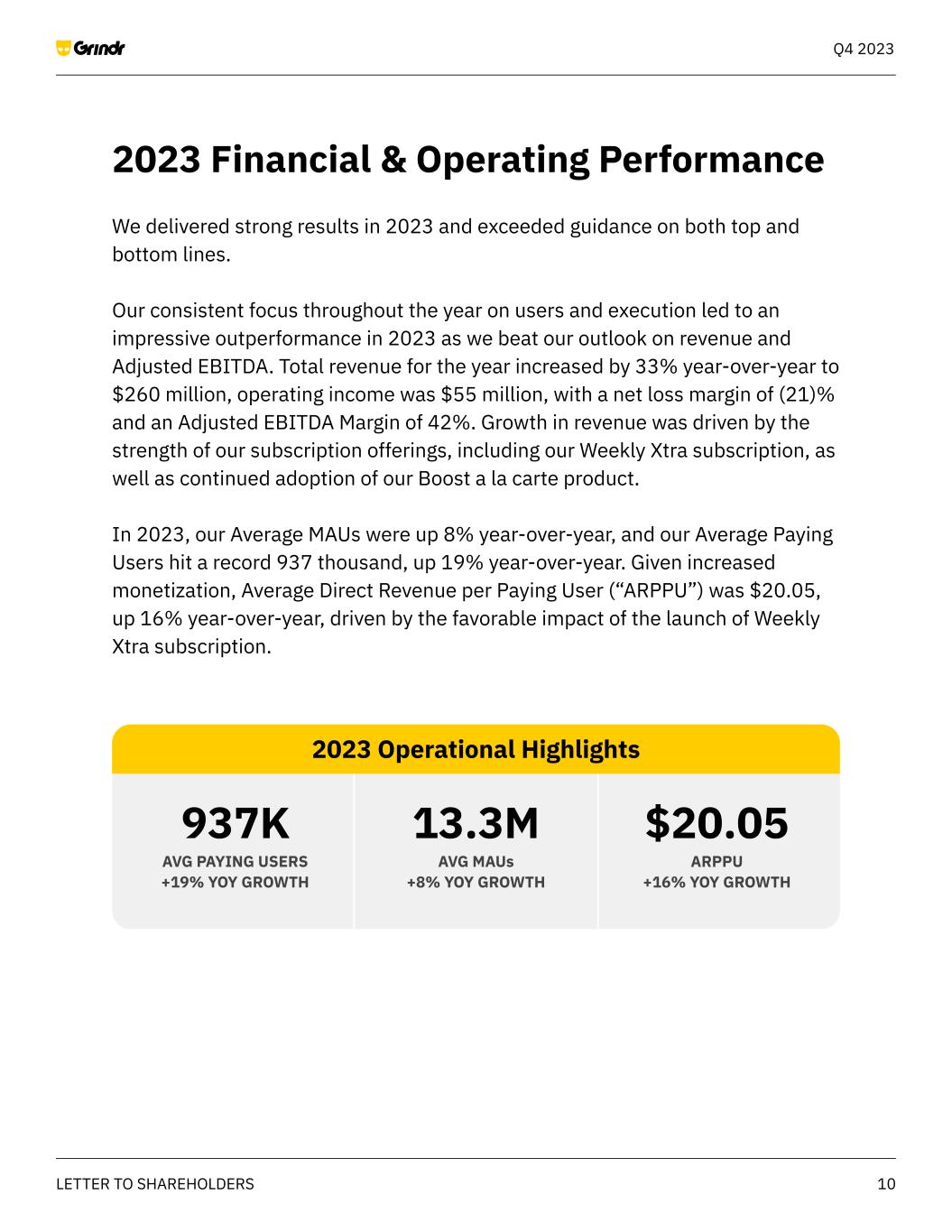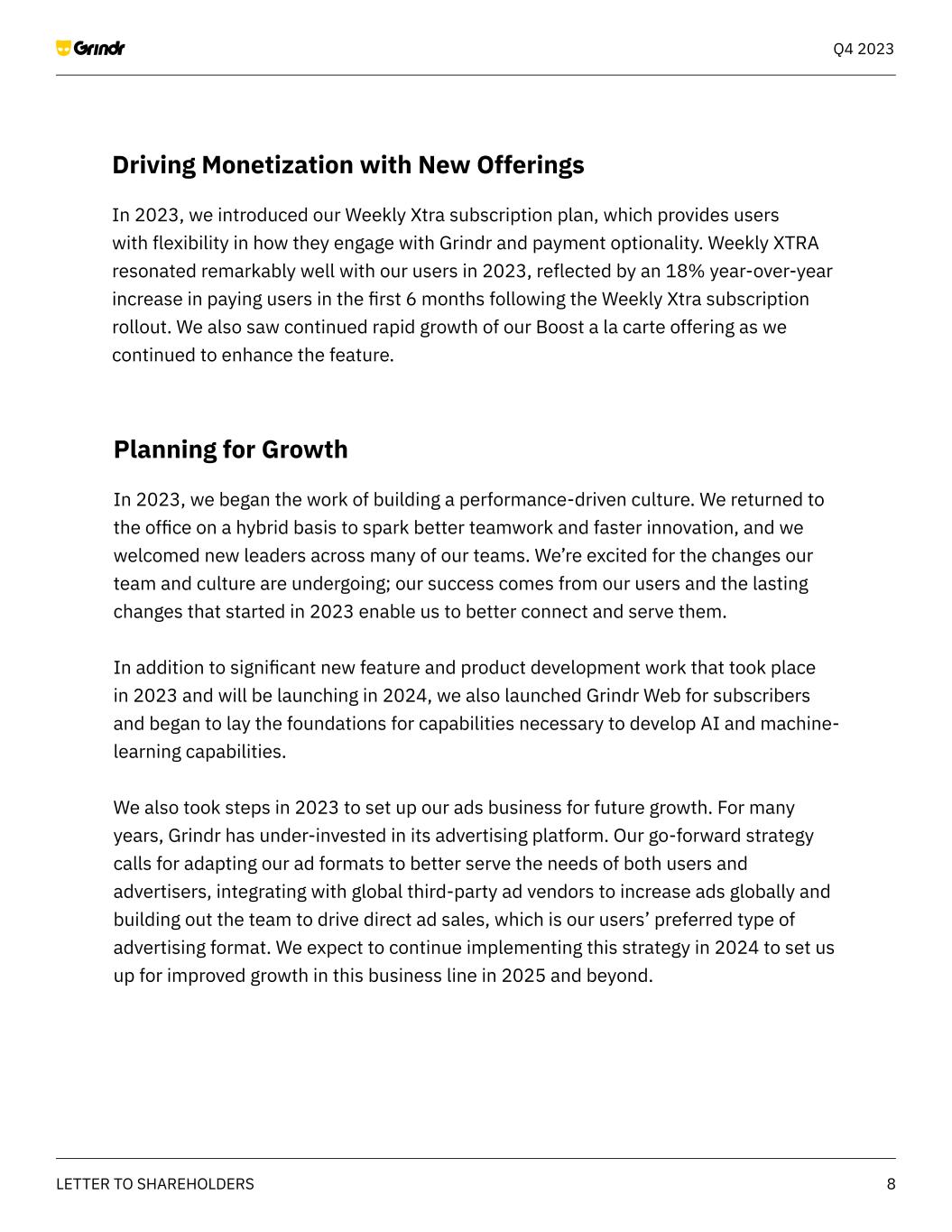 8LETTER TO SHAREHOLDERS Q4 2023 In 2023, we introduced our Weekly Xtra subscription plan, which provides users with flexibility in how they engage with Grindr and payment optionality. Weekly XTRA resonated remarkably well with our users in 2023, reflected by an 18% year-over-year increase in paying users in the first 6 months following the Weekly Xtra subscription rollout. We also saw continued rapid growth of our Boost a la carte offering as we continued to enhance the feature. Driving Monetization with New Offerings In 2023, we began the work of building a performance-driven culture. We returned to the office on a hybrid basis to spark better teamwork and faster innovation, and we welcomed new leaders across many of our teams. We’re excited for the changes our team and culture are undergoing; our success comes from our users and the lasting changes that started in 2023 enable us to better connect and serve them. In addition to significant new feature and product development work that took place in 2023 and will be launching in 2024, we also launched Grindr Web for subscribers and began to lay the foundations for capabilities necessary to develop AI and machine- learning capabilities. We also took steps in 2023 to set up our ads business for future growth. For many years, Grindr has under-invested in its advertising platform. Our go-forward strategy calls for adapting our ad formats to better serve the needs of both users and advertisers, integrating with global third-party ad vendors to increase ads globally and building out the team to drive direct ad sales, which is our users’ preferred type of advertising format. We expect to continue implementing this strategy in 2024 to set us up for improved growth in this business line in 2025 and beyond. Planning for Growth