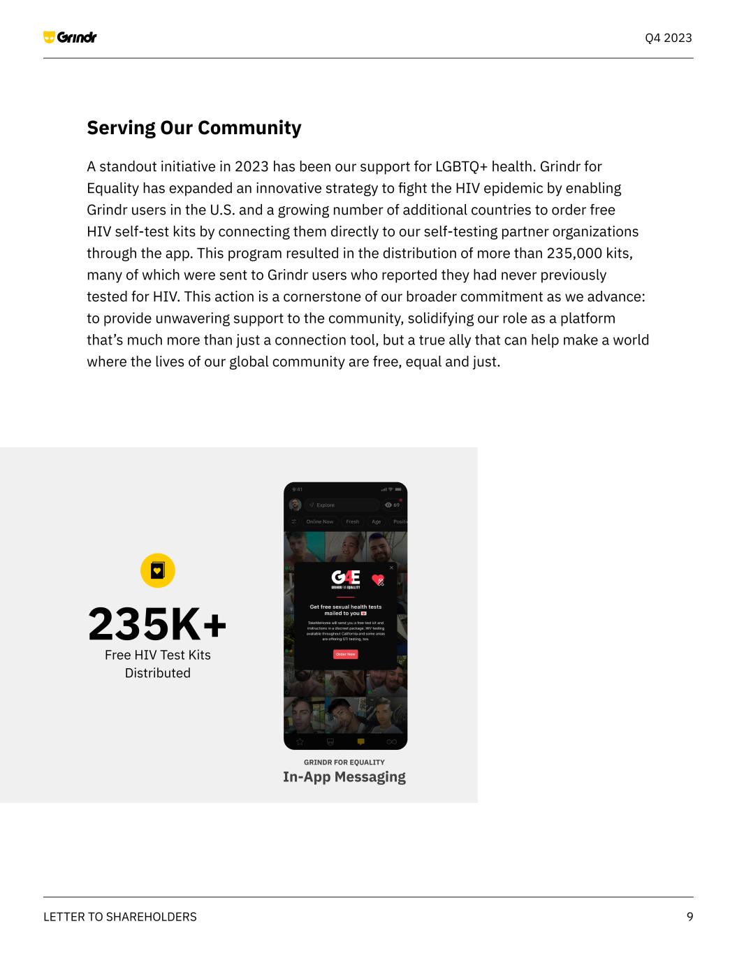 9LETTER TO SHAREHOLDERS Q4 2023 A standout initiative in 2023 has been our support for LGBTQ+ health. Grindr for Equality has expanded an innovative strategy to fight the HIV epidemic by enabling Grindr users in the U.S. and a growing number of additional countries to order free HIV self-test kits by connecting them directly to our self-testing partner organizations through the app. This program resulted in the distribution of more than 235,000 kits, many of which were sent to Grindr users who reported they had never previously tested for HIV. This action is a cornerstone of our broader commitment as we advance: to provide unwavering support to the community, solidifying our role as a platform that’s much more than just a connection tool, but a true ally that can help make a world where the lives of our global community are free, equal and just. Serving Our Community GRINDR FOR EQUALITY In-App Messaging 235K+ Free HIV Test Kits Distributed