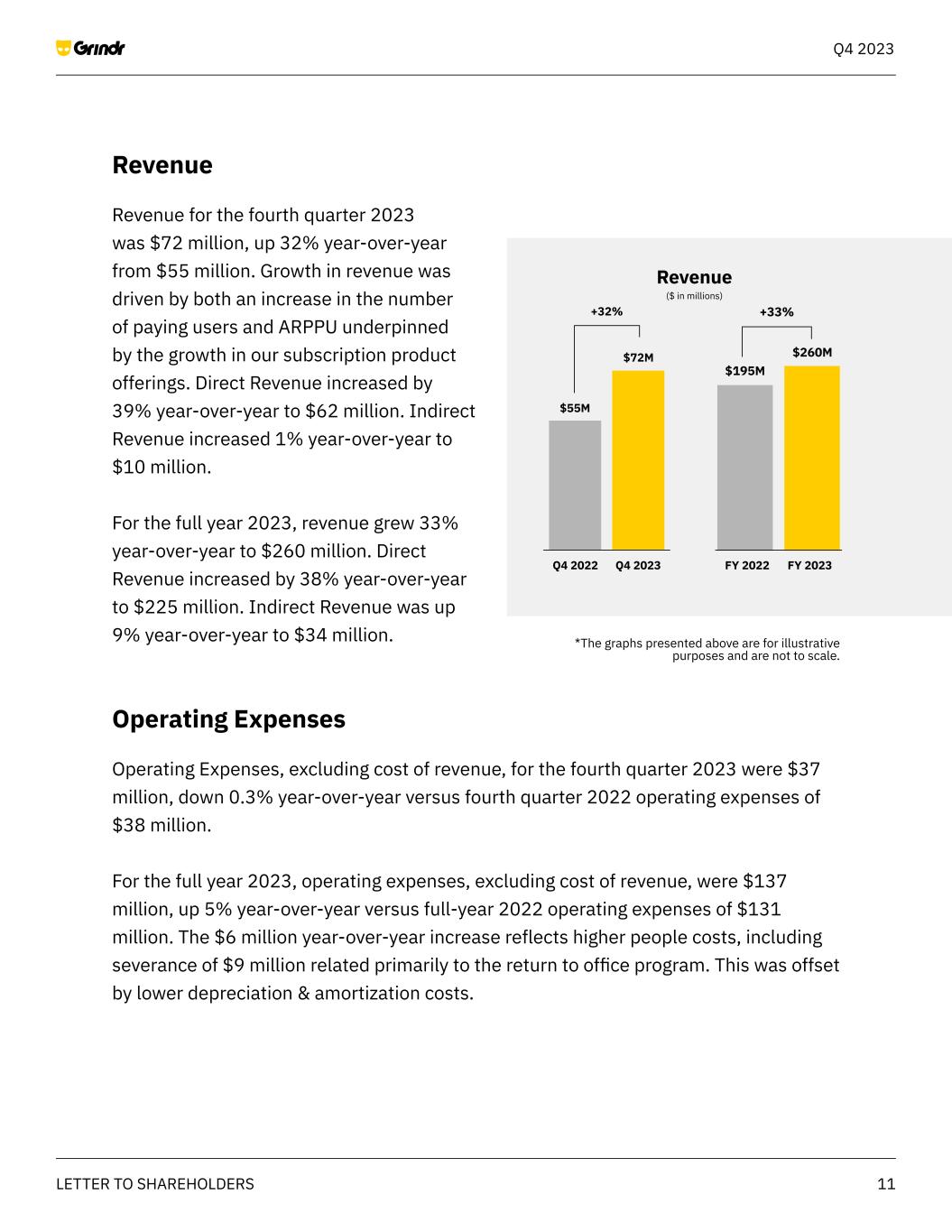 11LETTER TO SHAREHOLDERS Q4 2023 +33% $55M $72M +32% Q4 2023Q4 2022 FY 2023FY 2022 *The graphs presented above are for illustrative purposes and are not to scale. Revenue for the fourth quarter 2023 was $72 million, up 32% year-over-year from $55 million. Growth in revenue was driven by both an increase in the number of paying users and ARPPU underpinned by the growth in our subscription product offerings. Direct Revenue increased by 39% year-over-year to $62 million. Indirect Revenue increased 1% year-over-year to $10 million. For the full year 2023, revenue grew 33% year-over-year to $260 million. Direct Revenue increased by 38% year-over-year to $225 million. Indirect Revenue was up 9% year-over-year to $34 million. Operating Expenses, excluding cost of revenue, for the fourth quarter 2023 were $37 million, down 0.3% year-over-year versus fourth quarter 2022 operating expenses of $38 million. For the full year 2023, operating expenses, excluding cost of revenue, were $137 million, up 5% year-over-year versus full-year 2022 operating expenses of $131 million. The $6 million year-over-year increase reflects higher people costs, including severance of $9 million related primarily to the return to office program. This was offset by lower depreciation & amortization costs. Revenue Operating Expenses $195M Revenue ($ in millions)