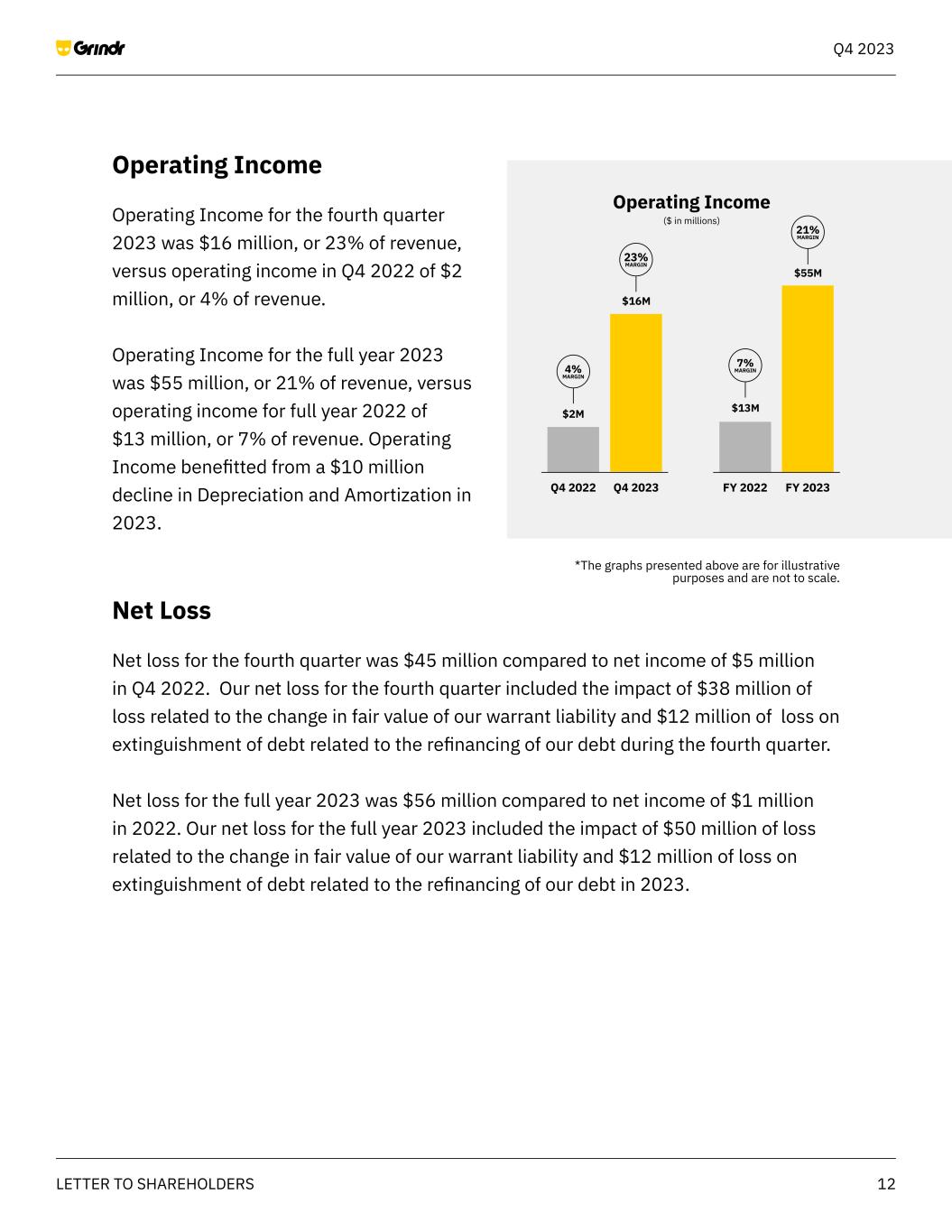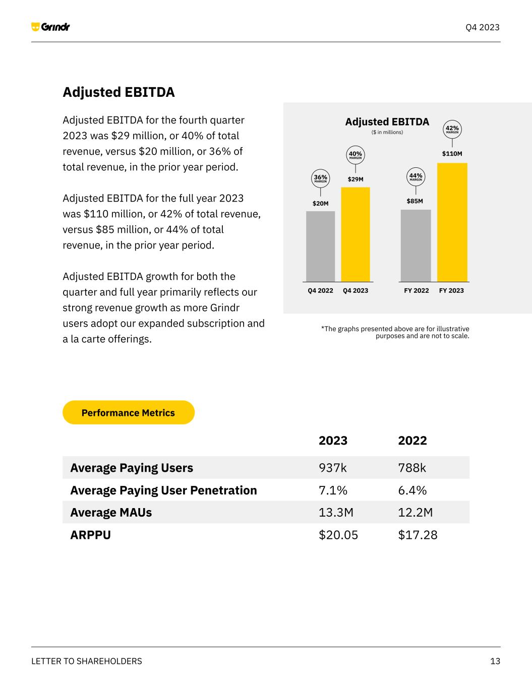 13LETTER TO SHAREHOLDERS Q4 2023 Average Paying Users 937k 2023 788k 2022 Average MAUs 13.3M 12.2M Average Paying User Penetration 7.1% 6.4% ARPPU $20.05 $17.28 *The graphs presented above are for illustrative purposes and are not to scale. Adjusted EBITDA Adjusted EBITDA for the fourth quarter 2023 was $29 million, or 40% of total revenue, versus $20 million, or 36% of total revenue, in the prior year period. Adjusted EBITDA for the full year 2023 was $110 million, or 42% of total revenue, versus $85 million, or 44% of total revenue, in the prior year period. Adjusted EBITDA growth for both the quarter and full year primarily reflects our strong revenue growth as more Grindr users adopt our expanded subscription and a la carte offerings. Q4 2023Q4 2022 FY 2023FY 2022 $20M Adjusted EBITDA ($ in millions) Performance Metrics