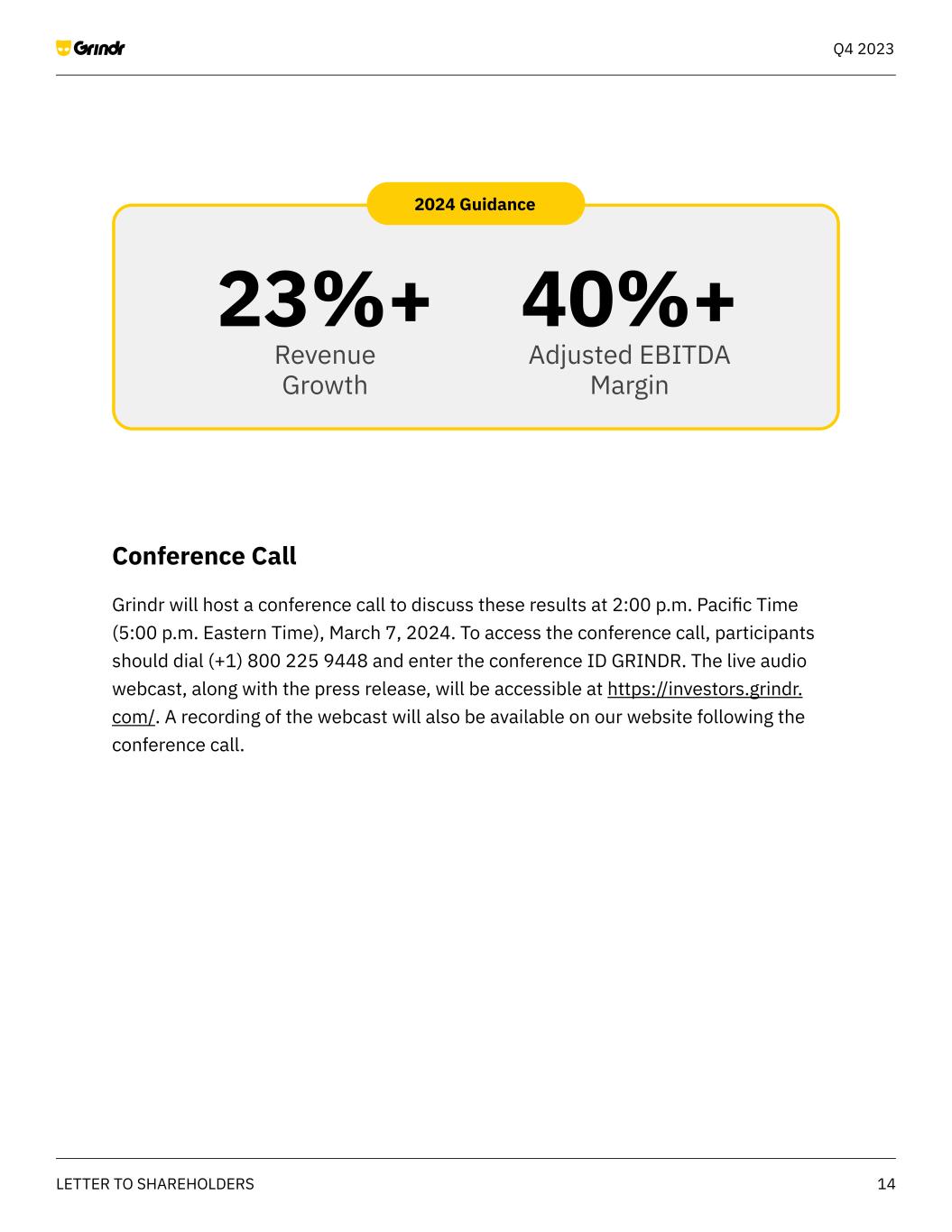 14LETTER TO SHAREHOLDERS Q4 2023 23%+ Revenue Growth Adjusted EBITDA Margin 40%+ Conference Call Grindr will host a conference call to discuss these results at 2:00 p.m. Pacific Time (5:00 p.m. Eastern Time), March 7, 2024. To access the conference call, participants should dial (+1) 800 225 9448 and enter the conference ID GRINDR. The live audio webcast, along with the press release, will be accessible at https://investors.grindr. com/. A recording of the webcast will also be available on our website following the conference call. 2024 Guidance