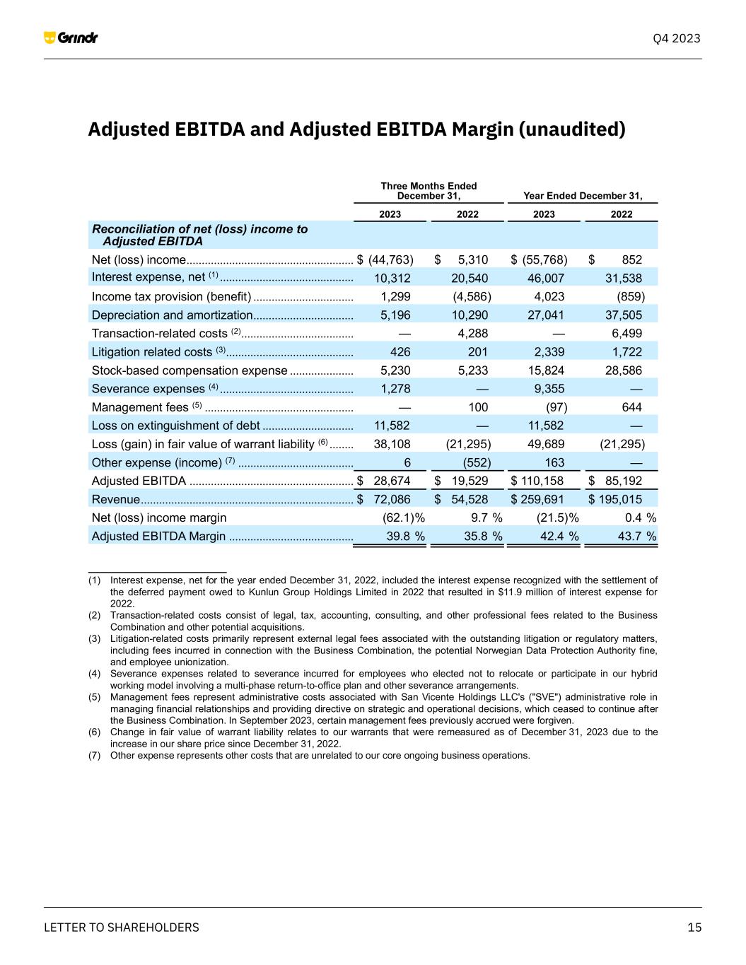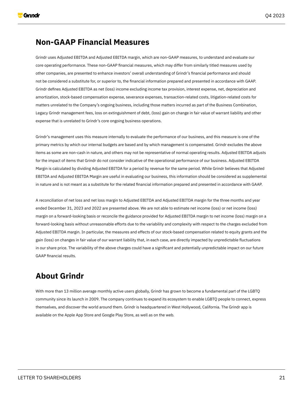 21LETTER TO SHAREHOLDERS Q4 2023 Non-GAAP Financial Measures Grindr uses Adjusted EBITDA and Adjusted EBITDA margin, which are non-GAAP measures, to understand and evaluate our core operating performance. These non-GAAP financial measures, which may differ from similarly titled measures used by other companies, are presented to enhance investors’ overall understanding of Grindr’s financial performance and should not be considered a substitute for, or superior to, the financial information prepared and presented in accordance with GAAP. Grindr defines Adjusted EBITDA as net (loss) income excluding income tax provision, interest expense, net, depreciation and amortization, stock-based compensation expense, severance expenses, transaction-related costs, litigation-related costs for matters unrelated to the Company’s ongoing business, including those matters incurred as part of the Business Combination, Legacy Grindr management fees, loss on extinguishment of debt, (loss) gain on change in fair value of warrant liability and other expense that is unrelated to Grindr’s core ongoing business operations. Grindr’s management uses this measure internally to evaluate the performance of our business, and this measure is one of the primary metrics by which our internal budgets are based and by which management is compensated. Grindr excludes the above items as some are non-cash in nature, and others may not be representative of normal operating results. Adjusted EBITDA adjusts for the impact of items that Grindr do not consider indicative of the operational performance of our business. Adjusted EBITDA Margin is calculated by dividing Adjusted EBITDA for a period by revenue for the same period. While Grindr believes that Adjusted EBITDA and Adjusted EBITDA Margin are useful in evaluating our business, this information should be considered as supplemental in nature and is not meant as a substitute for the related financial information prepared and presented in accordance with GAAP. A reconciliation of net loss and net loss margin to Adjusted EBITDA and Adjusted EBITDA margin for the three months and year ended December 31, 2023 and 2022 are presented above. We are not able to estimate net income (loss) or net income (loss) margin on a forward-looking basis or reconcile the guidance provided for Adjusted EBITDA margin to net income (loss) margin on a forward-looking basis without unreasonable efforts due to the variability and complexity with respect to the charges excluded from Adjusted EBITDA margin. In particular, the measures and effects of our stock-based compensation related to equity grants and the gain (loss) on changes in fair value of our warrant liability that, in each case, are directly impacted by unpredictable fluctuations in our share price. The variability of the above charges could have a significant and potentially unpredictable impact on our future GAAP financial results. About Grindr With more than 13 million average monthly active users globally, Grindr has grown to become a fundamental part of the LGBTQ community since its launch in 2009. The company continues to expand its ecosystem to enable LGBTQ people to connect, express themselves, and discover the world around them. Grindr is headquartered in West Hollywood, California. The Grindr app is available on the Apple App Store and Google Play Store, as well as on the web.