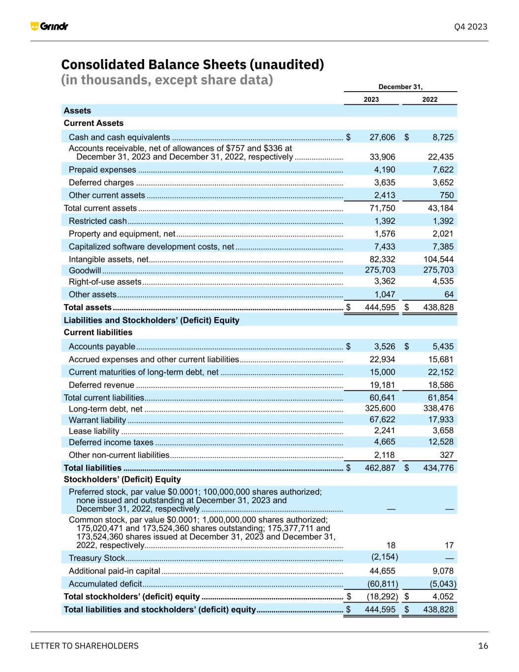 16LETTER TO SHAREHOLDERS Q4 2023 Unaudited Consolidated Balance Sheets (in thousands, except share data) December 31, 2023 2022 Assets Current Assets Cash and cash equivalents .................................................................................. $ 27,606 $ 8,725 Accounts receivable, net of allowances of $757 and $336 at December 31, 2023 and December 31, 2022, respectively ........................ 33,906 22,435 Prepaid expenses .................................................................................................. 4,190 7,622 Deferred charges ................................................................................................... 3,635 3,652 Other current assets .............................................................................................. 2,413 750 Total current assets .................................................................................................. 71,750 43,184 Restricted cash ....................................................................................................... 1,392 1,392 Property and equipment, net ................................................................................ 1,576 2,021 Capitalized software development costs, net .................................................... 7,433 7,385 Intangible assets, net............................................................................................. 82,332 104,544 Goodwill ................................................................................................................... 275,703 275,703 Right-of-use assets ................................................................................................ 3,362 4,535 Other assets ............................................................................................................ 1,047 64 Total assets .............................................................................................................. $ 444,595 $ 438,828 Liabilities and Stockholders’ (Deficit) Equity Current liabilities Accounts payable ................................................................................................... $ 3,526 $ 5,435 Accrued expenses and other current liabilities .................................................. 22,934 15,681 Current maturities of long-term debt, net ........................................................... 15,000 22,152 Deferred revenue ................................................................................................... 19,181 18,586 Total current liabilities............................................................................................... 60,641 61,854 Long-term debt, net ............................................................................................... 325,600 338,476 Warrant liability ....................................................................................................... 67,622 17,933 Lease liability .......................................................................................................... 2,241 3,658 Deferred income taxes .......................................................................................... 4,665 12,528 Other non-current liabilities................................................................................... 2,118 327 Total liabilities ......................................................................................................... $ 462,887 $ 434,776 Stockholders’ (Deficit) Equity Preferred stock, par value $0.0001; 100,000,000 shares authorized; none issued and outstanding at December 31, 2023 and December 31, 2022, respectively .................................................................... — — Common stock, par value $0.0001; 1,000,000,000 shares authorized; 175,020,471 and 173,524,360 shares outstanding; 175,377,711 and 173,524,360 shares issued at December 31, 2023 and December 31, 2022, respectively............................................................................................... 18 17 Treasury Stock ........................................................................................................ (2,154) — Additional paid-in capital ....................................................................................... 44,655 9,078 Accumulated deficit ................................................................................................ (60,811) (5,043) Total stockholders’ (deficit) equity .................................................................... $ (18,292) $ 4,052 Consolidated Balance Sheets (unaudited) (in thousands, except share data) Total liabilities and stockholders’ (deficit) equity .......................................... $ 444,595 $ 438,828 Unaudited Consolidated Statements of Operations and Comprehensive (Loss) Income (in thousands) Three Months Ended December 31, Year Ended December 31, 2023 2022 2023 2022 Revenue ............................................................... $ 72,086 $ 54,528 $ 259,691 $ 195,015 Operating costs and expenses Cost of revenue (exclusive of depreciation and amortization shown separately below) ................................................................ 18,290 14,522 67,458 51,280 Selling, general and administrative expense .. 27,894 21,358 80,417 75,295 Product development expense .......................... 4,351 5,919 29,327 17,900 Depreciation and amortization ........................... 5,196 10,290 27,041 37,505 Total operating expenses ................................ 55,731 52,089 204,243 181,980 Income from operations .................................. 16,355 2,439 55,448 13,035 Other income (expense) Interest expense, net .......................................... (10,312) (20,540) (46,007) (31,538) Other income (expense), net ............................. 183 (2,470) 85 (2,799) Loss on extinguishment of debt ........................ (11,582) — (11,582) — (Loss) gain in fair value of warrant liability .