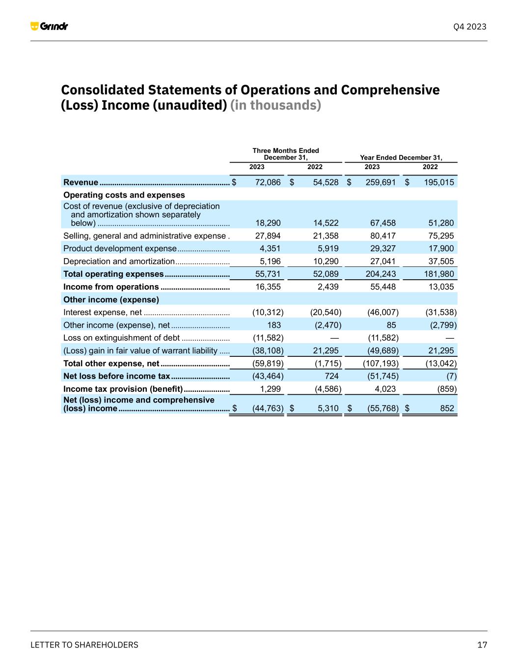 17LETTER TO SHAREHOLDERS Q4 2023 Total liabilities and stockholders’ (deficit) equity .......................................... $ 444,595 $ 438,828 Unaudited Consolidated Statements of Operations and Comprehensive (Loss) Income (in thousands) Three Months Ended December 31, Year Ended December 31, 2023 2022 2023 2022 Revenue ............................................................... $ 72,086 $ 54,528 $ 259,691 $ 195,015 Operating costs and expenses Cost of revenue (exclusive of depreciation and amortization shown separately below) ................................................................ 18,290 14,522 67,458 51,280 Selling, general and administrative expense .. 27,894 21,358 80,417 75,295 Product development expense .......................... 4,351 5,919 29,327 17,900 Depreciation and amortization ........................... 5,196 10,290 27,041 37,505 Total operating expenses ................................ 55,731 52,089 204,243 181,980 Income from operations .................................. 16,355 2,439 55,448 13,035 Other income (expense) Interest expense, net .......................................... (10,312) (20,540) (46,007) (31,538) Other income (expense), net ............................. 183 (2,470) 85 (2,799) Loss on extinguishment of debt ........................ (11,582) — (11,582) — (Loss) gain in fair value of warrant liability ...... (38,108) 21,295 (49,689) 21,295 Total other expense, net .................................. (59,819) (1,715) (107,193) (13,042) Net loss before income tax ............................. (43,464) 724 (51,745) (7) Income tax provision (benefit) ....................... 1,299 (4,586) 4,023 (859) Net (loss) income and comprehensive (loss) income ...................................................... $ (44,763) $ 5,310 $ (55,768) $ 852 C nsol dated Statements of Operations and Comprehensive (Loss) Inc me (unaudited) (in thousa ds)