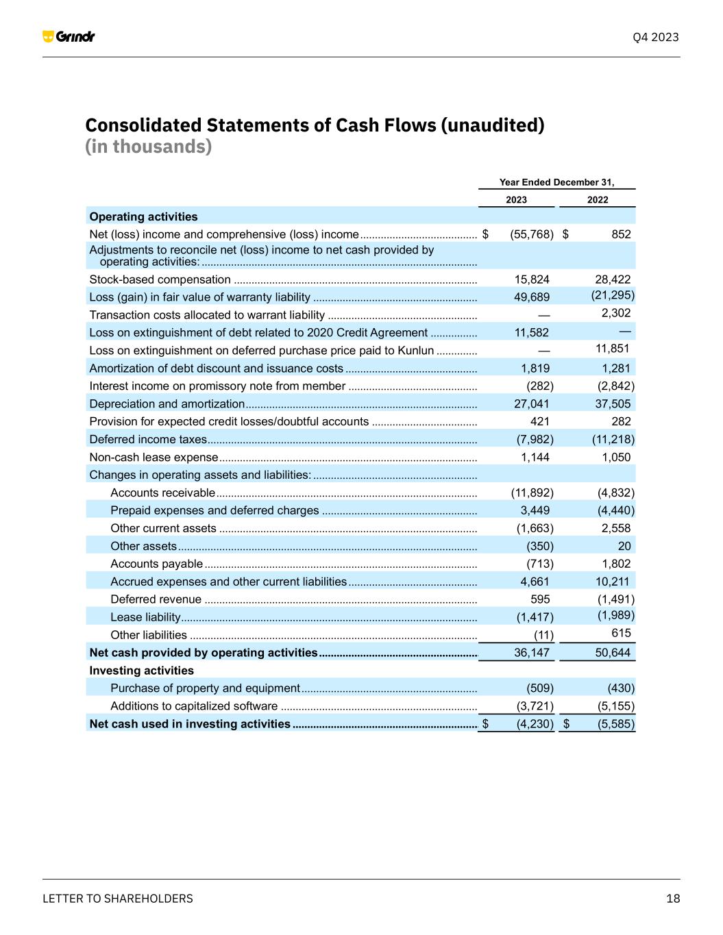 18LETTER TO SHAREHOLDERS Q4 2023 Unaudited Consolidated Statements of Cash Flows (amounts in thousands) Year Ended December 31, 2023 2022 Operating activities Net (loss) income and comprehensive (loss) income ......................................... $ (55,768) $ 852 Adjustments to reconcile net (loss) income to net cash provided by operating activities: ............................................................................................... Stock-based compensation .................................................................................... 15,824 28,422 Loss (gain) in fair value of warranty liability ......................................................... 49,689 (21,295) Transaction costs allocated to warrant liability .................................................... — 2,302 Loss on extinguishment of debt related to 2020 Credit Agreement ................. 11,582 — Loss on extinguishment on deferred purchase price paid to Kunlun ............... — 11,851 Amortization of debt discount and issuance costs .............................................. 1,819 1,281 Interest income on promissory note from member ............................................. (282) (2,842) Depreciation and amortization ................................................................................ 27,041 37,505 Provision for expected credit losses/doubtful accounts ..................................... 421 282 Deferred income taxes............................................................................................. (7,982) (11,218) Non-cash lease expense ......................................................................................... 1,144 1,050 Changes in operating assets and liabilities: ......................................................... Accounts receivable .......................................................................................... (11,892) (4,832) Prepaid expenses and deferred charges ...................................................... 3,449 (4,440) Other current assets ......................................................................................... (1,663) 2,558 Other assets ....................................................................................................... (350) 20 Accounts payable .............................................................................................. (713) 1,802 Accrued expenses and other current liabilities ............................................. 4,661 10,211 Deferred revenue .............................................................................................. 595 (1,491) Lease liability...................................................................................................... (1,417) (1,989) Other liabilities ................................................................................................... (11) 615 Net cash provided by operating activities ....................................................... 36,147 50,644 Investing activities Purchase of property and equipment ............................................................. (509) (430) Additions to capitalized software .................................................................... (3,721) (5,155) Net cash used in investing activities ................................................................ $ (4,230) $ (5,585) Consolidated Statements of Cash Flo s (unaudited) (in thousands)