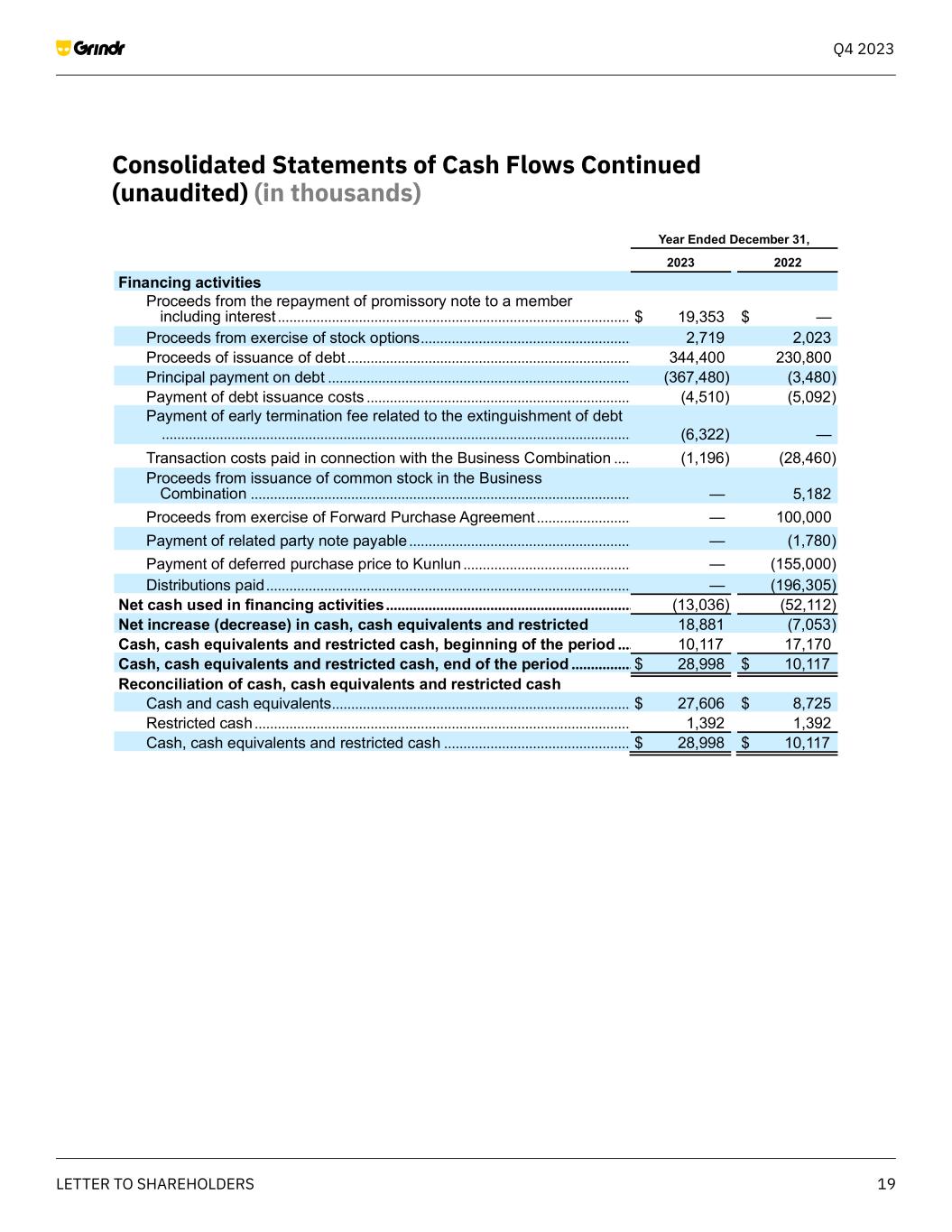19LETTER TO SHAREHOLDERS Q4 2023 Unaudited Consolidated Statements of Cash Flows (continued) (amounts in thousands) Year Ended December 31, 2023 2022 Financing activities Proceeds from the repayment of promissory note to a member including interest ............................................................................................ $ 19,353 $ — Proceeds from exercise of stock options ....................................................... 2,719 2,023 Proceeds of issuance of debt .......................................................................... 344,400 230,800 Principal payment on debt ............................................................................... (367,480) (3,480) Payment of debt issuance costs ..................................................................... (4,510) (5,092) Payment of early termination fee related to the extinguishment of debt .......................................................................................................................... (6,322) — Transaction costs paid in connection with the Business Combination ..... (1,196) (28,460) Proceeds from issuance of common stock in the Business Combination ................................................................................................... — 5,182 Proceeds from exercise of Forward Purchase Agreement ......................... — 100,000 Payment of related party note payable .......................................................... — (1,780) Payment of deferred purchase price to Kunlun ............................................ — (155,000) Distributions paid ............................................................................................... — (196,305) Net cash used in financing activities ................................................................ (13,036) (52,112) Net increase (decrease) in cash, cash equivalents and restricted cash ........................................................................................................................ 18,881 (7,053) Cash, cash equivalents and restricted cash, beginning of the period .... 10,117 17,170 Cash, cash equivalents and restricted cash, end of the period ................ $ 28,998 $ 10,117 Reconciliation of cash, cash equivalents and restricted cash Cash and cash equivalents.............................................................................. $ 27,606 $ 8,725 Restricted cash .................................................................................................. 1,392 1,392 Cash, cash equivalents and restricted cash ................................................. $ 28,998 $ 10,117 Consolidated Statements of Cash Flows Continued (u audited) (in thous nds)