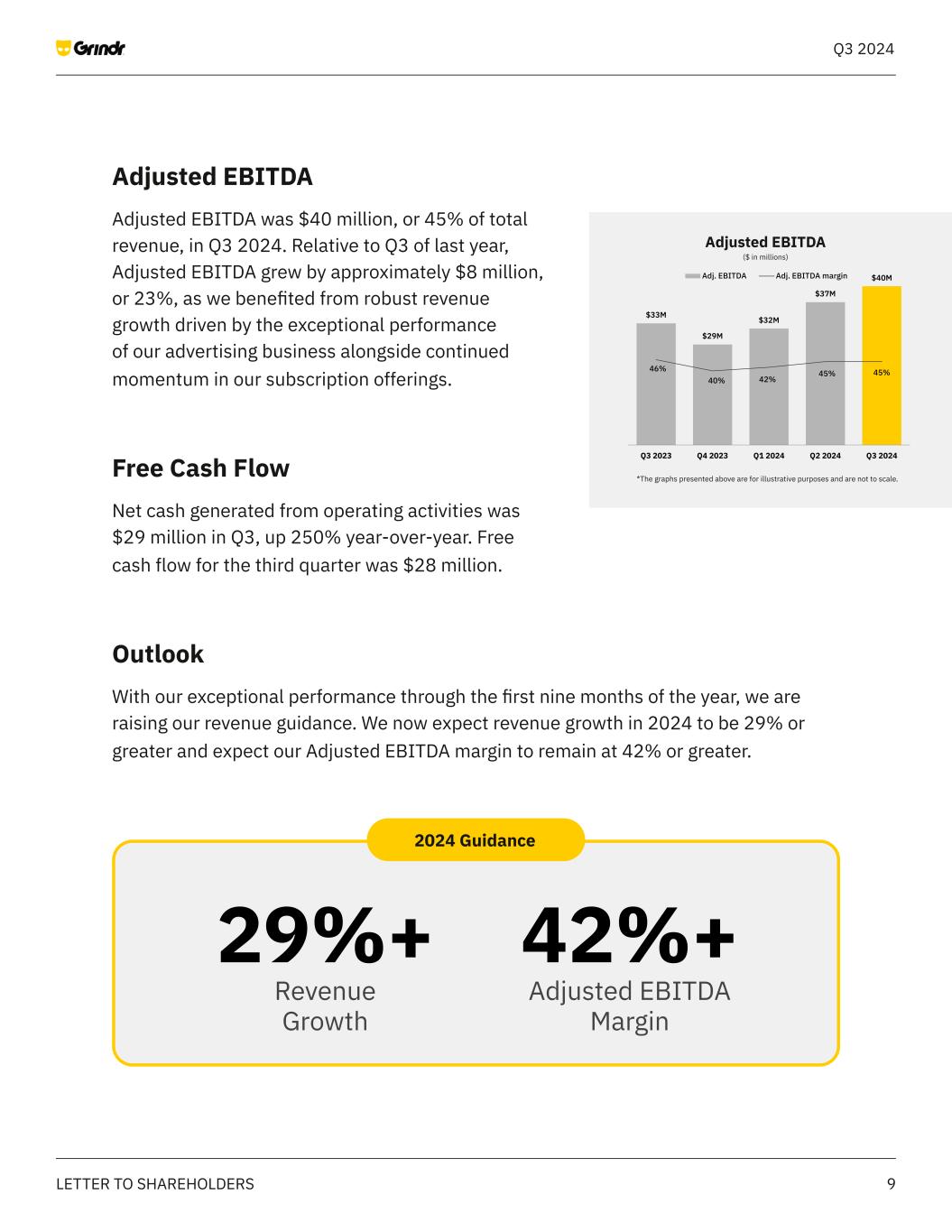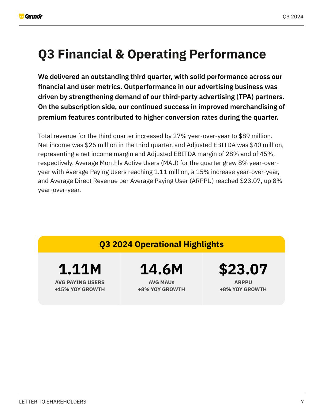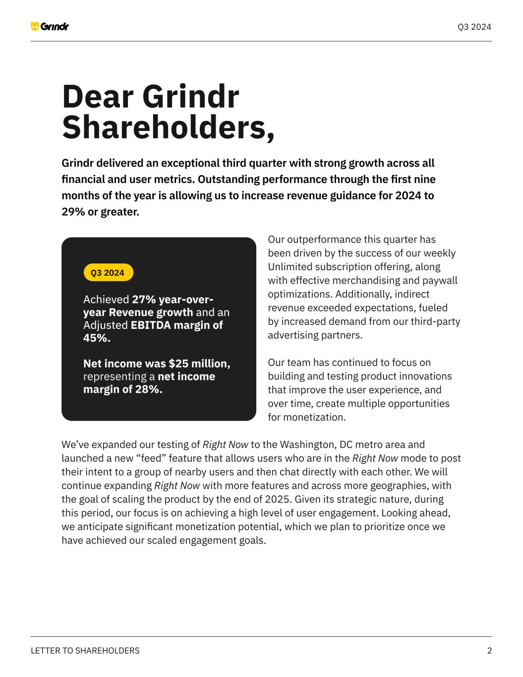 2LETTER TO SHAREHOLDERS Q3 2024 Grindr delivered an exceptional third quarter with strong growth across all financial and user metrics. Outstanding performance through the first nine months of the year is allowing us to increase revenue guidance for 2024 to 29% or greater. Our outperformance this quarter has been driven by the success of our weekly Unlimited subscription offering, along with effective merchandising and paywall optimizations. Additionally, indirect revenue exceeded expectations, fueled by increased demand from our third-party advertising partners. Our team has continued to focus on building and testing product innovations that improve the user experience, and over time, create multiple opportunities for monetization. We’ve expanded our testing of Right Now to the Washington, DC metro area and launched a new “feed” feature that allows users who are in the Right Now mode to post their intent to a group of nearby users and then chat directly with each other. We will continue expanding Right Now with more features and across more geographies, with the goal of scaling the product by the end of 2025. Given its strategic nature, during this period, our focus is on achieving a high level of user engagement. Looking ahead, we anticipate significant monetization potential, which we plan to prioritize once we have achieved our scaled engagement goals. Dear Grindr Shareholders, Q3 2024 Achieved 27% year-over- year Revenue growth and an Adjusted EBITDA margin of 45%. Net income was $25 million, representing a net income margin of 28%.