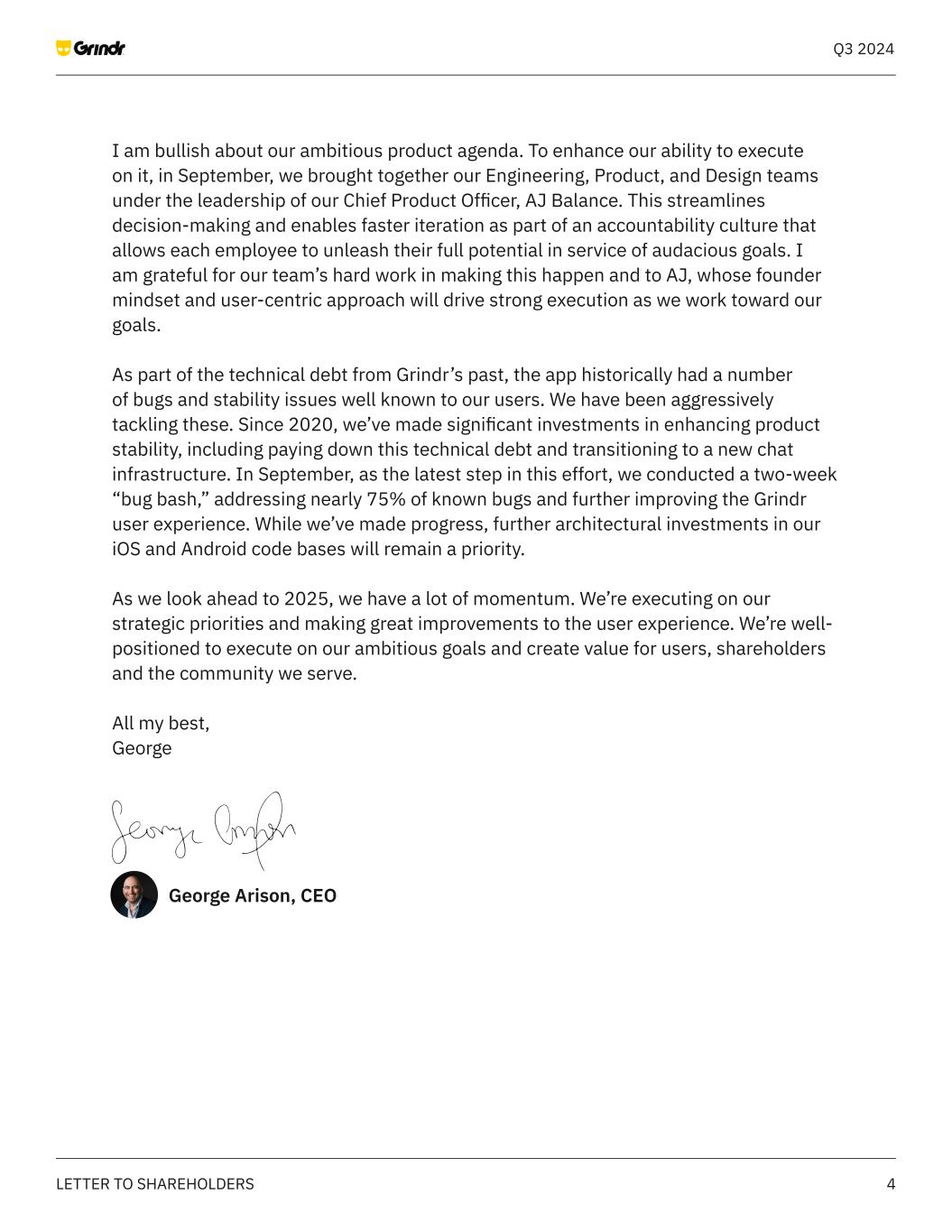 4LETTER TO SHAREHOLDERS Q3 2024 I am bullish about our ambitious product agenda. To enhance our ability to execute on it, in September, we brought together our Engineering, Product, and Design teams under the leadership of our Chief Product Officer, AJ Balance. This streamlines decision-making and enables faster iteration as part of an accountability culture that allows each employee to unleash their full potential in service of audacious goals. I am grateful for our team’s hard work in making this happen and to AJ, whose founder mindset and user-centric approach will drive strong execution as we work toward our goals. As part of the technical debt from Grindr’s past, the app historically had a number of bugs and stability issues well known to our users. We have been aggressively tackling these. Since 2020, we’ve made significant investments in enhancing product stability, including paying down this technical debt and transitioning to a new chat infrastructure. In September, as the latest step in this effort, we conducted a two-week “bug bash,” addressing nearly 75% of known bugs and further improving the Grindr user experience. While we’ve made progress, further architectural investments in our iOS and Android code bases will remain a priority. As we look ahead to 2025, we have a lot of momentum. We’re executing on our strategic priorities and making great improvements to the user experience. We’re well- positioned to execute on our ambitious goals and create value for users, shareholders and the community we serve. All my best, George George Arison, CEO