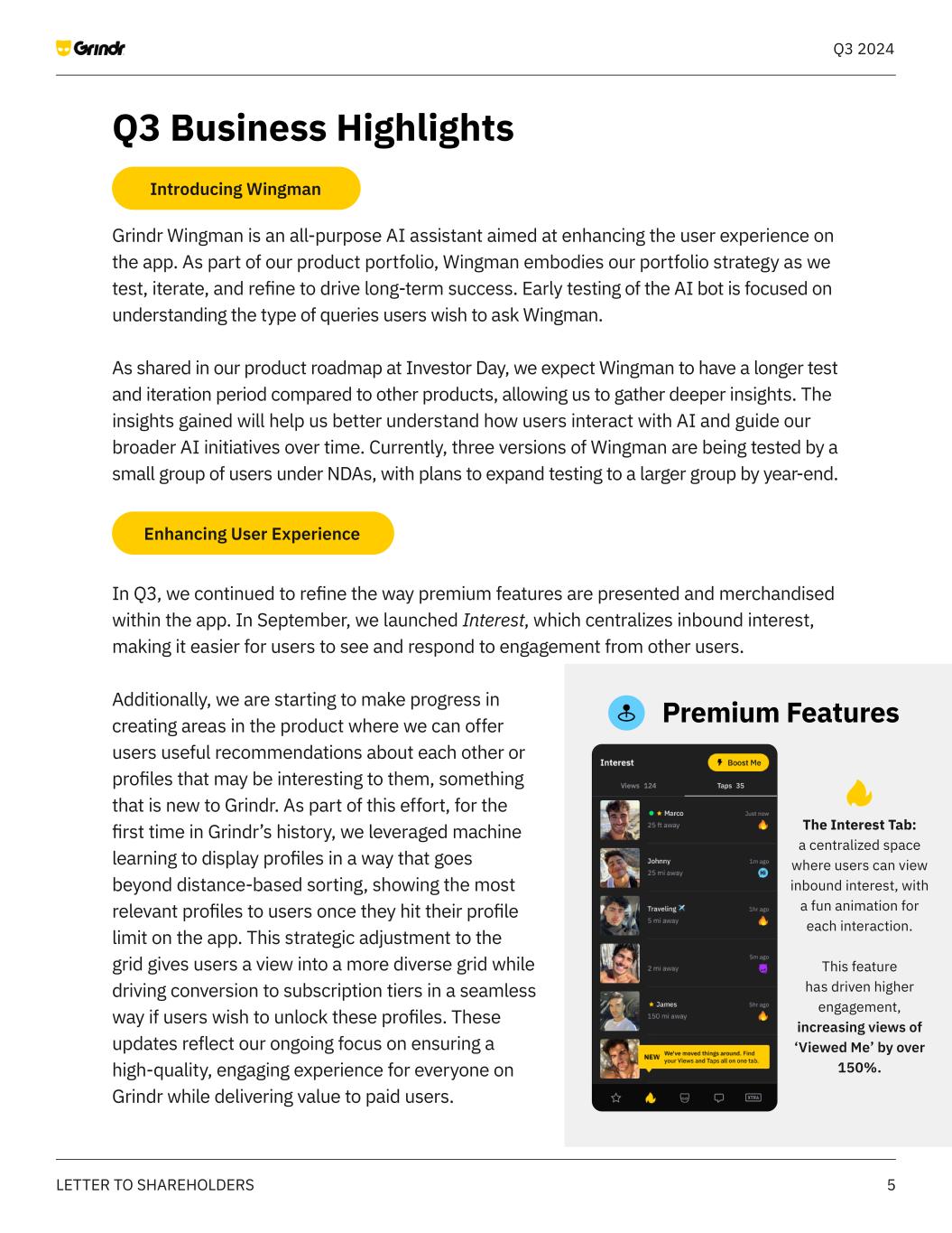 5LETTER TO SHAREHOLDERS Q3 2024 Grindr Wingman is an all-purpose AI assistant aimed at enhancing the user experience on the app. As part of our product portfolio, Wingman embodies our portfolio strategy as we test, iterate, and refine to drive long-term success. Early testing of the AI bot is focused on understanding the type of queries users wish to ask Wingman. As shared in our product roadmap at Investor Day, we expect Wingman to have a longer test and iteration period compared to other products, allowing us to gather deeper insights. The insights gained will help us better understand how users interact with AI and guide our broader AI initiatives over time. Currently, three versions of Wingman are being tested by a small group of users under NDAs, with plans to expand testing to a larger group by year-end. In Q3, we continued to refine the way premium features are presented and merchandised within the app. In September, we launched Interest, which centralizes inbound interest, making it easier for users to see and respond to engagement from other users. Additionally, we are starting to make progress in creating areas in the product where we can offer users useful recommendations about each other or profiles that may be interesting to them, something that is new to Grindr. As part of this effort, for the first time in Grindr’s history, we leveraged machine learning to display profiles in a way that goes beyond distance-based sorting, showing the most relevant profiles to users once they hit their profile limit on the app. This strategic adjustment to the grid gives users a view into a more diverse grid while driving conversion to subscription tiers in a seamless way if users wish to unlock these profiles. These updates reflect our ongoing focus on ensuring a high-quality, engaging experience for everyone on Grindr while delivering value to paid users. Introducing Wingman Enhancing User Experience Q3 Business Highlights The Interest Tab: a centralized space where users can view inbound interest, with a fun animation for each interaction. This feature has driven higher engagement, increasing views of ‘Viewed Me’ by over 150%. Premium Features