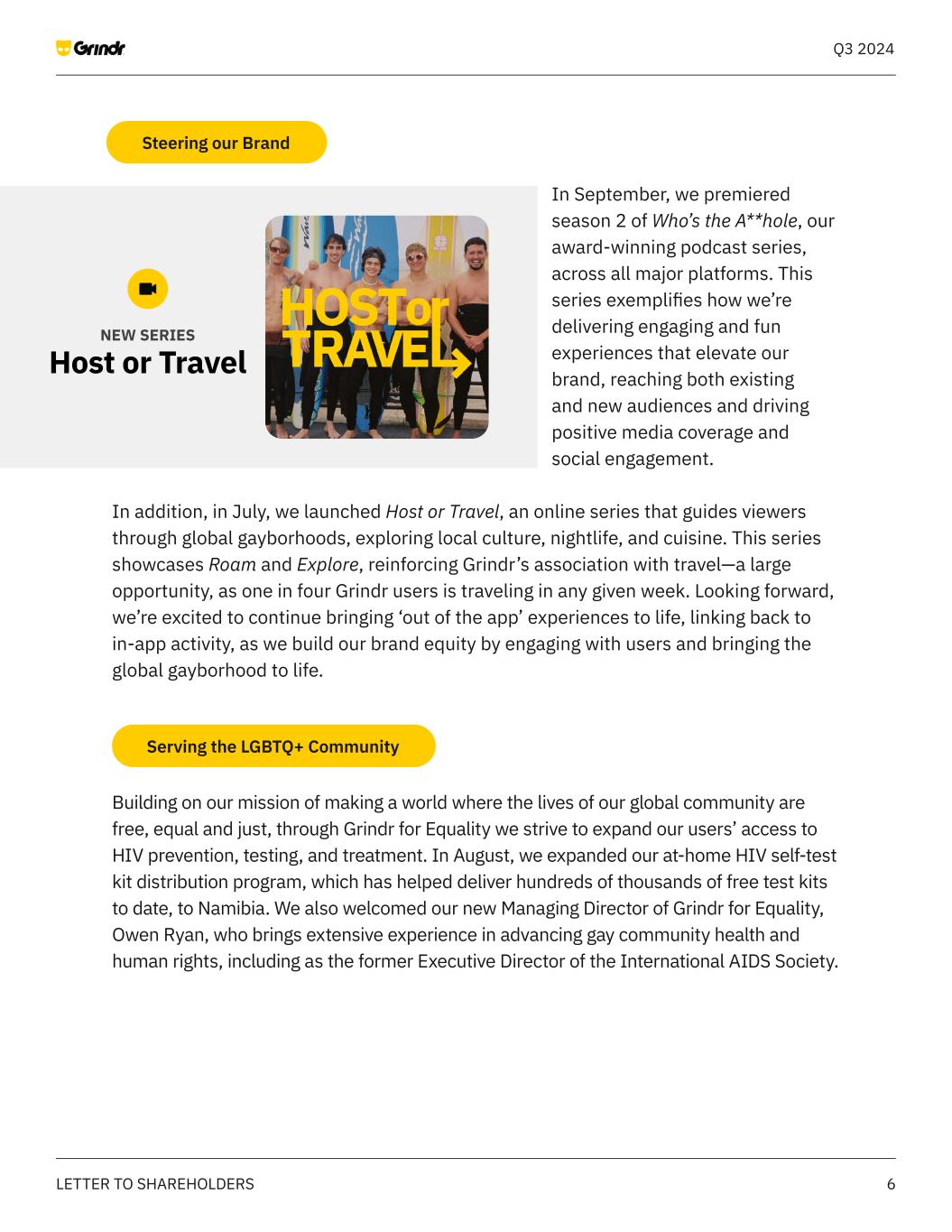 6LETTER TO SHAREHOLDERS Q3 2024 In September, we premiered season 2 of Who’s the A**hole, our award-winning podcast series, across all major platforms. This series exemplifies how we’re delivering engaging and fun experiences that elevate our brand, reaching both existing and new audiences and driving positive media coverage and social engagement. In addition, in July, we launched Host or Travel, an online series that guides viewers through global gayborhoods, exploring local culture, nightlife, and cuisine. This series showcases Roam and Explore, reinforcing Grindr’s association with travel—a large opportunity, as one in four Grindr users is traveling in any given week. Looking forward, we’re excited to continue bringing ‘out of the app’ experiences to life, linking back to in-app activity, as we build our brand equity by engaging with users and bringing the global gayborhood to life. Building on our mission of making a world where the lives of our global community are free, equal and just, through Grindr for Equality we strive to expand our users’ access to HIV prevention, testing, and treatment. In August, we expanded our at-home HIV self-test kit distribution program, which has helped deliver hundreds of thousands of free test kits to date, to Namibia. We also welcomed our new Managing Director of Grindr for Equality, Owen Ryan, who brings extensive experience in advancing gay community health and human rights, including as the former Executive Director of the International AIDS Society. Steering our Brand Host or Travel NEW SERIES Serving the LGBTQ+ Community