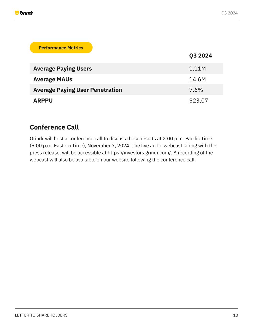 10LETTER TO SHAREHOLDERS Q3 2024 Conference Call Grindr will host a conference call to discuss these results at 2:00 p.m. Pacific Time (5:00 p.m. Eastern Time), November 7, 2024. The live audio webcast, along with the press release, will be accessible at https://investors.grindr.com/. A recording of the webcast will also be available on our website following the conference call. Average Paying Users 1.11M Q3 2024 Average Paying User Penetration 7.6% Average MAUs 14.6M ARPPU $23.07 Performance Metrics