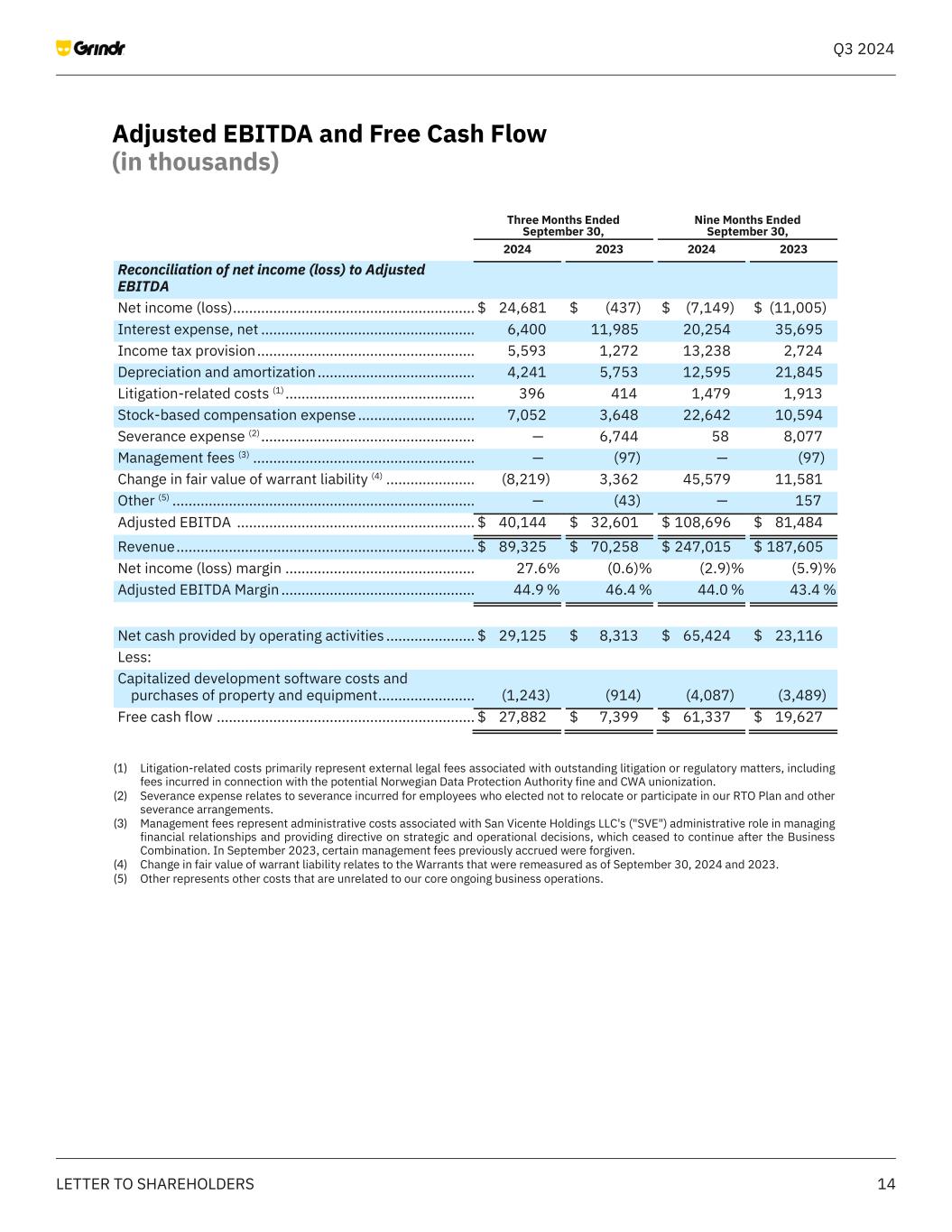 14LETTER TO SHAREHOLDERS Q3 2024 Adjusted EBITDA and Free Cash Flow (in thousands) Grindr Inc. and subsidiaries Adjusted EBITDA and Free Cash Flow (in thousands) Three Months Ended September 30, Nine Months Ended September 30, 2024 2023 2024 2023 Reconciliation of net income (loss) to Adjusted EBITDA Net income (loss) ............................................................ $ 24,681 $ (437) $ (7,149) $ (11,005) Interest expense, net ..................................................... 6,400 11,985 20,254 35,695 Income tax provision ...................................................... 5,593 1,272 13,238 2,724 Depreciation and amortization ....................................... 4,241 5,753 12,595 21,845 Litigation-related costs (1) ............................................... 396 414 1,479 1,913 Stock-based compensation expense ............................. 7,052 3,648 22,642 10,594 Severance expense (2) ..................................................... — 6,744 58 8,077 Management fees (3) ....................................................... — (97) — (97) Change in fair value of warrant liability (4) ...................... (8,219) 3,362 45,579 11,581 Other (5) ........................................................................... — (43) — 157 Adjusted EBITDA ........................................................... $ 40,144 $ 32,601 $ 108,696 $ 81,484 Revenue .......................................................................... $ 89,325 $ 70,258 $ 247,015 $ 187,605 Net income (loss) margin ............................................... 27.6% (0.6)% (2.9)% (5.9)% Adjusted EBITDA Margin ................................................ 44.9 % 46.4 % 44.0 % 43.4 % Net cash provided by operating activities ...................... $ 29,125 $ 8,313 $ 65,424 $ 23,116 Less: Capitalized development software costs and purchases of property and equipment ........................ (1,243) (914) (4,087) (3,489) Free cash flow ................................................................ $ 27,882 $ 7,399 $ 61,337 $ 19,627 (1) Litigation-related costs primarily represent external legal fees associated with outstanding litigation or regulatory matters, including fees incurred in connection with the potential Norwegian Data Protection Authority fine and CWA unionization. (2) Severance expense relates to severance incurred for employees who elected not to relocate or participate in our RTO Plan and other severance arrangements. (3) Management fees represent administrative costs associated with San Vicente Holdings LLC's ("SVE") administrative role in managing financial relationships and providing directive on strategic and operational decisions, which ceased to continue after the Business Combination. In September 2023, certain management fees previously accrued were forgiven. (4) Change in fair value of warrant liability relates to the Warrants that were remeasured as of September 30, 2024 and 2023. (5) Other represents other costs that are unrelated to our core ongoing business operations.