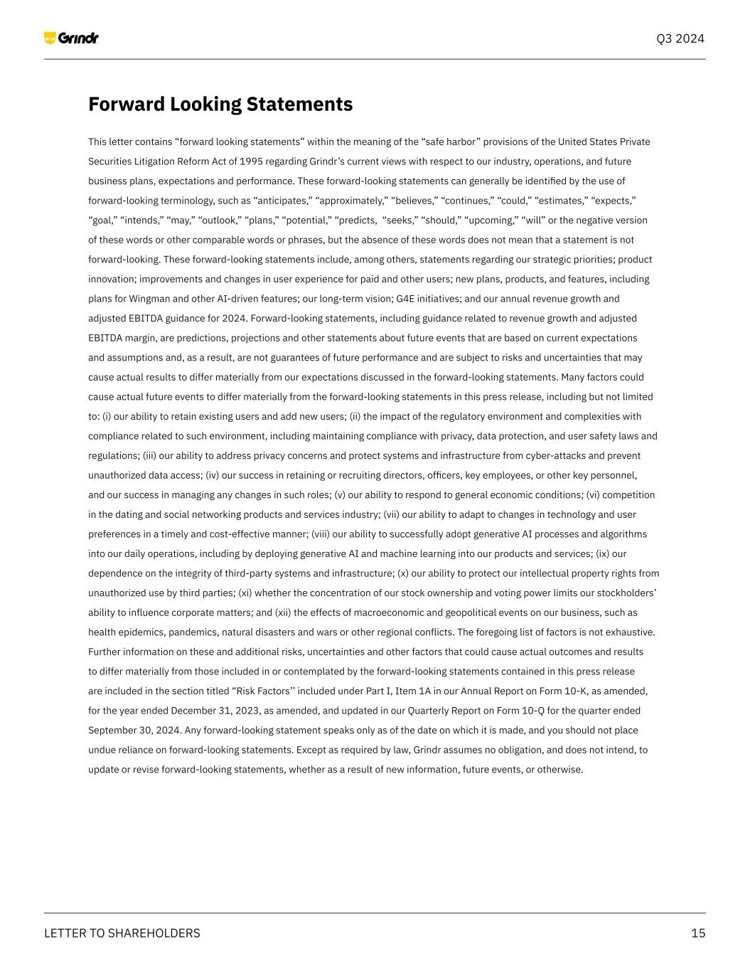 15LETTER TO SHAREHOLDERS Q3 2024 Forward Looking Statements This letter contains “forward looking statements” within the meaning of the “safe harbor” provisions of the United States Private Securities Litigation Reform Act of 1995 regarding Grindr’s current views with respect to our industry, operations, and future business plans, expectations and performance. These forward-looking statements can generally be identified by the use of forward-looking terminology, such as “anticipates,” “approximately,” “believes,” “continues,” “could,” “estimates,” “expects,” “goal,” “intends,” “may,” “outlook,” “plans,” “potential,” “predicts, “seeks,” “should,” “upcoming,” “will” or the negative version of these words or other comparable words or phrases, but the absence of these words does not mean that a statement is not forward-looking. These forward-looking statements include, among others, statements regarding our strategic priorities; product innovation; improvements and changes in user experience for paid and other users; new plans, products, and features, including plans for Wingman and other AI-driven features; our long-term vision; G4E initiatives; and our annual revenue growth and adjusted EBITDA guidance for 2024. Forward-looking statements, including guidance related to revenue growth and adjusted EBITDA margin, are predictions, projections and other statements about future events that are based on current expectations and assumptions and, as a result, are not guarantees of future performance and are subject to risks and uncertainties that may cause actual results to differ materially from our expectations discussed in the forward-looking statements. Many factors could cause actual future events to differ materially from the forward-looking statements in this press release, including but not limited to: (i) our ability to retain existing users and add new users; (ii) the impact of the regulatory environment and complexities with compliance related to such environment, including maintaining compliance with privacy, data protection, and user safety laws and regulations; (iii) our ability to address privacy concerns and protect systems and infrastructure from cyber-attacks and prevent unauthorized data access; (iv) our success in retaining or recruiting directors, officers, key employees, or other key personnel, and our success in managing any changes in such roles; (v) our ability to respond to general economic conditions; (vi) competition in the dating and social networking products and services industry; (vii) our ability to adapt to changes in technology and user preferences in a timely and cost-effective manner; (viii) our ability to successfully adopt generative AI processes and algorithms into our daily operations, including by deploying generative AI and machine learning into our products and services; (ix) our dependence on the integrity of third-party systems and infrastructure; (x) our ability to protect our intellectual property rights from unauthorized use by third parties; (xi) whether the concentration of our stock ownership and voting power limits our stockholders’ ability to influence corporate matters; and (xii) the effects of macroeconomic and geopolitical events on our business, such as health epidemics, pandemics, natural disasters and wars or other regional conflicts. The foregoing list of factors is not exhaustive. Further information on these and additional risks, uncertainties and other factors that could cause actual outcomes and results to differ materially from those included in or contemplated by the forward-looking statements contained in this press release are included in the section titled “Risk Factors’’ included under Part I, Item 1A in our Annual Report on Form 10-K, as amended, for the year ended December 31, 2023, as amended, and updated in our Quarterly Report on Form 10-Q for the quarter ended September 30, 2024. Any forward-looking statement speaks only as of the date on which it is made, and you should not place undue reliance on forward-looking statements. Except as required by law, Grindr assumes no obligation, and does not intend, to update or revise forward-looking statements, whether as a result of new information, future events, or otherwise.