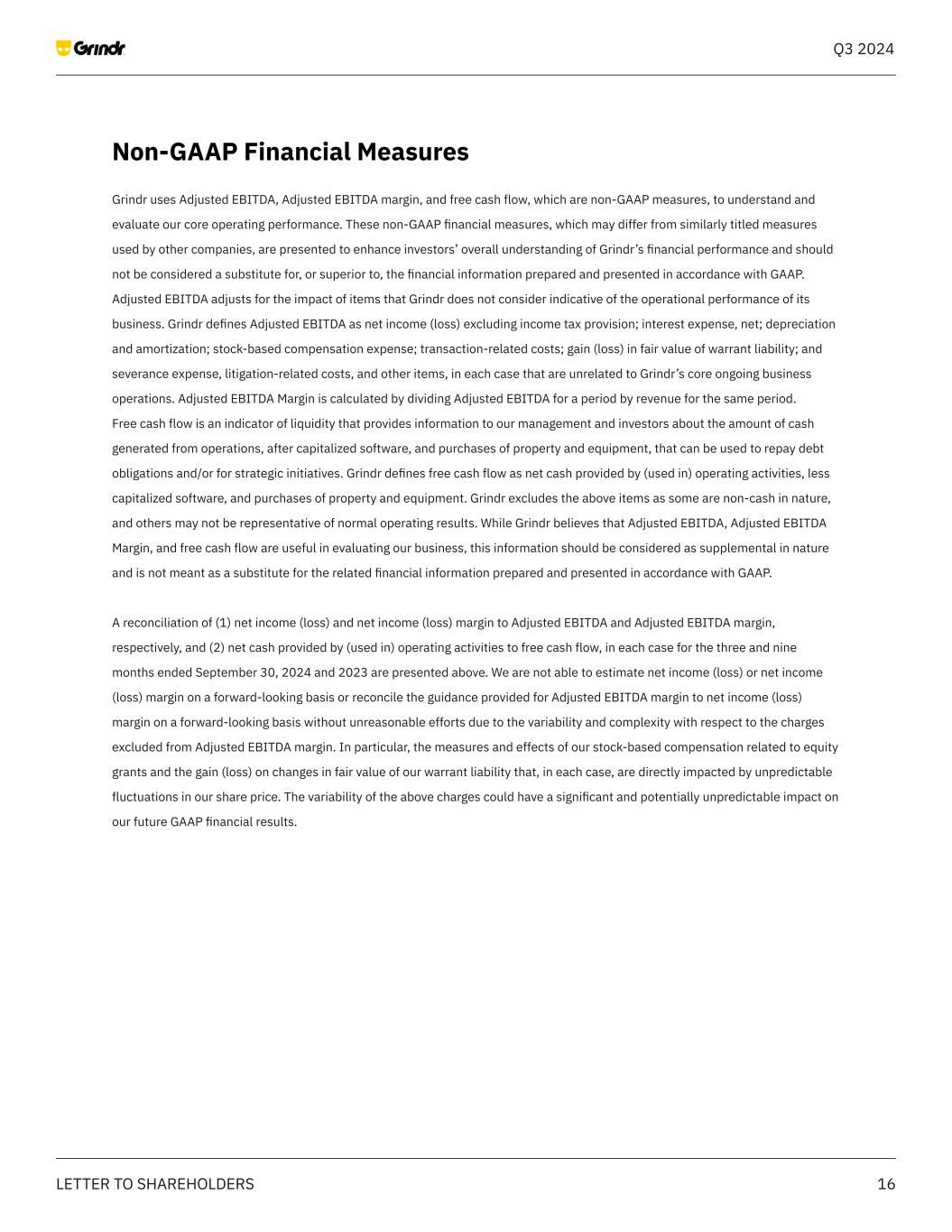 16LETTER TO SHAREHOLDERS Q3 2024 Non-GAAP Financial Measures Grindr uses Adjusted EBITDA, Adjusted EBITDA margin, and free cash flow, which are non-GAAP measures, to understand and evaluate our core operating performance. These non-GAAP financial measures, which may differ from similarly titled measures used by other companies, are presented to enhance investors’ overall understanding of Grindr’s financial performance and should not be considered a substitute for, or superior to, the financial information prepared and presented in accordance with GAAP. Adjusted EBITDA adjusts for the impact of items that Grindr does not consider indicative of the operational performance of its business. Grindr defines Adjusted EBITDA as net income (loss) excluding income tax provision; interest expense, net; depreciation and amortization; stock-based compensation expense; transaction-related costs; gain (loss) in fair value of warrant liability; and severance expense, litigation-related costs, and other items, in each case that are unrelated to Grindr’s core ongoing business operations. Adjusted EBITDA Margin is calculated by dividing Adjusted EBITDA for a period by revenue for the same period. Free cash flow is an indicator of liquidity that provides information to our management and investors about the amount of cash generated from operations, after capitalized software, and purchases of property and equipment, that can be used to repay debt obligations and/or for strategic initiatives. Grindr defines free cash flow as net cash provided by (used in) operating activities, less capitalized software, and purchases of property and equipment. Grindr excludes the above items as some are non-cash in nature, and others may not be representative of normal operating results. While Grindr believes that Adjusted EBITDA, Adjusted EBITDA Margin, and free cash flow are useful in evaluating our business, this information should be considered as supplemental in nature and is not meant as a substitute for the related financial information prepared and presented in accordance with GAAP. A reconciliation of (1) net income (loss) and net income (loss) margin to Adjusted EBITDA and Adjusted EBITDA margin, respectively, and (2) net cash provided by (used in) operating activities to free cash flow, in each case for the three and nine months ended September 30, 2024 and 2023 are presented above. We are not able to estimate net income (loss) or net income (loss) margin on a forward-looking basis or reconcile the guidance provided for Adjusted EBITDA margin to net income (loss) margin on a forward-looking basis without unreasonable efforts due to the variability and complexity with respect to the charges excluded from Adjusted EBITDA margin. In particular, the measures and effects of our stock-based compensation related to equity grants and the gain (loss) on changes in fair value of our warrant liability that, in each case, are directly impacted by unpredictable fluctuations in our share price. The variability of the above charges could have a significant and potentially unpredictable impact on our future GAAP financial results.