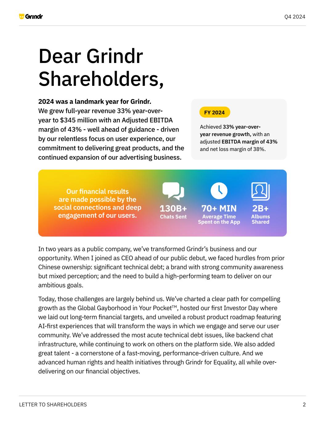 2LETTER TO SHAREHOLDERS Q4 2024 Dear Grindr Shareholders, Our financial results are made possible by the social connections and deep engagement of our users. 130B+ Chats Sent 70+ MIN Average Time Spent on the App 2B+ Albums Shared 2024 was a landmark year for Grindr. We grew full-year revenue 33% year-over- year to $345 million with an Adjusted EBITDA margin of 43% - well ahead of guidance - driven by our relentless focus on user experience, our commitment to delivering great products, and the continued expansion of our advertising business. FY 2024 Achieved 33% year-over- year revenue growth, with an adjusted EBITDA margin of 43% and net loss margin of 38%. In two years as a public company, we’ve transformed Grindr’s business and our opportunity. When I joined as CEO ahead of our public debut, we faced hurdles from prior Chinese ownership: significant technical debt; a brand with strong community awareness but mixed perception; and the need to build a high-performing team to deliver on our ambitious goals. Today, those challenges are largely behind us. We’ve charted a clear path for compelling growth as the Global Gayborhood in Your PocketTM, hosted our first Investor Day where we laid out long-term financial targets, and unveiled a robust product roadmap featuring AI-first experiences that will transform the ways in which we engage and serve our user community. We’ve addressed the most acute technical debt issues, like backend chat infrastructure, while continuing to work on others on the platform side. We also added great talent - a cornerstone of a fast-moving, performance-driven culture. And we advanced human rights and health initiatives through Grindr for Equality, all while over- delivering on our financial objectives.