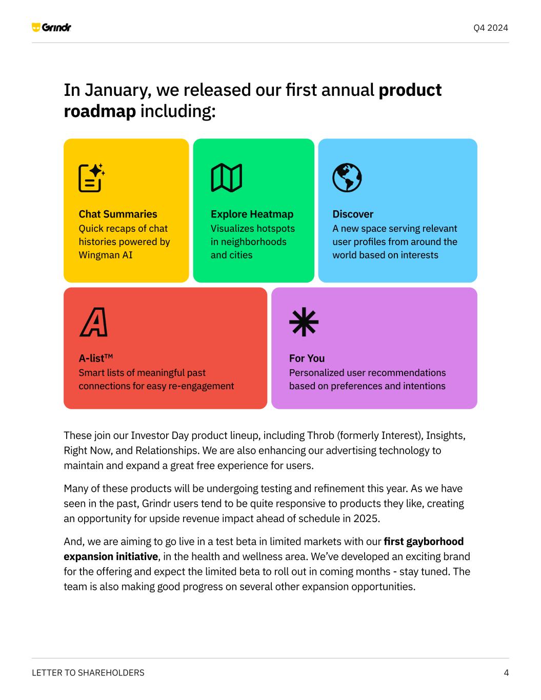 4LETTER TO SHAREHOLDERS Q4 2024 In January, we released our first annual product roadmap including: These join our Investor Day product lineup, including Throb (formerly Interest), Insights, Right Now, and Relationships. We are also enhancing our advertising technology to maintain and expand a great free experience for users. Many of these products will be undergoing testing and refinement this year. As we have seen in the past, Grindr users tend to be quite responsive to products they like, creating an opportunity for upside revenue impact ahead of schedule in 2025. And, we are aiming to go live in a test beta in limited markets with our first gayborhood expansion initiative, in the health and wellness area. We’ve developed an exciting brand for the offering and expect the limited beta to roll out in coming months - stay tuned. The team is also making good progress on several other expansion opportunities. Chat Summaries Quick recaps of chat histories powered by Wingman AI Explore Heatmap Visualizes hotspots in neighborhoods and cities Discover A new space serving relevant user profiles from around the world based on interests A-listTM Smart lists of meaningful past connections for easy re-engagement For You Personalized user recommendations based on preferences and intentions