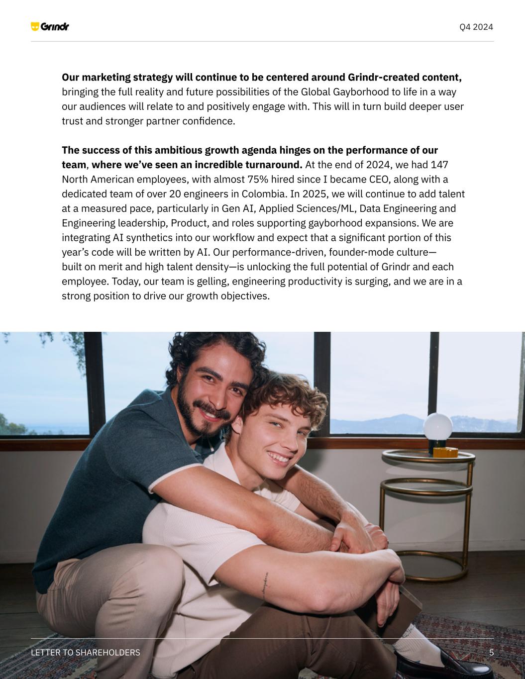 Q4 2024 5LETTER TO SHAREHOLDERS Our marketing strategy will continue to be centered around Grindr-created content, bringing the full reality and future possibilities of the Global Gayborhood to life in a way our audiences will relate to and positively engage with. This will in turn build deeper user trust and stronger partner confidence. The success of this ambitious growth agenda hinges on the performance of our team, where we’ve seen an incredible turnaround. At the end of 2024, we had 147 North American employees, with almost 75% hired since I became CEO, along with a dedicated team of over 20 engineers in Colombia. In 2025, we will continue to add talent at a measured pace, particularly in Gen AI, Applied Sciences/ML, Data Engineering and Engineering leadership, Product, and roles supporting gayborhood expansions. We are integrating AI synthetics into our workflow and expect that a significant portion of this year’s code will be written by AI. Our performance-driven, founder-mode culture— built on merit and high talent density—is unlocking the full potential of Grindr and each employee. Today, our team is gelling, engineering productivity is surging, and we are in a strong position to drive our growth objectives.