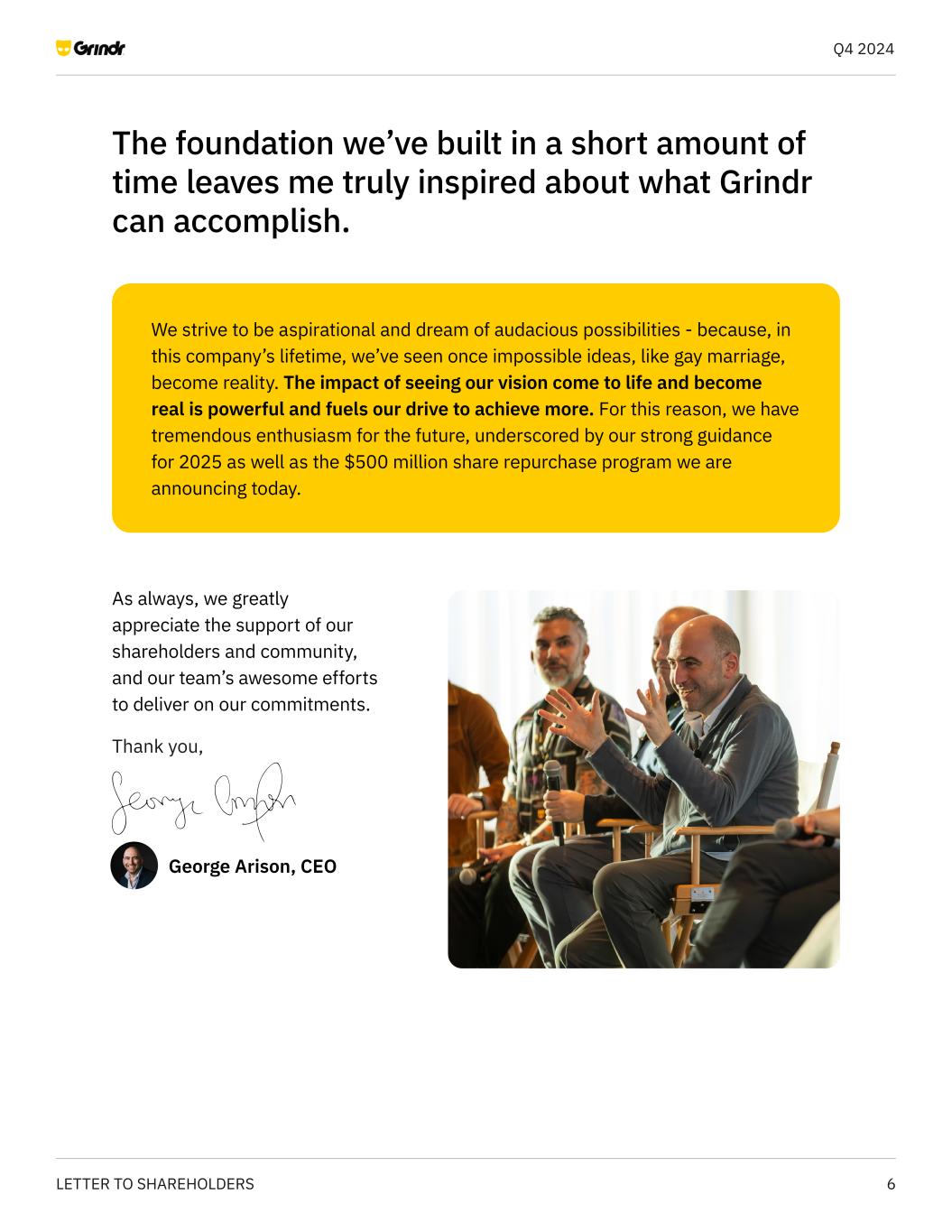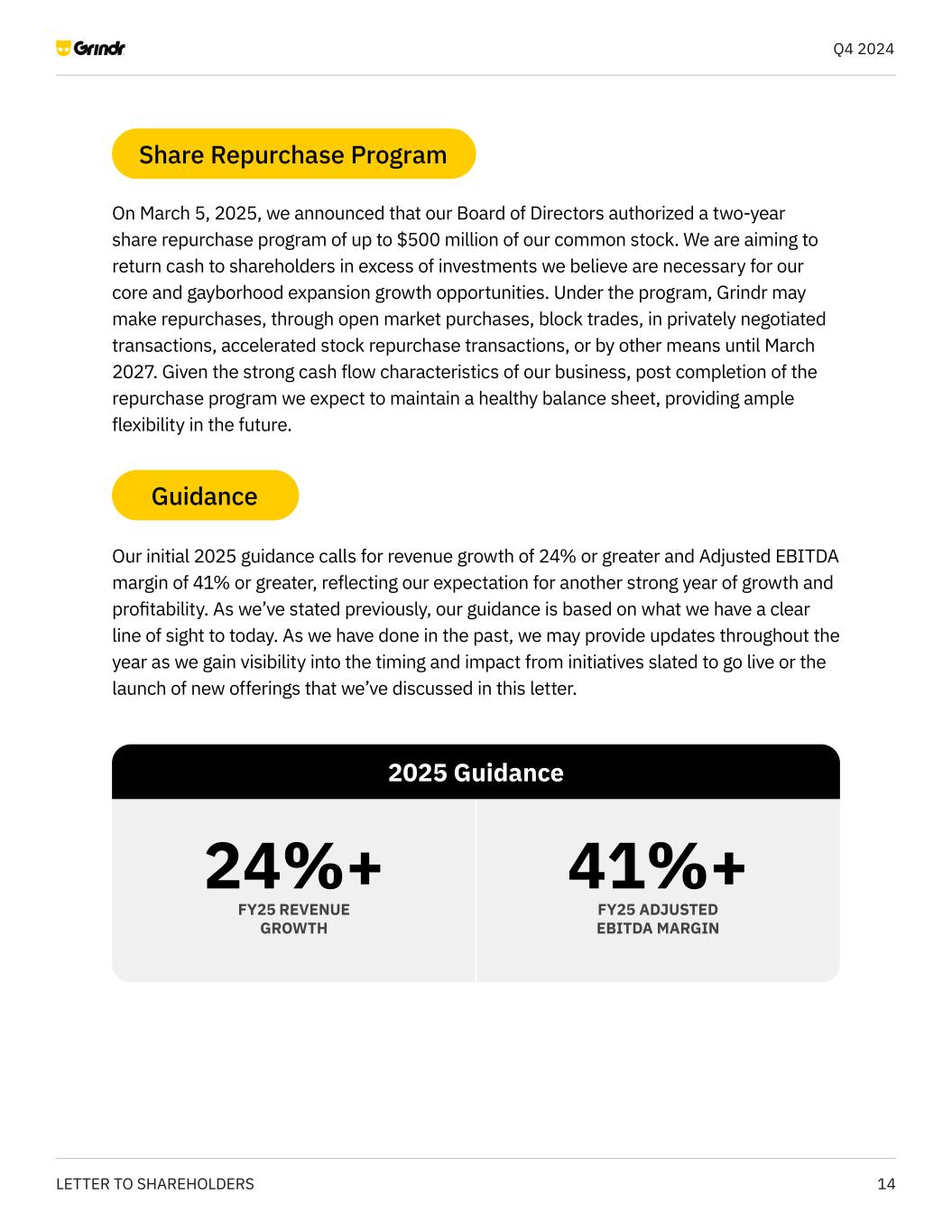 14LETTER TO SHAREHOLDERS Q4 2024 On March 5, 2025, we announced that our Board of Directors authorized a two-year share repurchase program of up to $500 million of our common stock. We are aiming to return cash to shareholders in excess of investments we believe are necessary for our core and gayborhood expansion growth opportunities. Under the program, Grindr may make repurchases, through open market purchases, block trades, in privately negotiated transactions, accelerated stock repurchase transactions, or by other means until March 2027. Given the strong cash flow characteristics of our business, post completion of the repurchase program we expect to maintain a healthy balance sheet, providing ample flexibility in the future. Our initial 2025 guidance calls for revenue growth of 24% or greater and Adjusted EBITDA margin of 41% or greater, reflecting our expectation for another strong year of growth and profitability. As we’ve stated previously, our guidance is based on what we have a clear line of sight to today. As we have done in the past, we may provide updates throughout the year as we gain visibility into the timing and impact from initiatives slated to go live or the launch of new offerings that we’ve discussed in this letter. Share Repurchase Program Guidance 24%+ 41%+ 2025 Guidance FY25 REVENUE GROWTH FY25 ADJUSTED EBITDA MARGIN