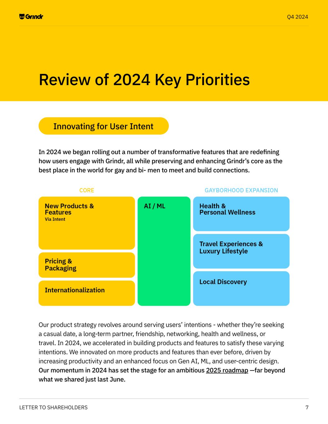 7LETTER TO SHAREHOLDERS Q4 2024 In 2024 we began rolling out a number of transformative features that are redefining how users engage with Grindr, all while preserving and enhancing Grindr’s core as the best place in the world for gay and bi- men to meet and build connections. Innovating for User Intent Our product strategy revolves around serving users’ intentions - whether they’re seeking a casual date, a long-term partner, friendship, networking, health and wellness, or travel. In 2024, we accelerated in building products and features to satisfy these varying intentions. We innovated on more products and features than ever before, driven by increasing productivity and an enhanced focus on Gen AI, ML, and user-centric design. Our momentum in 2024 has set the stage for an ambitious 2025 roadmap —far beyond what we shared just last June. Review of 2024 Key Priorities