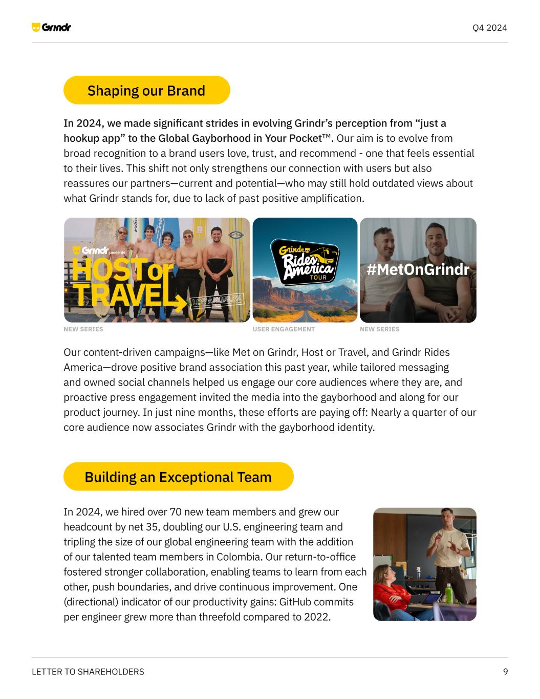 9LETTER TO SHAREHOLDERS Q4 2024 In 2024, we hired over 70 new team members and grew our headcount by net 35, doubling our U.S. engineering team and tripling the size of our global engineering team with the addition of our talented team members in Colombia. Our return-to-office fostered stronger collaboration, enabling teams to learn from each other, push boundaries, and drive continuous improvement. One (directional) indicator of our productivity gains: GitHub commits per engineer grew more than threefold compared to 2022. In 2024, we made significant strides in evolving Grindr’s perception from “just a hookup app” to the Global Gayborhood in Your PocketTM. Our aim is to evolve from broad recognition to a brand users love, trust, and recommend - one that feels essential to their lives. This shift not only strengthens our connection with users but also reassures our partners—current and potential—who may still hold outdated views about what Grindr stands for, due to lack of past positive amplification. NEW SERIES USER ENGAGEMENT NEW SERIES Our content-driven campaigns—like Met on Grindr, Host or Travel, and Grindr Rides America—drove positive brand association this past year, while tailored messaging and owned social channels helped us engage our core audiences where they are, and proactive press engagement invited the media into the gayborhood and along for our product journey. In just nine months, these efforts are paying off: Nearly a quarter of our core audience now associates Grindr with the gayborhood identity. Shaping our Brand Building an Exceptional Team