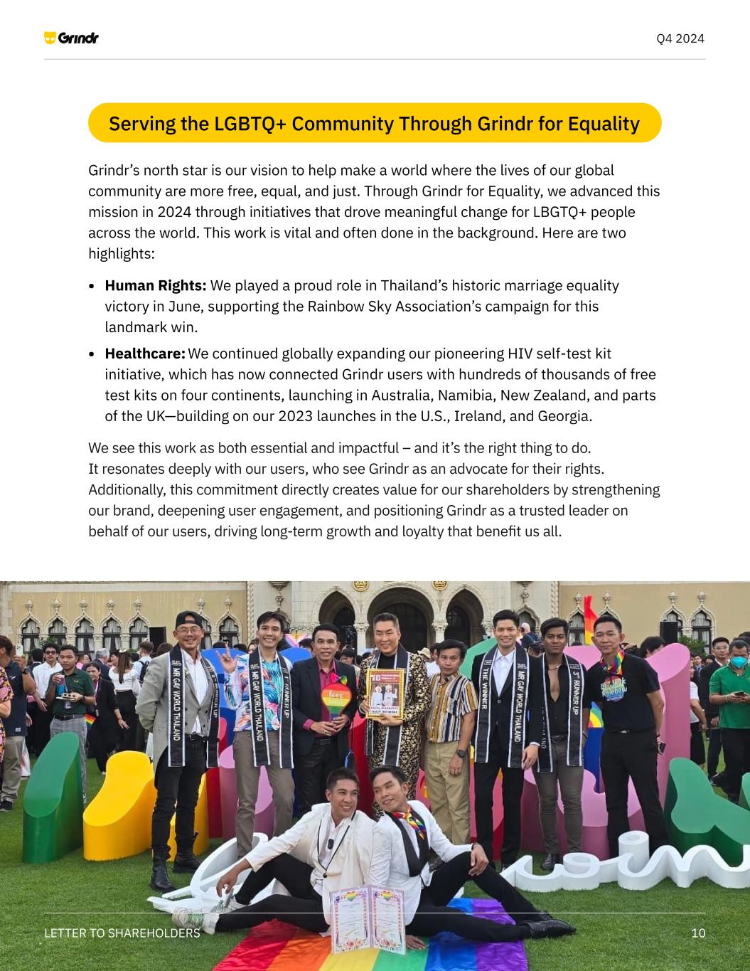 10LETTER TO SHAREHOLDERS Q4 2024 Grindr’s north star is our vision to help make a world where the lives of our global community are more free, equal, and just. Through Grindr for Equality, we advanced this mission in 2024 through initiatives that drove meaningful change for LBGTQ+ people across the world. This work is vital and often done in the background. Here are two highlights: • Human Rights: We played a proud role in Thailand’s historic marriage equality victory in June, supporting the Rainbow Sky Association’s campaign for this landmark win. • Healthcare: We continued globally expanding our pioneering HIV self-test kit initiative, which has now connected Grindr users with hundreds of thousands of free test kits on four continents, launching in Australia, Namibia, New Zealand, and parts of the UK—building on our 2023 launches in the U.S., Ireland, and Georgia. We see this work as both essential and impactful – and it’s the right thing to do. It resonates deeply with our users, who see Grindr as an advocate for their rights. Additionally, this commitment directly creates value for our shareholders by strengthening our brand, deepening user engagement, and positioning Grindr as a trusted leader on behalf of our users, driving long-term growth and loyalty that benefit us all. Serving the LGBTQ+ Community Through Grindr for Equality