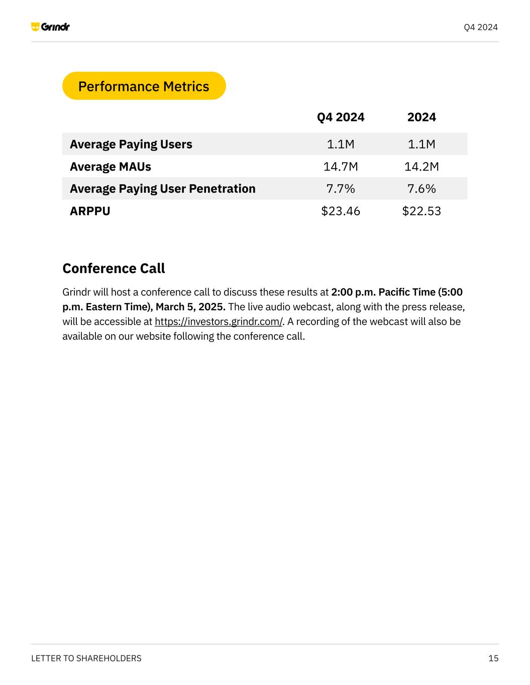 15LETTER TO SHAREHOLDERS Q4 2024 Average Paying Users 1.1M 2024 Average Paying User Penetration 7.6% Average MAUs 14.2M ARPPU $22.53 1.1M Q4 2024 7.7% 14.7M $23.46 Conference Call Grindr will host a conference call to discuss these results at 2:00 p.m. Pacific Time (5:00 p.m. Eastern Time), March 5, 2025. The live audio webcast, along with the press release, will be accessible at https://investors.grindr.com/. A recording of the webcast will also be available on our website following the conference call. Performance Metrics