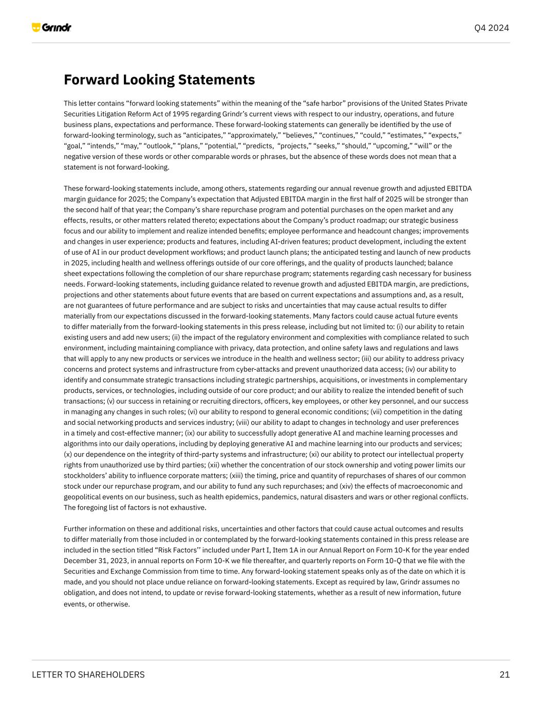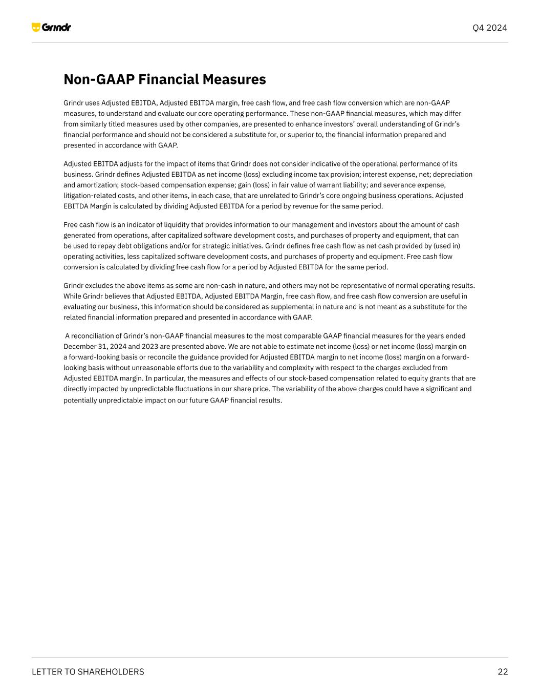22LETTER TO SHAREHOLDERS Q4 2024 Non-GAAP Financial Measures Grindr uses Adjusted EBITDA, Adjusted EBITDA margin, free cash flow, and free cash flow conversion which are non-GAAP measures, to understand and evaluate our core operating performance. These non-GAAP financial measures, which may differ from similarly titled measures used by other companies, are presented to enhance investors’ overall understanding of Grindr’s financial performance and should not be considered a substitute for, or superior to, the financial information prepared and presented in accordance with GAAP. Adjusted EBITDA adjusts for the impact of items that Grindr does not consider indicative of the operational performance of its business. Grindr defines Adjusted EBITDA as net income (loss) excluding income tax provision; interest expense, net; depreciation and amortization; stock-based compensation expense; gain (loss) in fair value of warrant liability; and severance expense, litigation-related costs, and other items, in each case, that are unrelated to Grindr’s core ongoing business operations. Adjusted EBITDA Margin is calculated by dividing Adjusted EBITDA for a period by revenue for the same period. Free cash flow is an indicator of liquidity that provides information to our management and investors about the amount of cash generated from operations, after capitalized software development costs, and purchases of property and equipment, that can be used to repay debt obligations and/or for strategic initiatives. Grindr defines free cash flow as net cash provided by (used in) operating activities, less capitalized software development costs, and purchases of property and equipment. Free cash flow conversion is calculated by dividing free cash flow for a period by Adjusted EBITDA for the same period. Grindr excludes the above items as some are non-cash in nature, and others may not be representative of normal operating results. While Grindr believes that Adjusted EBITDA, Adjusted EBITDA Margin, free cash flow, and free cash flow conversion are useful in evaluating our business, this information should be considered as supplemental in nature and is not meant as a substitute for the related financial information prepared and presented in accordance with GAAP. A reconciliation of Grindr’s non-GAAP financial measures to the most comparable GAAP financial measures for the years ended December 31, 2024 and 2023 are presented above. We are not able to estimate net income (loss) or net income (loss) margin on a forward-looking basis or reconcile the guidance provided for Adjusted EBITDA margin to net income (loss) margin on a forward- looking basis without unreasonable efforts due to the variability and complexity with respect to the charges excluded from Adjusted EBITDA margin. In particular, the measures and effects of our stock-based compensation related to equity grants that are directly impacted by unpredictable fluctuations in our share price. The variability of the above charges could have a significant and potentially unpredictable impact on our future GAAP financial results.