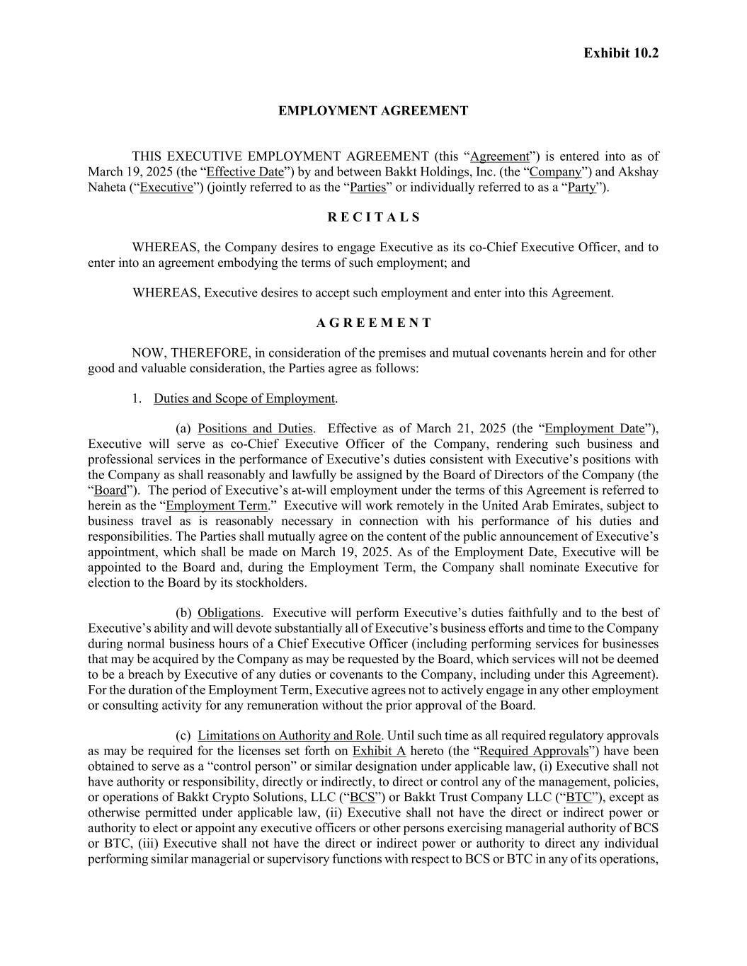 Exhibit 10.2 EMPLOYMENT AGREEMENT THIS EXECUTIVE EMPLOYMENT AGREEMENT (this “Agreement”) is entered into as of March 19, 2025 (the “Effective Date”) by and between Bakkt Holdings, Inc. (the “Company”) and Akshay Naheta (“Executive”) (jointly referred to as the “Parties” or individually referred to as a “Party”). R E C I T A L S WHEREAS, the Company desires to engage Executive as its co-Chief Executive Officer, and to enter into an agreement embodying the terms of such employment; and WHEREAS, Executive desires to accept such employment and enter into this Agreement. A G R E E M E N T NOW, THEREFORE, in consideration of the premises and mutual covenants herein and for other good and valuable consideration, the Parties agree as follows: 1. Duties and Scope of Employment. (a) Positions and Duties. Effective as of March 21, 2025 (the “Employment Date”), Executive will serve as co-Chief Executive Officer of the Company, rendering such business and professional services in the performance of Executive’s duties consistent with Executive’s positions with the Company as shall reasonably and lawfully be assigned by the Board of Directors of the Company (the “Board”). The period of Executive’s at-will employment under the terms of this Agreement is referred to herein as the “Employment Term.” Executive will work remotely in the United Arab Emirates, subject to business travel as is reasonably necessary in connection with his performance of his duties and responsibilities. The Parties shall mutually agree on the content of the public announcement of Executive’s appointment, which shall be made on March 19, 2025. As of the Employment Date, Executive will be appointed to the Board and, during the Employment Term, the Company shall nominate Executive for election to the Board by its stockholders. (b) Obligations. Executive will perform Executive’s duties faithfully and to the best of Executive’s ability and will devote substantially all of Executive’s business efforts and time to the Company during normal business hours of a Chief Executive Officer (including performing services for businesses that may be acquired by the Company as may be requested by the Board, which services will not be deemed to be a breach by Executive of any duties or covenants to the Company, including under this Agreement). For the duration of the Employment Term, Executive agrees not to actively engage in any other employment or consulting activity for any remuneration without the prior approval of the Board. (c) Limitations on Authority and Role. Until such time as all required regulatory approvals as may be required for the licenses set forth on Exhibit A hereto (the “Required Approvals”) have been obtained to serve as a “control person” or similar designation under applicable law, (i) Executive shall not have authority or responsibility, directly or indirectly, to direct or control any of the management, policies, or operations of Bakkt Crypto Solutions, LLC (“BCS”) or Bakkt Trust Company LLC (“BTC”), except as otherwise permitted under applicable law, (ii) Executive shall not have the direct or indirect power or authority to elect or appoint any executive officers or other persons exercising managerial authority of BCS or BTC, (iii) Executive shall not have the direct or indirect power or authority to direct any individual performing similar managerial or supervisory functions with respect to BCS or BTC in any of its operations,