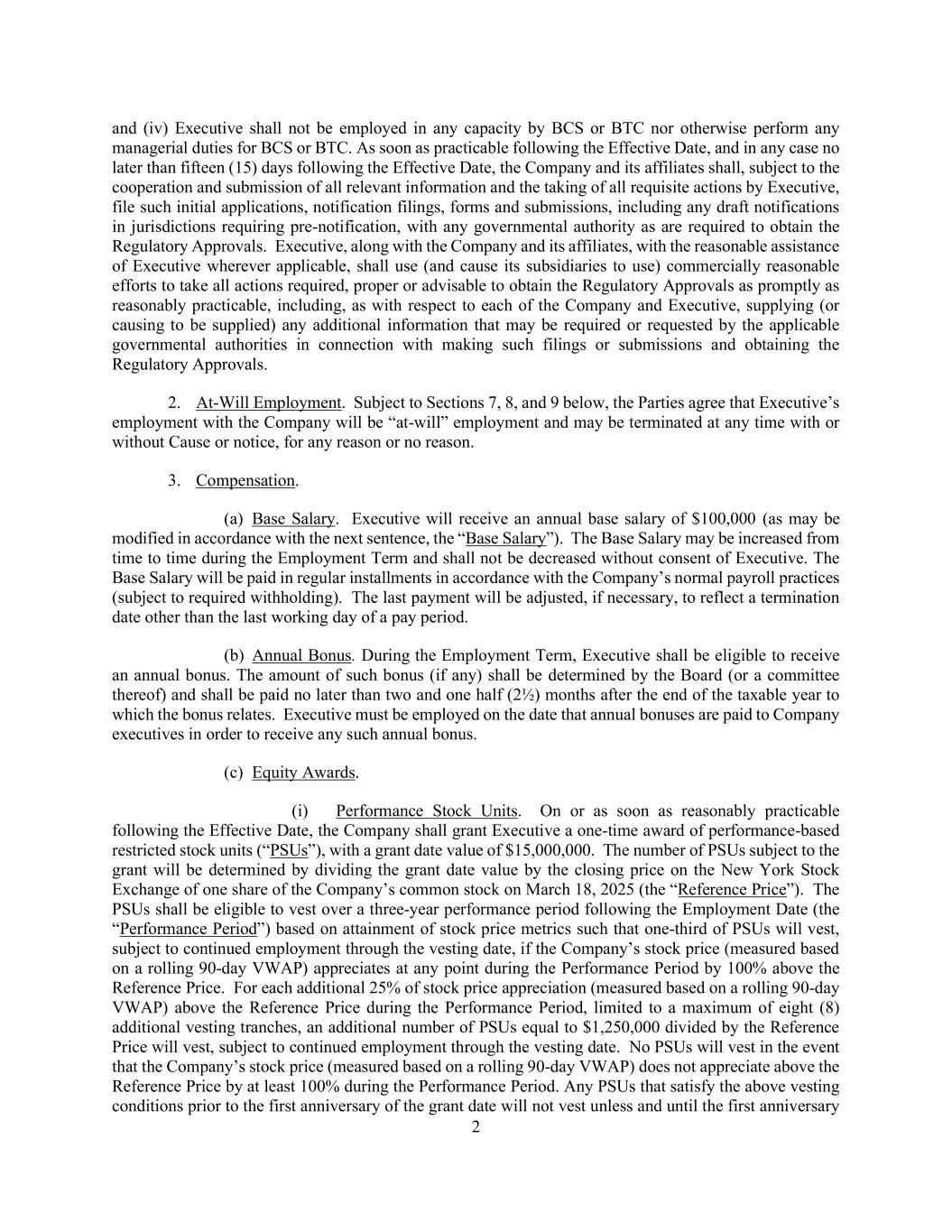 2 and (iv) Executive shall not be employed in any capacity by BCS or BTC nor otherwise perform any managerial duties for BCS or BTC. As soon as practicable following the Effective Date, and in any case no later than fifteen (15) days following the Effective Date, the Company and its affiliates shall, subject to the cooperation and submission of all relevant information and the taking of all requisite actions by Executive, file such initial applications, notification filings, forms and submissions, including any draft notifications in jurisdictions requiring pre-notification, with any governmental authority as are required to obtain the Regulatory Approvals. Executive, along with the Company and its affiliates, with the reasonable assistance of Executive wherever applicable, shall use (and cause its subsidiaries to use) commercially reasonable efforts to take all actions required, proper or advisable to obtain the Regulatory Approvals as promptly as reasonably practicable, including, as with respect to each of the Company and Executive, supplying (or causing to be supplied) any additional information that may be required or requested by the applicable governmental authorities in connection with making such filings or submissions and obtaining the Regulatory Approvals. 2. At-Will Employment. Subject to Sections 7, 8, and 9 below, the Parties agree that Executive’s employment with the Company will be “at-will” employment and may be terminated at any time with or without Cause or notice, for any reason or no reason. 3. Compensation. (a) Base Salary. Executive will receive an annual base salary of $100,000 (as may be modified in accordance with the next sentence, the “Base Salary”). The Base Salary may be increased from time to time during the Employment Term and shall not be decreased without consent of Executive. The Base Salary will be paid in regular installments in accordance with the Company’s normal payroll practices (subject to required withholding). The last payment will be adjusted, if necessary, to reflect a termination date other than the last working day of a pay period. (b) Annual Bonus. During the Employment Term, Executive shall be eligible to receive an annual bonus. The amount of such bonus (if any) shall be determined by the Board (or a committee thereof) and shall be paid no later than two and one half (2½) months after the end of the taxable year to which the bonus relates. Executive must be employed on the date that annual bonuses are paid to Company executives in order to receive any such annual bonus. (c) Equity Awards. (i) Performance Stock Units. On or as soon as reasonably practicable following the Effective Date, the Company shall grant Executive a one-time award of performance-based restricted stock units (“PSUs”), with a grant date value of $15,000,000. The number of PSUs subject to the grant will be determined by dividing the grant date value by the closing price on the New York Stock Exchange of one share of the Company’s common stock on March 18, 2025 (the “Reference Price”). The PSUs shall be eligible to vest over a three-year performance period following the Employment Date (the “Performance Period”) based on attainment of stock price metrics such that one-third of PSUs will vest, subject to continued employment through the vesting date, if the Company’s stock price (measured based on a rolling 90-day VWAP) appreciates at any point during the Performance Period by 100% above the Reference Price. For each additional 25% of stock price appreciation (measured based on a rolling 90-day VWAP) above the Reference Price during the Performance Period, limited to a maximum of eight (8) additional vesting tranches, an additional number of PSUs equal to $1,250,000 divided by the Reference Price will vest, subject to continued employment through the vesting date. No PSUs will vest in the event that the Company’s stock price (measured based on a rolling 90-day VWAP) does not appreciate above the Reference Price by at least 100% during the Performance Period. Any PSUs that satisfy the above vesting conditions prior to the first anniversary of the grant date will not vest unless and until the first anniversary