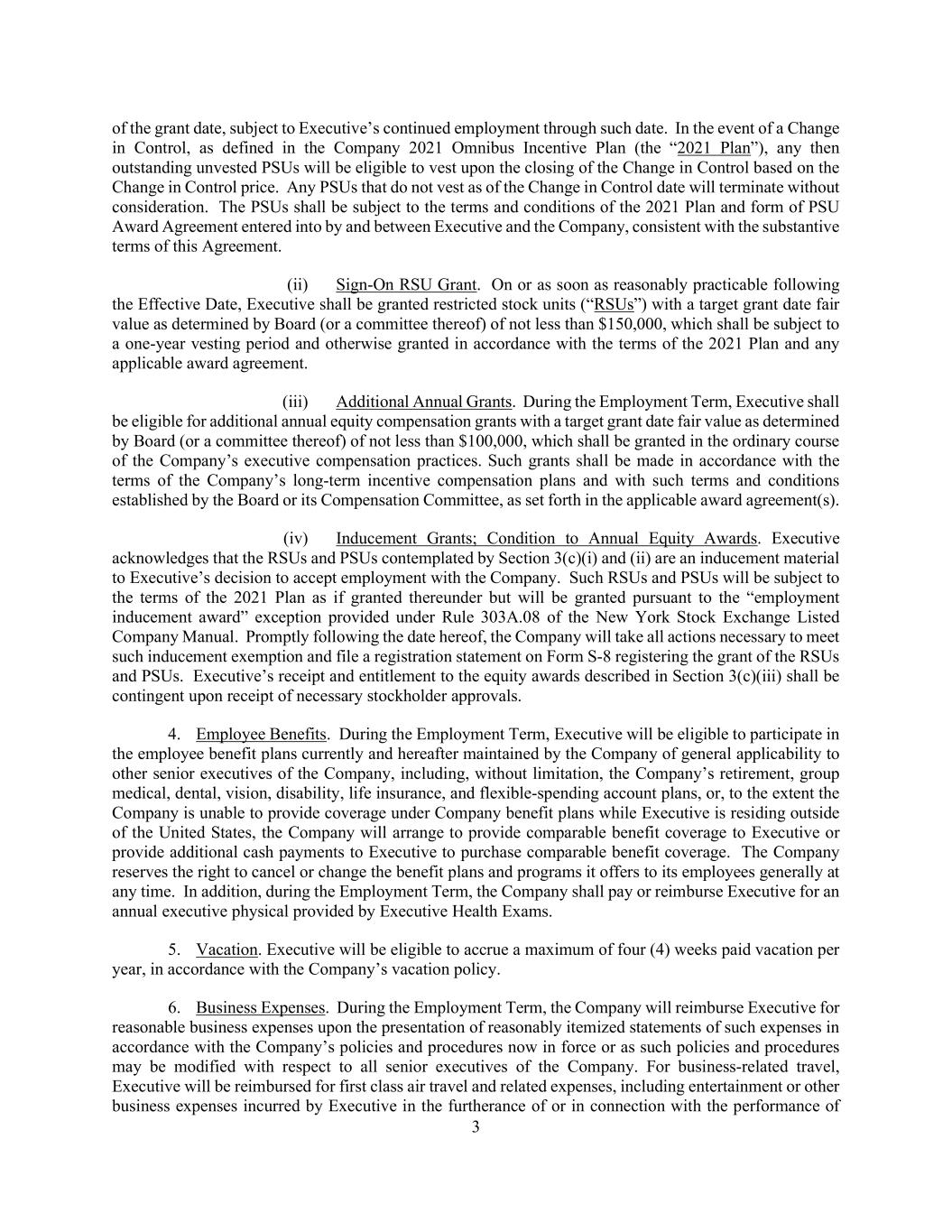 3 of the grant date, subject to Executive’s continued employment through such date. In the event of a Change in Control, as defined in the Company 2021 Omnibus Incentive Plan (the “2021 Plan”), any then outstanding unvested PSUs will be eligible to vest upon the closing of the Change in Control based on the Change in Control price. Any PSUs that do not vest as of the Change in Control date will terminate without consideration. The PSUs shall be subject to the terms and conditions of the 2021 Plan and form of PSU Award Agreement entered into by and between Executive and the Company, consistent with the substantive terms of this Agreement. (ii) Sign-On RSU Grant. On or as soon as reasonably practicable following the Effective Date, Executive shall be granted restricted stock units (“RSUs”) with a target grant date fair value as determined by Board (or a committee thereof) of not less than $150,000, which shall be subject to a one-year vesting period and otherwise granted in accordance with the terms of the 2021 Plan and any applicable award agreement. (iii) Additional Annual Grants. During the Employment Term, Executive shall be eligible for additional annual equity compensation grants with a target grant date fair value as determined by Board (or a committee thereof) of not less than $100,000, which shall be granted in the ordinary course of the Company’s executive compensation practices. Such grants shall be made in accordance with the terms of the Company’s long-term incentive compensation plans and with such terms and conditions established by the Board or its Compensation Committee, as set forth in the applicable award agreement(s). (iv) Inducement Grants; Condition to Annual Equity Awards. Executive acknowledges that the RSUs and PSUs contemplated by Section 3(c)(i) and (ii) are an inducement material to Executive’s decision to accept employment with the Company. Such RSUs and PSUs will be subject to the terms of the 2021 Plan as if granted thereunder but will be granted pursuant to the “employment inducement award” exception provided under Rule 303A.08 of the New York Stock Exchange Listed Company Manual. Promptly following the date hereof, the Company will take all actions necessary to meet such inducement exemption and file a registration statement on Form S-8 registering the grant of the RSUs and PSUs. Executive’s receipt and entitlement to the equity awards described in Section 3(c)(iii) shall be contingent upon receipt of necessary stockholder approvals. 4. Employee Benefits. During the Employment Term, Executive will be eligible to participate in the employee benefit plans currently and hereafter maintained by the Company of general applicability to other senior executives of the Company, including, without limitation, the Company’s retirement, group medical, dental, vision, disability, life insurance, and flexible-spending account plans, or, to the extent the Company is unable to provide coverage under Company benefit plans while Executive is residing outside of the United States, the Company will arrange to provide comparable benefit coverage to Executive or provide additional cash payments to Executive to purchase comparable benefit coverage. The Company reserves the right to cancel or change the benefit plans and programs it offers to its employees generally at any time. In addition, during the Employment Term, the Company shall pay or reimburse Executive for an annual executive physical provided by Executive Health Exams. 5. Vacation. Executive will be eligible to accrue a maximum of four (4) weeks paid vacation per year, in accordance with the Company’s vacation policy. 6. Business Expenses. During the Employment Term, the Company will reimburse Executive for reasonable business expenses upon the presentation of reasonably itemized statements of such expenses in accordance with the Company’s policies and procedures now in force or as such policies and procedures may be modified with respect to all senior executives of the Company. For business-related travel, Executive will be reimbursed for first class air travel and related expenses, including entertainment or other business expenses incurred by Executive in the furtherance of or in connection with the performance of