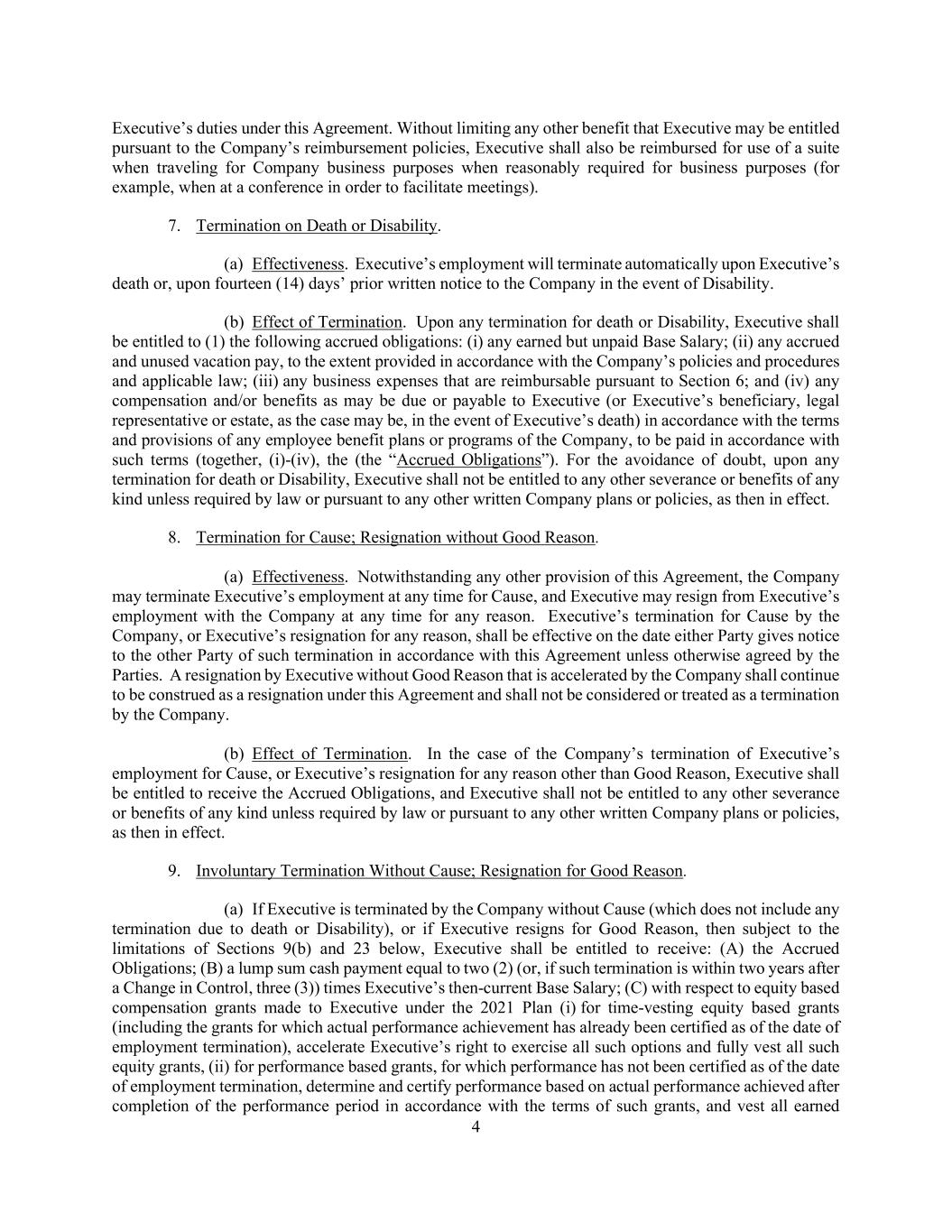 4 Executive’s duties under this Agreement. Without limiting any other benefit that Executive may be entitled pursuant to the Company’s reimbursement policies, Executive shall also be reimbursed for use of a suite when traveling for Company business purposes when reasonably required for business purposes (for example, when at a conference in order to facilitate meetings). 7. Termination on Death or Disability. (a) Effectiveness. Executive’s employment will terminate automatically upon Executive’s death or, upon fourteen (14) days’ prior written notice to the Company in the event of Disability. (b) Effect of Termination. Upon any termination for death or Disability, Executive shall be entitled to (1) the following accrued obligations: (i) any earned but unpaid Base Salary; (ii) any accrued and unused vacation pay, to the extent provided in accordance with the Company’s policies and procedures and applicable law; (iii) any business expenses that are reimbursable pursuant to Section 6; and (iv) any compensation and/or benefits as may be due or payable to Executive (or Executive’s beneficiary, legal representative or estate, as the case may be, in the event of Executive’s death) in accordance with the terms and provisions of any employee benefit plans or programs of the Company, to be paid in accordance with such terms (together, (i)-(iv), the (the “Accrued Obligations”). For the avoidance of doubt, upon any termination for death or Disability, Executive shall not be entitled to any other severance or benefits of any kind unless required by law or pursuant to any other written Company plans or policies, as then in effect. 8. Termination for Cause; Resignation without Good Reason. (a) Effectiveness. Notwithstanding any other provision of this Agreement, the Company may terminate Executive’s employment at any time for Cause, and Executive may resign from Executive’s employment with the Company at any time for any reason. Executive’s termination for Cause by the Company, or Executive’s resignation for any reason, shall be effective on the date either Party gives notice to the other Party of such termination in accordance with this Agreement unless otherwise agreed by the Parties. A resignation by Executive without Good Reason that is accelerated by the Company shall continue to be construed as a resignation under this Agreement and shall not be considered or treated as a termination by the Company. (b) Effect of Termination. In the case of the Company’s termination of Executive’s employment for Cause, or Executive’s resignation for any reason other than Good Reason, Executive shall be entitled to receive the Accrued Obligations, and Executive shall not be entitled to any other severance or benefits of any kind unless required by law or pursuant to any other written Company plans or policies, as then in effect. 9. Involuntary Termination Without Cause; Resignation for Good Reason. (a) If Executive is terminated by the Company without Cause (which does not include any termination due to death or Disability), or if Executive resigns for Good Reason, then subject to the limitations of Sections 9(b) and 23 below, Executive shall be entitled to receive: (A) the Accrued Obligations; (B) a lump sum cash payment equal to two (2) (or, if such termination is within two years after a Change in Control, three (3)) times Executive’s then-current Base Salary; (C) with respect to equity based compensation grants made to Executive under the 2021 Plan (i) for time-vesting equity based grants (including the grants for which actual performance achievement has already been certified as of the date of employment termination), accelerate Executive’s right to exercise all such options and fully vest all such equity grants, (ii) for performance based grants, for which performance has not been certified as of the date of employment termination, determine and certify performance based on actual performance achieved after completion of the performance period in accordance with the terms of such grants, and vest all earned