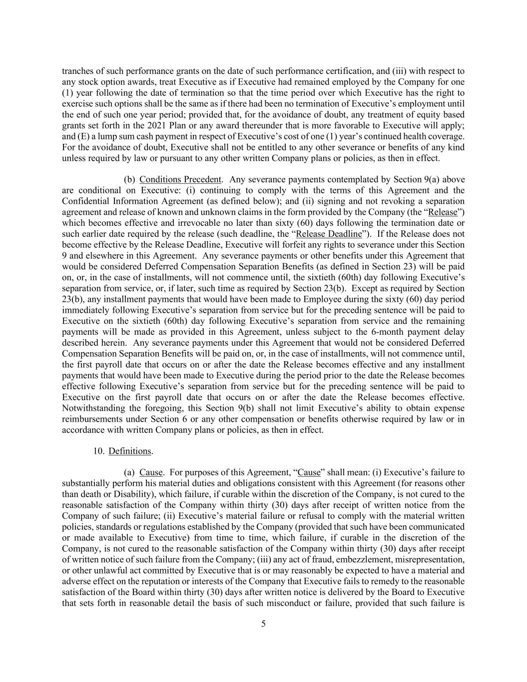 5 tranches of such performance grants on the date of such performance certification, and (iii) with respect to any stock option awards, treat Executive as if Executive had remained employed by the Company for one (1) year following the date of termination so that the time period over which Executive has the right to exercise such options shall be the same as if there had been no termination of Executive’s employment until the end of such one year period; provided that, for the avoidance of doubt, any treatment of equity based grants set forth in the 2021 Plan or any award thereunder that is more favorable to Executive will apply; and (E) a lump sum cash payment in respect of Executive’s cost of one (1) year’s continued health coverage. For the avoidance of doubt, Executive shall not be entitled to any other severance or benefits of any kind unless required by law or pursuant to any other written Company plans or policies, as then in effect. (b) Conditions Precedent. Any severance payments contemplated by Section 9(a) above are conditional on Executive: (i) continuing to comply with the terms of this Agreement and the Confidential Information Agreement (as defined below); and (ii) signing and not revoking a separation agreement and release of known and unknown claims in the form provided by the Company (the “Release”) which becomes effective and irrevocable no later than sixty (60) days following the termination date or such earlier date required by the release (such deadline, the “Release Deadline”). If the Release does not become effective by the Release Deadline, Executive will forfeit any rights to severance under this Section 9 and elsewhere in this Agreement. Any severance payments or other benefits under this Agreement that would be considered Deferred Compensation Separation Benefits (as defined in Section 23) will be paid on, or, in the case of installments, will not commence until, the sixtieth (60th) day following Executive’s separation from service, or, if later, such time as required by Section 23(b). Except as required by Section 23(b), any installment payments that would have been made to Employee during the sixty (60) day period immediately following Executive’s separation from service but for the preceding sentence will be paid to Executive on the sixtieth (60th) day following Executive’s separation from service and the remaining payments will be made as provided in this Agreement, unless subject to the 6-month payment delay described herein. Any severance payments under this Agreement that would not be considered Deferred Compensation Separation Benefits will be paid on, or, in the case of installments, will not commence until, the first payroll date that occurs on or after the date the Release becomes effective and any installment payments that would have been made to Executive during the period prior to the date the Release becomes effective following Executive’s separation from service but for the preceding sentence will be paid to Executive on the first payroll date that occurs on or after the date the Release becomes effective. Notwithstanding the foregoing, this Section 9(b) shall not limit Executive’s ability to obtain expense reimbursements under Section 6 or any other compensation or benefits otherwise required by law or in accordance with written Company plans or policies, as then in effect. 10. Definitions. (a) Cause. For purposes of this Agreement, “Cause” shall mean: (i) Executive’s failure to substantially perform his material duties and obligations consistent with this Agreement (for reasons other than death or Disability), which failure, if curable within the discretion of the Company, is not cured to the reasonable satisfaction of the Company within thirty (30) days after receipt of written notice from the Company of such failure; (ii) Executive’s material failure or refusal to comply with the material written policies, standards or regulations established by the Company (provided that such have been communicated or made available to Executive) from time to time, which failure, if curable in the discretion of the Company, is not cured to the reasonable satisfaction of the Company within thirty (30) days after receipt of written notice of such failure from the Company; (iii) any act of fraud, embezzlement, misrepresentation, or other unlawful act committed by Executive that is or may reasonably be expected to have a material and adverse effect on the reputation or interests of the Company that Executive fails to remedy to the reasonable satisfaction of the Board within thirty (30) days after written notice is delivered by the Board to Executive that sets forth in reasonable detail the basis of such misconduct or failure, provided that such failure is