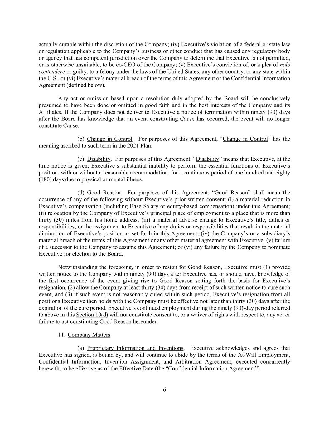 6 actually curable within the discretion of the Company; (iv) Executive’s violation of a federal or state law or regulation applicable to the Company’s business or other conduct that has caused any regulatory body or agency that has competent jurisdiction over the Company to determine that Executive is not permitted, or is otherwise unsuitable, to be co-CEO of the Company; (v) Executive’s conviction of, or a plea of nolo contendere or guilty, to a felony under the laws of the United States, any other country, or any state within the U.S., or (vi) Executive’s material breach of the terms of this Agreement or the Confidential Information Agreement (defined below). Any act or omission based upon a resolution duly adopted by the Board will be conclusively presumed to have been done or omitted in good faith and in the best interests of the Company and its Affiliates. If the Company does not deliver to Executive a notice of termination within ninety (90) days after the Board has knowledge that an event constituting Cause has occurred, the event will no longer constitute Cause. (b) Change in Control. For purposes of this Agreement, “Change in Control” has the meaning ascribed to such term in the 2021 Plan. (c) Disability. For purposes of this Agreement, “Disability” means that Executive, at the time notice is given, Executive’s substantial inability to perform the essential functions of Executive’s position, with or without a reasonable accommodation, for a continuous period of one hundred and eighty (180) days due to physical or mental illness. (d) Good Reason. For purposes of this Agreement, “Good Reason” shall mean the occurrence of any of the following without Executive’s prior written consent: (i) a material reduction in Executive’s compensation (including Base Salary or equity-based compensation) under this Agreement; (ii) relocation by the Company of Executive’s principal place of employment to a place that is more than thirty (30) miles from his home address; (iii) a material adverse change to Executive’s title, duties or responsibilities, or the assignment to Executive of any duties or responsibilities that result in the material diminution of Executive’s position as set forth in this Agreement; (iv) the Company’s or a subsidiary’s material breach of the terms of this Agreement or any other material agreement with Executive; (v) failure of a successor to the Company to assume this Agreement; or (vi) any failure by the Company to nominate Executive for election to the Board. Notwithstanding the foregoing, in order to resign for Good Reason, Executive must (1) provide written notice to the Company within ninety (90) days after Executive has, or should have, knowledge of the first occurrence of the event giving rise to Good Reason setting forth the basis for Executive’s resignation, (2) allow the Company at least thirty (30) days from receipt of such written notice to cure such event, and (3) if such event is not reasonably cured within such period, Executive’s resignation from all positions Executive then holds with the Company must be effective not later than thirty (30) days after the expiration of the cure period. Executive’s continued employment during the ninety (90)-day period referred to above in this Section 10(d) will not constitute consent to, or a waiver of rights with respect to, any act or failure to act constituting Good Reason hereunder. 11. Company Matters. (a) Proprietary Information and Inventions. Executive acknowledges and agrees that Executive has signed, is bound by, and will continue to abide by the terms of the At-Will Employment, Confidential Information, Invention Assignment, and Arbitration Agreement, executed concurrently herewith, to be effective as of the Effective Date (the “Confidential Information Agreement”).