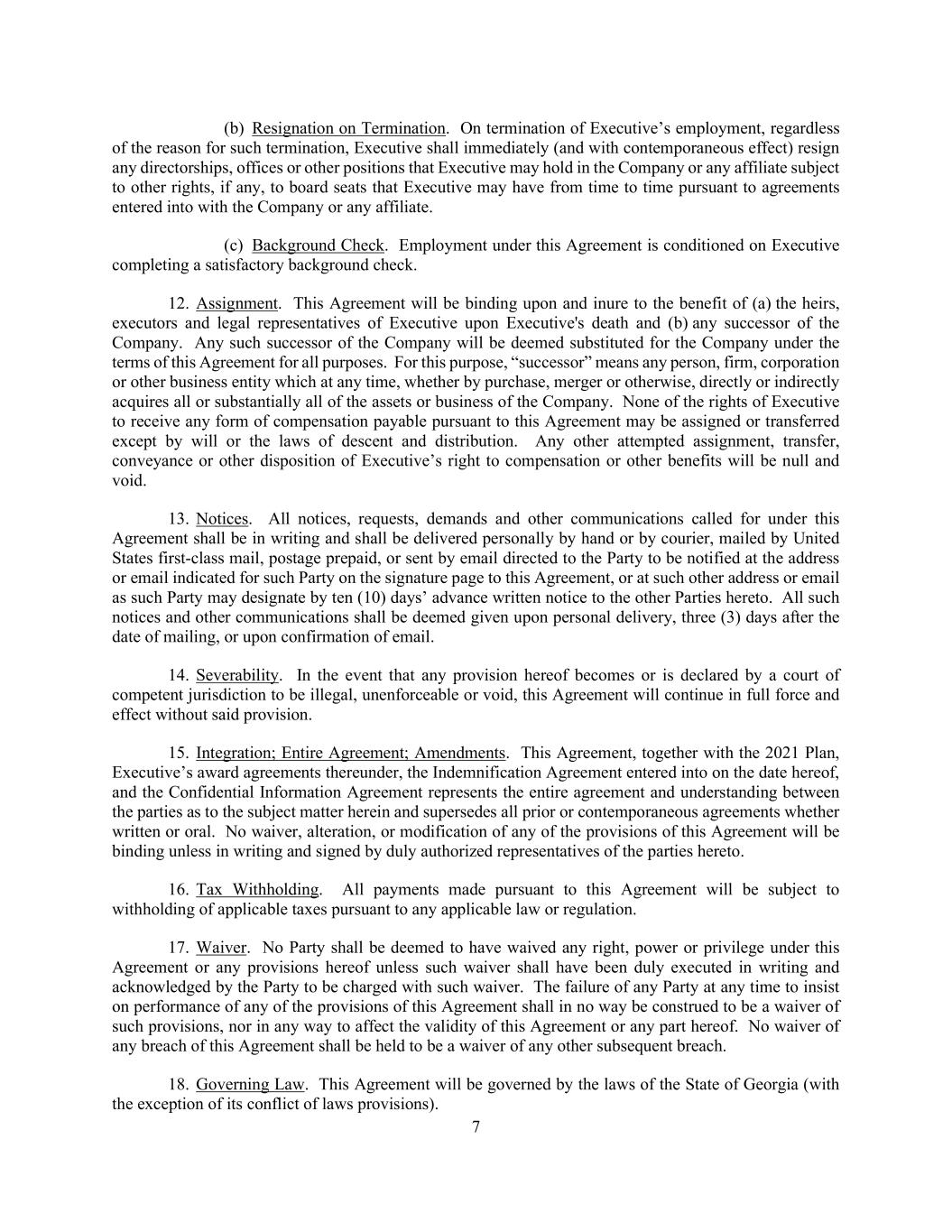 7 (b) Resignation on Termination. On termination of Executive’s employment, regardless of the reason for such termination, Executive shall immediately (and with contemporaneous effect) resign any directorships, offices or other positions that Executive may hold in the Company or any affiliate subject to other rights, if any, to board seats that Executive may have from time to time pursuant to agreements entered into with the Company or any affiliate. (c) Background Check. Employment under this Agreement is conditioned on Executive completing a satisfactory background check. 12. Assignment. This Agreement will be binding upon and inure to the benefit of (a) the heirs, executors and legal representatives of Executive upon Executive's death and (b) any successor of the Company. Any such successor of the Company will be deemed substituted for the Company under the terms of this Agreement for all purposes. For this purpose, “successor” means any person, firm, corporation or other business entity which at any time, whether by purchase, merger or otherwise, directly or indirectly acquires all or substantially all of the assets or business of the Company. None of the rights of Executive to receive any form of compensation payable pursuant to this Agreement may be assigned or transferred except by will or the laws of descent and distribution. Any other attempted assignment, transfer, conveyance or other disposition of Executive’s right to compensation or other benefits will be null and void. 13. Notices. All notices, requests, demands and other communications called for under this Agreement shall be in writing and shall be delivered personally by hand or by courier, mailed by United States first-class mail, postage prepaid, or sent by email directed to the Party to be notified at the address or email indicated for such Party on the signature page to this Agreement, or at such other address or email as such Party may designate by ten (10) days’ advance written notice to the other Parties hereto. All such notices and other communications shall be deemed given upon personal delivery, three (3) days after the date of mailing, or upon confirmation of email. 14. Severability. In the event that any provision hereof becomes or is declared by a court of competent jurisdiction to be illegal, unenforceable or void, this Agreement will continue in full force and effect without said provision. 15. Integration; Entire Agreement; Amendments. This Agreement, together with the 2021 Plan, Executive’s award agreements thereunder, the Indemnification Agreement entered into on the date hereof, and the Confidential Information Agreement represents the entire agreement and understanding between the parties as to the subject matter herein and supersedes all prior or contemporaneous agreements whether written or oral. No waiver, alteration, or modification of any of the provisions of this Agreement will be binding unless in writing and signed by duly authorized representatives of the parties hereto. 16. Tax Withholding. All payments made pursuant to this Agreement will be subject to withholding of applicable taxes pursuant to any applicable law or regulation. 17. Waiver. No Party shall be deemed to have waived any right, power or privilege under this Agreement or any provisions hereof unless such waiver shall have been duly executed in writing and acknowledged by the Party to be charged with such waiver. The failure of any Party at any time to insist on performance of any of the provisions of this Agreement shall in no way be construed to be a waiver of such provisions, nor in any way to affect the validity of this Agreement or any part hereof. No waiver of any breach of this Agreement shall be held to be a waiver of any other subsequent breach. 18. Governing Law. This Agreement will be governed by the laws of the State of Georgia (with the exception of its conflict of laws provisions).