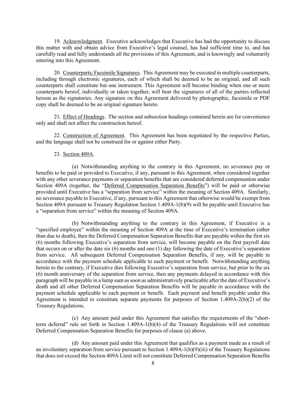 8 19. Acknowledgment. Executive acknowledges that Executive has had the opportunity to discuss this matter with and obtain advice from Executive’s legal counsel, has had sufficient time to, and has carefully read and fully understands all the provisions of this Agreement, and is knowingly and voluntarily entering into this Agreement. 20. Counterparts; Facsimile Signatures. This Agreement may be executed in multiple counterparts, including through electronic signatures, each of which shall be deemed to be an original, and all such counterparts shall constitute but one instrument. This Agreement will become binding when one or more counterparts hereof, individually or taken together, will bear the signatures of all of the parties reflected hereon as the signatories. Any signature on this Agreement delivered by photographic, facsimile or PDF copy shall be deemed to be an original signature hereto. 21. Effect of Headings. The section and subsection headings contained herein are for convenience only and shall not affect the construction hereof. 22. Construction of Agreement. This Agreement has been negotiated by the respective Parties, and the language shall not be construed for or against either Party. 23. Section 409A. (a) Notwithstanding anything to the contrary in this Agreement, no severance pay or benefits to be paid or provided to Executive, if any, pursuant to this Agreement, when considered together with any other severance payments or separation benefits that are considered deferred compensation under Section 409A (together, the “Deferred Compensation Separation Benefits”) will be paid or otherwise provided until Executive has a “separation from service” within the meaning of Section 409A. Similarly, no severance payable to Executive, if any, pursuant to this Agreement that otherwise would be exempt from Section 409A pursuant to Treasury Regulation Section 1.409A-1(b)(9) will be payable until Executive has a “separation from service” within the meaning of Section 409A. (b) Notwithstanding anything to the contrary in this Agreement, if Executive is a “specified employee” within the meaning of Section 409A at the time of Executive’s termination (other than due to death), then the Deferred Compensation Separation Benefits that are payable within the first six (6) months following Executive’s separation from service, will become payable on the first payroll date that occurs on or after the date six (6) months and one (1) day following the date of Executive’s separation from service. All subsequent Deferred Compensation Separation Benefits, if any, will be payable in accordance with the payment schedule applicable to each payment or benefit. Notwithstanding anything herein to the contrary, if Executive dies following Executive’s separation from service, but prior to the six (6) month anniversary of the separation from service, then any payments delayed in accordance with this paragraph will be payable in a lump sum as soon as administratively practicable after the date of Executive’s death and all other Deferred Compensation Separation Benefits will be payable in accordance with the payment schedule applicable to each payment or benefit. Each payment and benefit payable under this Agreement is intended to constitute separate payments for purposes of Section 1.409A-2(b)(2) of the Treasury Regulations. (c) Any amount paid under this Agreement that satisfies the requirements of the “short- term deferral” rule set forth in Section 1.409A-1(b)(4) of the Treasury Regulations will not constitute Deferred Compensation Separation Benefits for purposes of clause (a) above. (d) Any amount paid under this Agreement that qualifies as a payment made as a result of an involuntary separation from service pursuant to Section 1.409A-1(b)(9)(iii) of the Treasury Regulations that does not exceed the Section 409A Limit will not constitute Deferred Compensation Separation Benefits