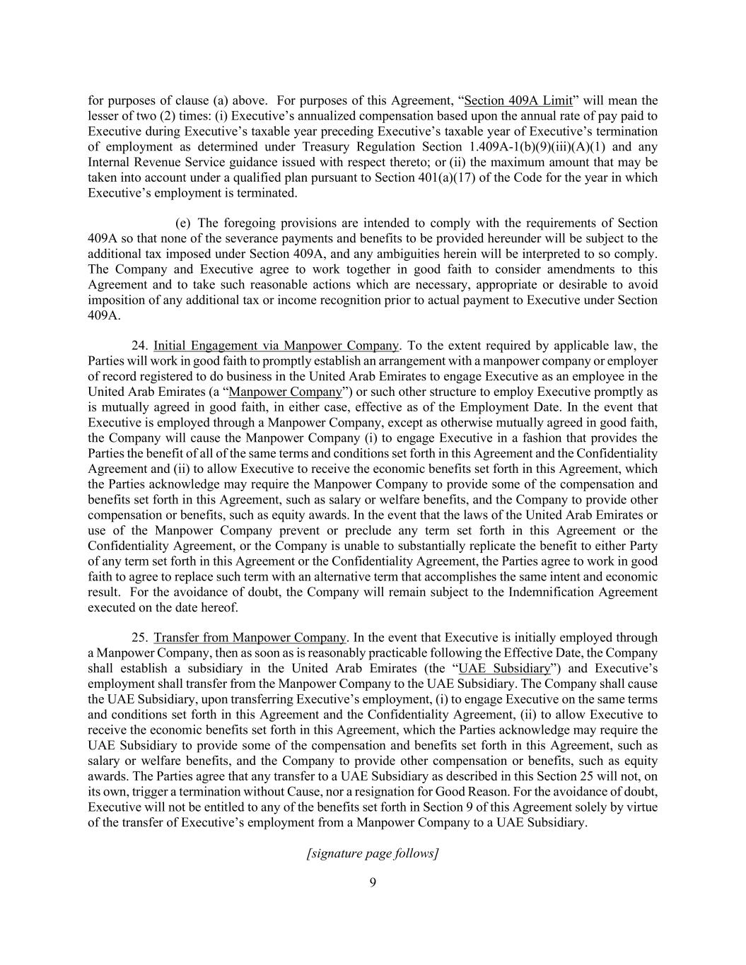 9 for purposes of clause (a) above. For purposes of this Agreement, “Section 409A Limit” will mean the lesser of two (2) times: (i) Executive’s annualized compensation based upon the annual rate of pay paid to Executive during Executive’s taxable year preceding Executive’s taxable year of Executive’s termination of employment as determined under Treasury Regulation Section 1.409A-1(b)(9)(iii)(A)(1) and any Internal Revenue Service guidance issued with respect thereto; or (ii) the maximum amount that may be taken into account under a qualified plan pursuant to Section 401(a)(17) of the Code for the year in which Executive’s employment is terminated. (e) The foregoing provisions are intended to comply with the requirements of Section 409A so that none of the severance payments and benefits to be provided hereunder will be subject to the additional tax imposed under Section 409A, and any ambiguities herein will be interpreted to so comply. The Company and Executive agree to work together in good faith to consider amendments to this Agreement and to take such reasonable actions which are necessary, appropriate or desirable to avoid imposition of any additional tax or income recognition prior to actual payment to Executive under Section 409A. 24. Initial Engagement via Manpower Company. To the extent required by applicable law, the Parties will work in good faith to promptly establish an arrangement with a manpower company or employer of record registered to do business in the United Arab Emirates to engage Executive as an employee in the United Arab Emirates (a “Manpower Company”) or such other structure to employ Executive promptly as is mutually agreed in good faith, in either case, effective as of the Employment Date. In the event that Executive is employed through a Manpower Company, except as otherwise mutually agreed in good faith, the Company will cause the Manpower Company (i) to engage Executive in a fashion that provides the Parties the benefit of all of the same terms and conditions set forth in this Agreement and the Confidentiality Agreement and (ii) to allow Executive to receive the economic benefits set forth in this Agreement, which the Parties acknowledge may require the Manpower Company to provide some of the compensation and benefits set forth in this Agreement, such as salary or welfare benefits, and the Company to provide other compensation or benefits, such as equity awards. In the event that the laws of the United Arab Emirates or use of the Manpower Company prevent or preclude any term set forth in this Agreement or the Confidentiality Agreement, or the Company is unable to substantially replicate the benefit to either Party of any term set forth in this Agreement or the Confidentiality Agreement, the Parties agree to work in good faith to agree to replace such term with an alternative term that accomplishes the same intent and economic result. For the avoidance of doubt, the Company will remain subject to the Indemnification Agreement executed on the date hereof. 25. Transfer from Manpower Company. In the event that Executive is initially employed through a Manpower Company, then as soon as is reasonably practicable following the Effective Date, the Company shall establish a subsidiary in the United Arab Emirates (the “UAE Subsidiary”) and Executive’s employment shall transfer from the Manpower Company to the UAE Subsidiary. The Company shall cause the UAE Subsidiary, upon transferring Executive’s employment, (i) to engage Executive on the same terms and conditions set forth in this Agreement and the Confidentiality Agreement, (ii) to allow Executive to receive the economic benefits set forth in this Agreement, which the Parties acknowledge may require the UAE Subsidiary to provide some of the compensation and benefits set forth in this Agreement, such as salary or welfare benefits, and the Company to provide other compensation or benefits, such as equity awards. The Parties agree that any transfer to a UAE Subsidiary as described in this Section 25 will not, on its own, trigger a termination without Cause, nor a resignation for Good Reason. For the avoidance of doubt, Executive will not be entitled to any of the benefits set forth in Section 9 of this Agreement solely by virtue of the transfer of Executive’s employment from a Manpower Company to a UAE Subsidiary. [signature page follows]