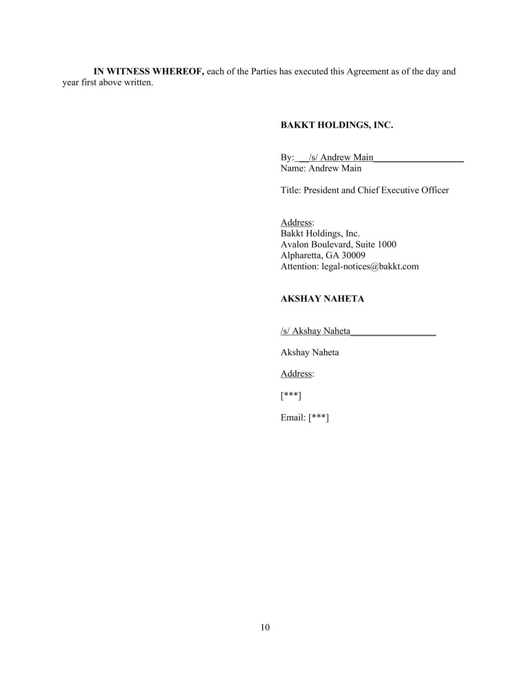 10 IN WITNESS WHEREOF, each of the Parties has executed this Agreement as of the day and year first above written. BAKKT HOLDINGS, INC. By: __/s/ Andrew Main___________________ Name: Andrew Main Title: President and Chief Executive Officer Address: Bakkt Holdings, Inc. Avalon Boulevard, Suite 1000 Alpharetta, GA 30009 Attention: legal-notices@bakkt.com AKSHAY NAHETA /s/ Akshay Naheta__________________ Akshay Naheta Address: [***] Email: [***]