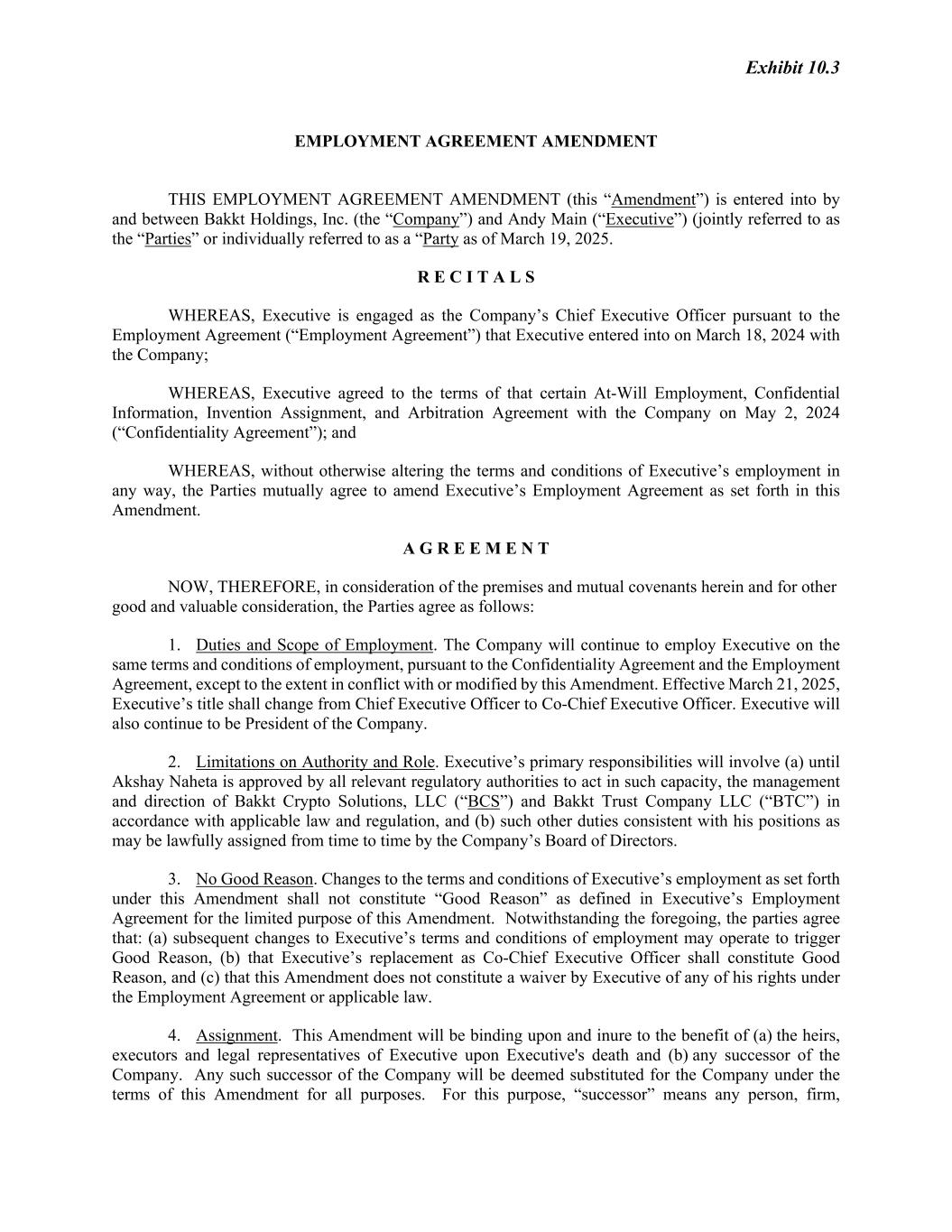 Exhibit 10.3 EMPLOYMENT AGREEMENT AMENDMENT THIS EMPLOYMENT AGREEMENT AMENDMENT (this “Amendment”) is entered into by and between Bakkt Holdings, Inc. (the “Company”) and Andy Main (“Executive”) (jointly referred to as the “Parties” or individually referred to as a “Party as of March 19, 2025. R E C I T A L S WHEREAS, Executive is engaged as the Company’s Chief Executive Officer pursuant to the Employment Agreement (“Employment Agreement”) that Executive entered into on March 18, 2024 with the Company; WHEREAS, Executive agreed to the terms of that certain At-Will Employment, Confidential Information, Invention Assignment, and Arbitration Agreement with the Company on May 2, 2024 (“Confidentiality Agreement”); and WHEREAS, without otherwise altering the terms and conditions of Executive’s employment in any way, the Parties mutually agree to amend Executive’s Employment Agreement as set forth in this Amendment. A G R E E M E N T NOW, THEREFORE, in consideration of the premises and mutual covenants herein and for other good and valuable consideration, the Parties agree as follows: 1. Duties and Scope of Employment. The Company will continue to employ Executive on the same terms and conditions of employment, pursuant to the Confidentiality Agreement and the Employment Agreement, except to the extent in conflict with or modified by this Amendment. Effective March 21, 2025, Executive’s title shall change from Chief Executive Officer to Co-Chief Executive Officer. Executive will also continue to be President of the Company. 2. Limitations on Authority and Role. Executive’s primary responsibilities will involve (a) until Akshay Naheta is approved by all relevant regulatory authorities to act in such capacity, the management and direction of Bakkt Crypto Solutions, LLC (“BCS”) and Bakkt Trust Company LLC (“BTC”) in accordance with applicable law and regulation, and (b) such other duties consistent with his positions as may be lawfully assigned from time to time by the Company’s Board of Directors. 3. No Good Reason. Changes to the terms and conditions of Executive’s employment as set forth under this Amendment shall not constitute “Good Reason” as defined in Executive’s Employment Agreement for the limited purpose of this Amendment. Notwithstanding the foregoing, the parties agree that: (a) subsequent changes to Executive’s terms and conditions of employment may operate to trigger Good Reason, (b) that Executive’s replacement as Co-Chief Executive Officer shall constitute Good Reason, and (c) that this Amendment does not constitute a waiver by Executive of any of his rights under the Employment Agreement or applicable law. 4. Assignment. This Amendment will be binding upon and inure to the benefit of (a) the heirs, executors and legal representatives of Executive upon Executive's death and (b) any successor of the Company. Any such successor of the Company will be deemed substituted for the Company under the terms of this Amendment for all purposes. For this purpose, “successor” means any person, firm,