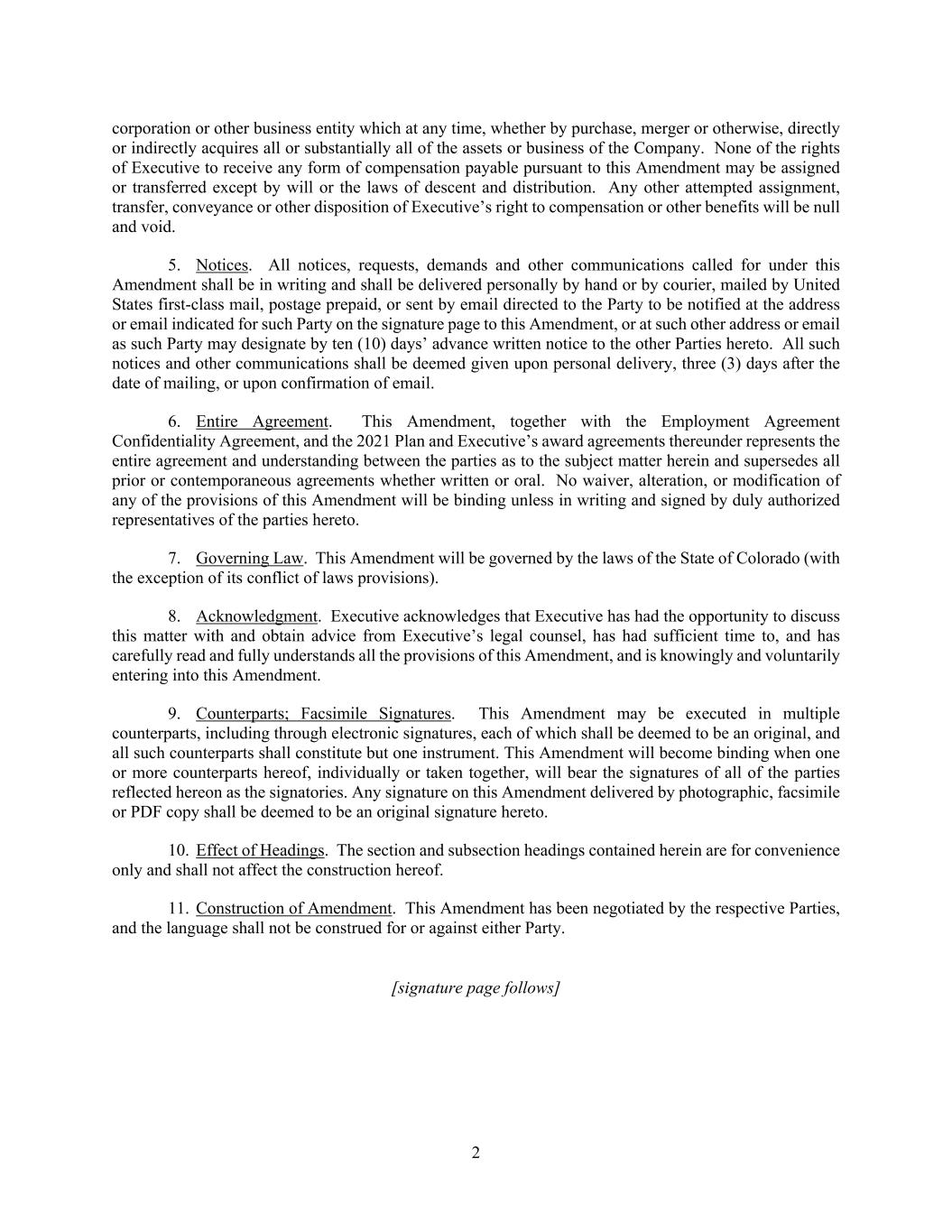 2 corporation or other business entity which at any time, whether by purchase, merger or otherwise, directly or indirectly acquires all or substantially all of the assets or business of the Company. None of the rights of Executive to receive any form of compensation payable pursuant to this Amendment may be assigned or transferred except by will or the laws of descent and distribution. Any other attempted assignment, transfer, conveyance or other disposition of Executive’s right to compensation or other benefits will be null and void. 5. Notices. All notices, requests, demands and other communications called for under this Amendment shall be in writing and shall be delivered personally by hand or by courier, mailed by United States first-class mail, postage prepaid, or sent by email directed to the Party to be notified at the address or email indicated for such Party on the signature page to this Amendment, or at such other address or email as such Party may designate by ten (10) days’ advance written notice to the other Parties hereto. All such notices and other communications shall be deemed given upon personal delivery, three (3) days after the date of mailing, or upon confirmation of email. 6. Entire Agreement. This Amendment, together with the Employment Agreement Confidentiality Agreement, and the 2021 Plan and Executive’s award agreements thereunder represents the entire agreement and understanding between the parties as to the subject matter herein and supersedes all prior or contemporaneous agreements whether written or oral. No waiver, alteration, or modification of any of the provisions of this Amendment will be binding unless in writing and signed by duly authorized representatives of the parties hereto. 7. Governing Law. This Amendment will be governed by the laws of the State of Colorado (with the exception of its conflict of laws provisions). 8. Acknowledgment. Executive acknowledges that Executive has had the opportunity to discuss this matter with and obtain advice from Executive’s legal counsel, has had sufficient time to, and has carefully read and fully understands all the provisions of this Amendment, and is knowingly and voluntarily entering into this Amendment. 9. Counterparts; Facsimile Signatures. This Amendment may be executed in multiple counterparts, including through electronic signatures, each of which shall be deemed to be an original, and all such counterparts shall constitute but one instrument. This Amendment will become binding when one or more counterparts hereof, individually or taken together, will bear the signatures of all of the parties reflected hereon as the signatories. Any signature on this Amendment delivered by photographic, facsimile or PDF copy shall be deemed to be an original signature hereto. 10. Effect of Headings. The section and subsection headings contained herein are for convenience only and shall not affect the construction hereof. 11. Construction of Amendment. This Amendment has been negotiated by the respective Parties, and the language shall not be construed for or against either Party. [signature page follows]