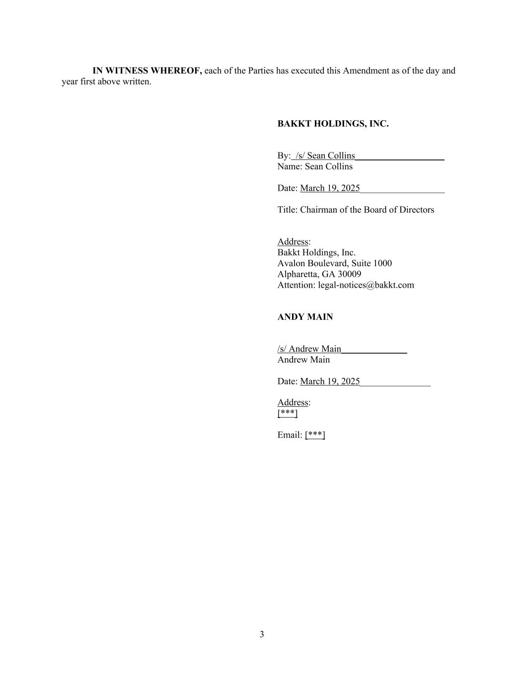 3 IN WITNESS WHEREOF, each of the Parties has executed this Amendment as of the day and year first above written. BAKKT HOLDINGS, INC. By: /s/ Sean Collins___________________ Name: Sean Collins Date: March 19, 2025__________________ Title: Chairman of the Board of Directors Address: Bakkt Holdings, Inc. Avalon Boulevard, Suite 1000 Alpharetta, GA 30009 Attention: legal-notices@bakkt.com ANDY MAIN /s/ Andrew Main______________ Andrew Main Date: March 19, 2025_______________ Address: [***] Email: [***]