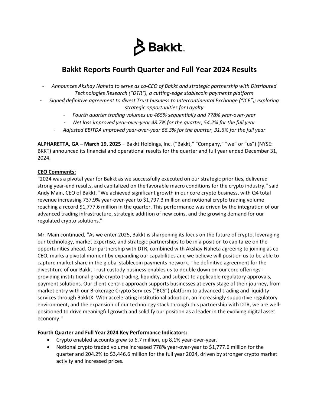 Bakkt Reports Fourth Quarter and Full Year 2024 Results - Announces Akshay Naheta to serve as co-CEO of Bakkt and strategic partnership with Distributed Technologies Research (“DTR”), a cutting-edge stablecoin payments platform - Signed definitive agreement to divest Trust business to Intercontinental Exchange (“ICE”); exploring strategic opportunities for Loyalty - Fourth quarter trading volumes up 465% sequentially and 778% year-over-year - Net loss improved year-over-year 48.7% for the quarter, 54.2% for the full year - Adjusted EBITDA improved year-over-year 66.3% for the quarter, 31.6% for the full year ALPHARETTA, GA – March 19, 2025 – Bakkt Holdings, Inc. (“Bakkt,” “Company,” “we” or “us”) (NYSE: BKKT) announced its financial and operational results for the quarter and full year ended December 31, 2024. CEO Comments: "2024 was a pivotal year for Bakkt as we successfully executed on our strategic priorities, delivered strong year-end results, and capitalized on the favorable macro conditions for the crypto industry," said Andy Main, CEO of Bakkt. "We achieved significant growth in our core crypto business, with Q4 total revenue increasing 737.9% year-over-year to $1,797.3 million and notional crypto trading volume reaching a record $1,777.6 million in the quarter. This performance was driven by the integration of our advanced trading infrastructure, strategic addition of new coins, and the growing demand for our regulated crypto solutions." Mr. Main continued, "As we enter 2025, Bakkt is sharpening its focus on the future of crypto, leveraging our technology, market expertise, and strategic partnerships to be in a position to capitalize on the opportunities ahead. Our partnership with DTR, combined with Akshay Naheta agreeing to joining as co- CEO, marks a pivotal moment by expanding our capabilities and we believe will position us to be able to capture market share in the global stablecoin payments network. The definitive agreement for the divestiture of our Bakkt Trust custody business enables us to double down on our core offerings - providing institutional-grade crypto trading, liquidity, and subject to applicable regulatory approvals, payment solutions. Our client-centric approach supports businesses at every stage of their journey, from market entry with our Brokerage Crypto Services (“BCS”) platform to advanced trading and liquidity services through BakktX. With accelerating institutional adoption, an increasingly supportive regulatory environment, and the expansion of our technology stack through this partnership with DTR, we are well- positioned to drive meaningful growth and solidify our position as a leader in the evolving digital asset economy." Fourth Quarter and Full Year 2024 Key Performance Indicators:  Crypto enabled accounts grew to 6.7 million, up 8.1% year-over-year.  Notional crypto traded volume increased 778% year-over-year to $1,777.6 million for the quarter and 204.2% to $3,446.6 million for the full year 2024, driven by stronger crypto market activity and increased prices.