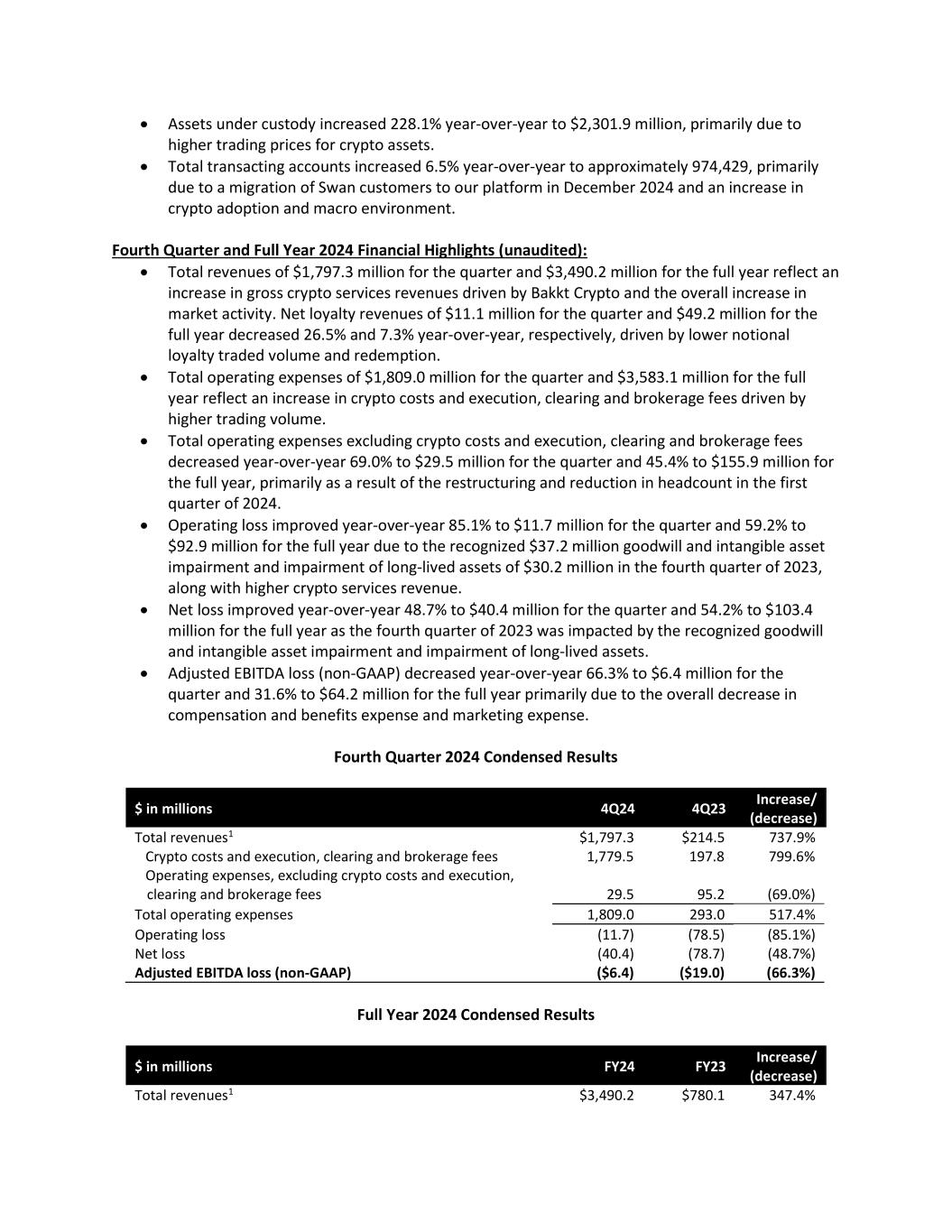  Assets under custody increased 228.1% year-over-year to $2,301.9 million, primarily due to higher trading prices for crypto assets.  Total transacting accounts increased 6.5% year-over-year to approximately 974,429, primarily due to a migration of Swan customers to our platform in December 2024 and an increase in crypto adoption and macro environment. Fourth Quarter and Full Year 2024 Financial Highlights (unaudited):  Total revenues of $1,797.3 million for the quarter and $3,490.2 million for the full year reflect an increase in gross crypto services revenues driven by Bakkt Crypto and the overall increase in market activity. Net loyalty revenues of $11.1 million for the quarter and $49.2 million for the full year decreased 26.5% and 7.3% year-over-year, respectively, driven by lower notional loyalty traded volume and redemption.  Total operating expenses of $1,809.0 million for the quarter and $3,583.1 million for the full year reflect an increase in crypto costs and execution, clearing and brokerage fees driven by higher trading volume.  Total operating expenses excluding crypto costs and execution, clearing and brokerage fees decreased year-over-year 69.0% to $29.5 million for the quarter and 45.4% to $155.9 million for the full year, primarily as a result of the restructuring and reduction in headcount in the first quarter of 2024.  Operating loss improved year-over-year 85.1% to $11.7 million for the quarter and 59.2% to $92.9 million for the full year due to the recognized $37.2 million goodwill and intangible asset impairment and impairment of long-lived assets of $30.2 million in the fourth quarter of 2023, along with higher crypto services revenue.  Net loss improved year-over-year 48.7% to $40.4 million for the quarter and 54.2% to $103.4 million for the full year as the fourth quarter of 2023 was impacted by the recognized goodwill and intangible asset impairment and impairment of long-lived assets.  Adjusted EBITDA loss (non-GAAP) decreased year-over-year 66.3% to $6.4 million for the quarter and 31.6% to $64.2 million for the full year primarily due to the overall decrease in compensation and benefits expense and marketing expense. Fourth Quarter 2024 Condensed Results $ in millions 4Q24 4Q23 Increase/ (decrease) Total revenues1 $1,797.3 $214.5 737.9% Crypto costs and execution, clearing and brokerage fees 1,779.5 197.8 799.6% Operating expenses, excluding crypto costs and execution, clearing and brokerage fees 29.5 95.2 (69.0%) Total operating expenses 1,809.0 293.0 517.4% Operating loss (11.7) (78.5) (85.1%) Net loss (40.4) (78.7) (48.7%) Adjusted EBITDA loss (non-GAAP) ($6.4) ($19.0) (66.3%) Full Year 2024 Condensed Results $ in millions FY24 FY23 Increase/ (decrease) Total revenues1 $3,490.2 $780.1 347.4%