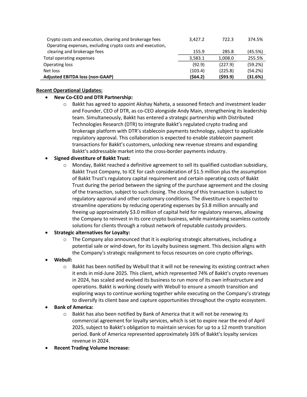 Crypto costs and execution, clearing and brokerage fees 3,427.2 722.3 374.5% Operating expenses, excluding crypto costs and execution, clearing and brokerage fees 155.9 285.8 (45.5%) Total operating expenses 3,583.1 1,008.0 255.5% Operating loss (92.9) (227.9) (59.2%) Net loss (103.4) (225.8) (54.2%) Adjusted EBITDA loss (non-GAAP) ($64.2) ($93.9) (31.6%) Recent Operational Updates:  New Co-CEO and DTR Partnership: o Bakkt has agreed to appoint Akshay Naheta, a seasoned fintech and investment leader and Founder, CEO of DTR, as co-CEO alongside Andy Main, strengthening its leadership team. Simultaneously, Bakkt has entered a strategic partnership with Distributed Technologies Research (DTR) to integrate Bakkt’s regulated crypto trading and brokerage platform with DTR’s stablecoin payments technology, subject to applicable regulatory approval. This collaboration is expected to enable stablecoin payment transactions for Bakkt’s customers, unlocking new revenue streams and expanding Bakkt’s addressable market into the cross-border payments industry.  Signed divestiture of Bakkt Trust: o Monday, Bakkt reached a definitive agreement to sell its qualified custodian subsidiary, Bakkt Trust Company, to ICE for cash consideration of $1.5 million plus the assumption of Bakkt Trust's regulatory capital requirement and certain operating costs of Bakkt Trust during the period between the signing of the purchase agreement and the closing of the transaction, subject to such closing. The closing of this transaction is subject to regulatory approval and other customary conditions. The divestiture is expected to streamline operations by reducing operating expenses by $3.8 million annually and freeing up approximately $3.0 million of capital held for regulatory reserves, allowing the Company to reinvest in its core crypto business, while maintaining seamless custody solutions for clients through a robust network of reputable custody providers.  Strategic alternatives for Loyalty: o The Company also announced that it is exploring strategic alternatives, including a potential sale or wind-down, for its Loyalty business segment. This decision aligns with the Company's strategic realignment to focus resources on core crypto offerings.  Webull: o Bakkt has been notified by Webull that it will not be renewing its existing contract when it ends in mid-June 2025. This client, which represented 74% of Bakkt's crypto revenues in 2024, has scaled and evolved its business to run more of its own infrastructure and operations. Bakkt is working closely with Webull to ensure a smooth transition and exploring ways to continue working together while executing on the Company’s strategy to diversify its client base and capture opportunities throughout the crypto ecosystem.  Bank of America: o Bakkt has also been notified by Bank of America that it will not be renewing its commercial agreement for loyalty services, which is set to expire near the end of April 2025, subject to Bakkt’s obligation to maintain services for up to a 12 month transition period. Bank of America represented approximately 16% of Bakkt’s loyalty services revenue in 2024.  Recent Trading Volume Increase: