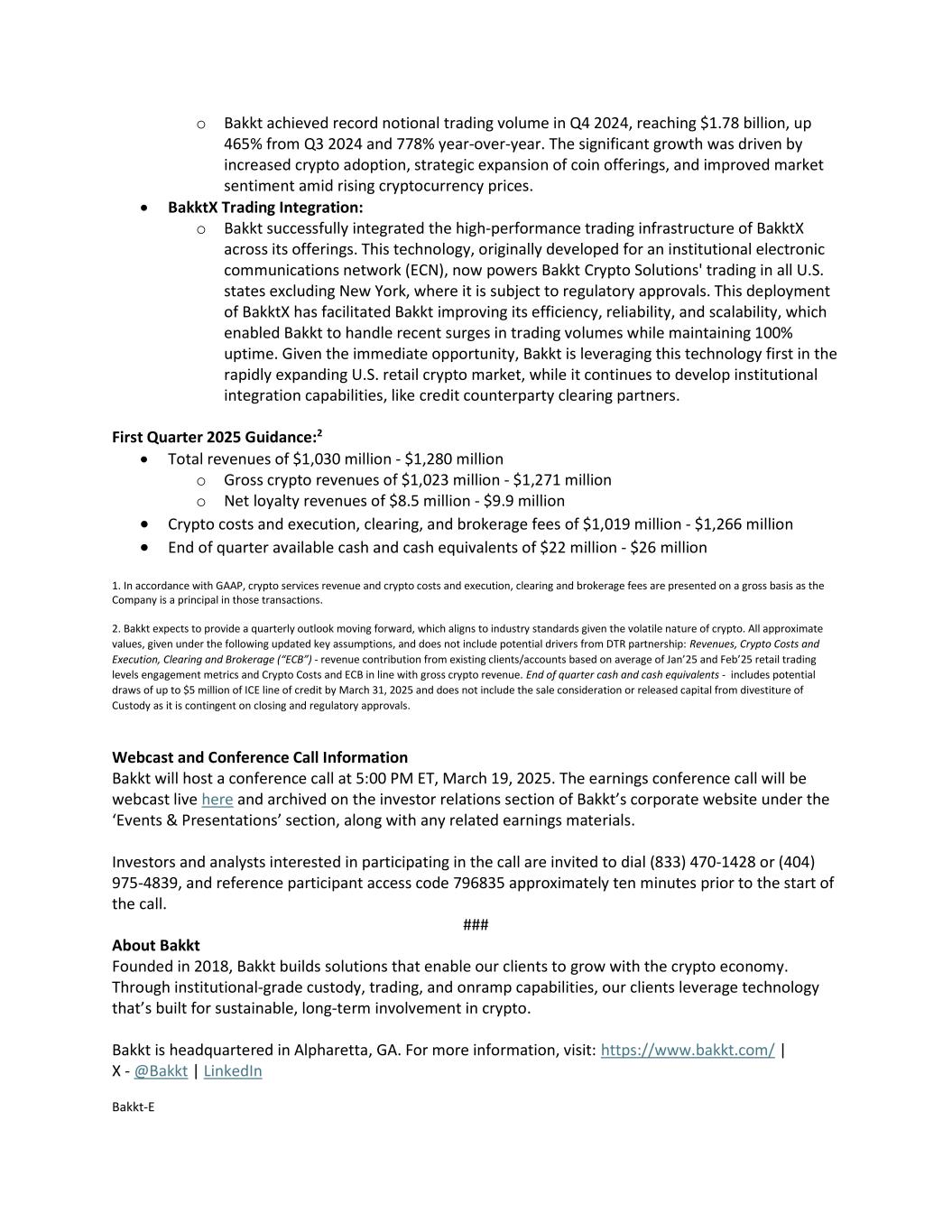 o Bakkt achieved record notional trading volume in Q4 2024, reaching $1.78 billion, up 465% from Q3 2024 and 778% year-over-year. The significant growth was driven by increased crypto adoption, strategic expansion of coin offerings, and improved market sentiment amid rising cryptocurrency prices.  BakktX Trading Integration: o Bakkt successfully integrated the high-performance trading infrastructure of BakktX across its offerings. This technology, originally developed for an institutional electronic communications network (ECN), now powers Bakkt Crypto Solutions' trading in all U.S. states excluding New York, where it is subject to regulatory approvals. This deployment of BakktX has facilitated Bakkt improving its efficiency, reliability, and scalability, which enabled Bakkt to handle recent surges in trading volumes while maintaining 100% uptime. Given the immediate opportunity, Bakkt is leveraging this technology first in the rapidly expanding U.S. retail crypto market, while it continues to develop institutional integration capabilities, like credit counterparty clearing partners. First Quarter 2025 Guidance:2  Total revenues of $1,030 million - $1,280 million o Gross crypto revenues of $1,023 million - $1,271 million o Net loyalty revenues of $8.5 million - $9.9 million  Crypto costs and execution, clearing, and brokerage fees of $1,019 million - $1,266 million  End of quarter available cash and cash equivalents of $22 million - $26 million 1. In accordance with GAAP, crypto services revenue and crypto costs and execution, clearing and brokerage fees are presented on a gross basis as the Company is a principal in those transactions. 2. Bakkt expects to provide a quarterly outlook moving forward, which aligns to industry standards given the volatile nature of crypto. All approximate values, given under the following updated key assumptions, and does not include potential drivers from DTR partnership: Revenues, Crypto Costs and Execution, Clearing and Brokerage (“ECB”) - revenue contribution from existing clients/accounts based on average of Jan’25 and Feb’25 retail trading levels engagement metrics and Crypto Costs and ECB in line with gross crypto revenue. End of quarter cash and cash equivalents - includes potential draws of up to $5 million of ICE line of credit by March 31, 2025 and does not include the sale consideration or released capital from divestiture of Custody as it is contingent on closing and regulatory approvals. Webcast and Conference Call Information Bakkt will host a conference call at 5:00 PM ET, March 19, 2025. The earnings conference call will be webcast live here and archived on the investor relations section of Bakkt’s corporate website under the ‘Events & Presentations’ section, along with any related earnings materials. Investors and analysts interested in participating in the call are invited to dial (833) 470-1428 or (404) 975-4839, and reference participant access code 796835 approximately ten minutes prior to the start of the call. ### About Bakkt Founded in 2018, Bakkt builds solutions that enable our clients to grow with the crypto economy. Through institutional-grade custody, trading, and onramp capabilities, our clients leverage technology that’s built for sustainable, long-term involvement in crypto. Bakkt is headquartered in Alpharetta, GA. For more information, visit: https://www.bakkt.com/ | X - @Bakkt | LinkedIn Bakkt-E
