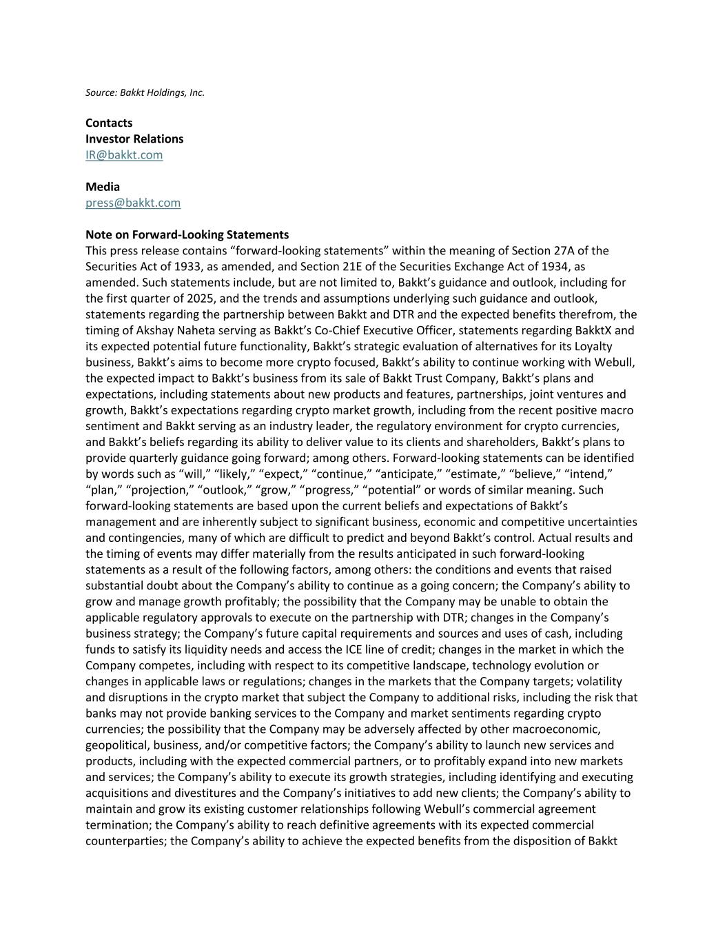 Source: Bakkt Holdings, Inc. Contacts Investor Relations IR@bakkt.com Media press@bakkt.com Note on Forward-Looking Statements This press release contains “forward-looking statements” within the meaning of Section 27A of the Securities Act of 1933, as amended, and Section 21E of the Securities Exchange Act of 1934, as amended. Such statements include, but are not limited to, Bakkt’s guidance and outlook, including for the first quarter of 2025, and the trends and assumptions underlying such guidance and outlook, statements regarding the partnership between Bakkt and DTR and the expected benefits therefrom, the timing of Akshay Naheta serving as Bakkt’s Co-Chief Executive Officer, statements regarding BakktX and its expected potential future functionality, Bakkt’s strategic evaluation of alternatives for its Loyalty business, Bakkt’s aims to become more crypto focused, Bakkt’s ability to continue working with Webull, the expected impact to Bakkt’s business from its sale of Bakkt Trust Company, Bakkt’s plans and expectations, including statements about new products and features, partnerships, joint ventures and growth, Bakkt’s expectations regarding crypto market growth, including from the recent positive macro sentiment and Bakkt serving as an industry leader, the regulatory environment for crypto currencies, and Bakkt’s beliefs regarding its ability to deliver value to its clients and shareholders, Bakkt’s plans to provide quarterly guidance going forward; among others. Forward-looking statements can be identified by words such as “will,” “likely,” “expect,” “continue,” “anticipate,” “estimate,” “believe,” “intend,” “plan,” “projection,” “outlook,” “grow,” “progress,” “potential” or words of similar meaning. Such forward-looking statements are based upon the current beliefs and expectations of Bakkt’s management and are inherently subject to significant business, economic and competitive uncertainties and contingencies, many of which are difficult to predict and beyond Bakkt’s control. Actual results and the timing of events may differ materially from the results anticipated in such forward-looking statements as a result of the following factors, among others: the conditions and events that raised substantial doubt about the Company’s ability to continue as a going concern; the Company’s ability to grow and manage growth profitably; the possibility that the Company may be unable to obtain the applicable regulatory approvals to execute on the partnership with DTR; changes in the Company’s business strategy; the Company’s future capital requirements and sources and uses of cash, including funds to satisfy its liquidity needs and access the ICE line of credit; changes in the market in which the Company competes, including with respect to its competitive landscape, technology evolution or changes in applicable laws or regulations; changes in the markets that the Company targets; volatility and disruptions in the crypto market that subject the Company to additional risks, including the risk that banks may not provide banking services to the Company and market sentiments regarding crypto currencies; the possibility that the Company may be adversely affected by other macroeconomic, geopolitical, business, and/or competitive factors; the Company’s ability to launch new services and products, including with the expected commercial partners, or to profitably expand into new markets and services; the Company’s ability to execute its growth strategies, including identifying and executing acquisitions and divestitures and the Company’s initiatives to add new clients; the Company’s ability to maintain and grow its existing customer relationships following Webull’s commercial agreement termination; the Company’s ability to reach definitive agreements with its expected commercial counterparties; the Company’s ability to achieve the expected benefits from the disposition of Bakkt