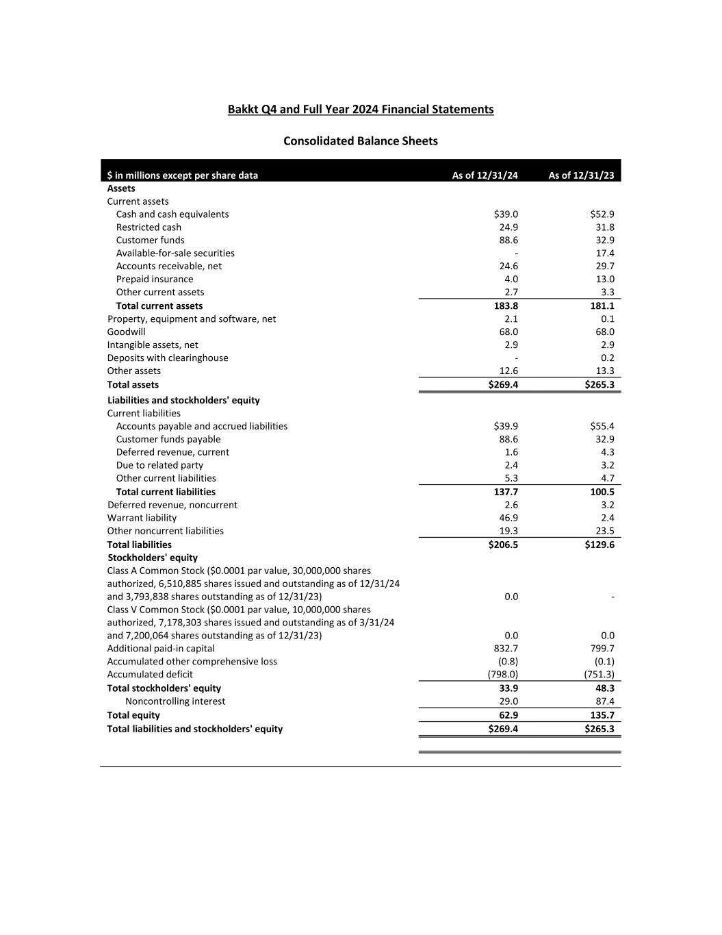 Bakkt Q4 and Full Year 2024 Financial Statements Consolidated Balance Sheets $ in millions except per share data As of 12/31/24 As of 12/31/23 Assets Current assets Cash and cash equivalents $39.0 $52.9 Restricted cash 24.9 31.8 Customer funds 88.6 32.9 Available-for-sale securities - 17.4 Accounts receivable, net 24.6 29.7 Prepaid insurance 4.0 13.0 Other current assets 2.7 3.3 Total current assets 183.8 181.1 Property, equipment and software, net 2.1 0.1 Goodwill 68.0 68.0 Intangible assets, net 2.9 2.9 Deposits with clearinghouse - 0.2 Other assets 12.6 13.3 Total assets $269.4 $265.3 Liabilities and stockholders' equity Current liabilities Accounts payable and accrued liabilities $39.9 $55.4 Customer funds payable 88.6 32.9 Deferred revenue, current 1.6 4.3 Due to related party 2.4 3.2 Other current liabilities 5.3 4.7 Total current liabilities 137.7 100.5 Deferred revenue, noncurrent 2.6 3.2 Warrant liability 46.9 2.4 Other noncurrent liabilities 19.3 23.5 Total liabilities $206.5 $129.6 Stockholders' equity Class A Common Stock ($0.0001 par value, 30,000,000 shares authorized, 6,510,885 shares issued and outstanding as of 12/31/24 and 3,793,838 shares outstanding as of 12/31/23) 0.0 - Class V Common Stock ($0.0001 par value, 10,000,000 shares authorized, 7,178,303 shares issued and outstanding as of 3/31/24 and 7,200,064 shares outstanding as of 12/31/23) 0.0 0.0 Additional paid-in capital 832.7 799.7 Accumulated other comprehensive loss (0.8) (0.1) Accumulated deficit (798.0) (751.3) Total stockholders' equity 33.9 48.3 Noncontrolling interest 29.0 87.4 Total equity 62.9 135.7 Total liabilities and stockholders' equity $269.4 $265.3