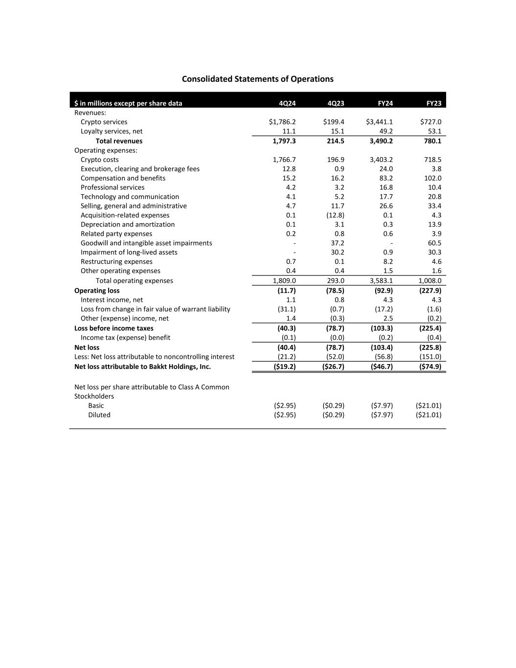 Consolidated Statements of Operations $ in millions except per share data 4Q24 4Q23 FY24 FY23 Revenues: Crypto services $1,786.2 $199.4 $3,441.1 $727.0 Loyalty services, net 11.1 15.1 49.2 53.1 Total revenues 1,797.3 214.5 3,490.2 780.1 Operating expenses: Crypto costs 1,766.7 196.9 3,403.2 718.5 Execution, clearing and brokerage fees 12.8 0.9 24.0 3.8 Compensation and benefits 15.2 16.2 83.2 102.0 Professional services 4.2 3.2 16.8 10.4 Technology and communication 4.1 5.2 17.7 20.8 Selling, general and administrative 4.7 11.7 26.6 33.4 Acquisition-related expenses 0.1 (12.8) 0.1 4.3 Depreciation and amortization 0.1 3.1 0.3 13.9 Related party expenses 0.2 0.8 0.6 3.9 Goodwill and intangible asset impairments - 37.2 - 60.5 Impairment of long-lived assets - 30.2 0.9 30.3 Restructuring expenses 0.7 0.1 8.2 4.6 Other operating expenses 0.4 0.4 1.5 1.6 Total operating expenses 1,809.0 293.0 3,583.1 1,008.0 Operating loss (11.7) (78.5) (92.9) (227.9) Interest income, net 1.1 0.8 4.3 4.3 Loss from change in fair value of warrant liability (31.1) (0.7) (17.2) (1.6) Other (expense) income, net 1.4 (0.3) 2.5 (0.2) Loss before income taxes (40.3) (78.7) (103.3) (225.4) Income tax (expense) benefit (0.1) (0.0) (0.2) (0.4) Net loss (40.4) (78.7) (103.4) (225.8) Less: Net loss attributable to noncontrolling interest (21.2) (52.0) (56.8) (151.0) Net loss attributable to Bakkt Holdings, Inc. ($19.2) ($26.7) ($46.7) ($74.9) Net loss per share attributable to Class A Common Stockholders Basic ($2.95) ($0.29) ($7.97) ($21.01) Diluted ($2.95) ($0.29) ($7.97) ($21.01)
