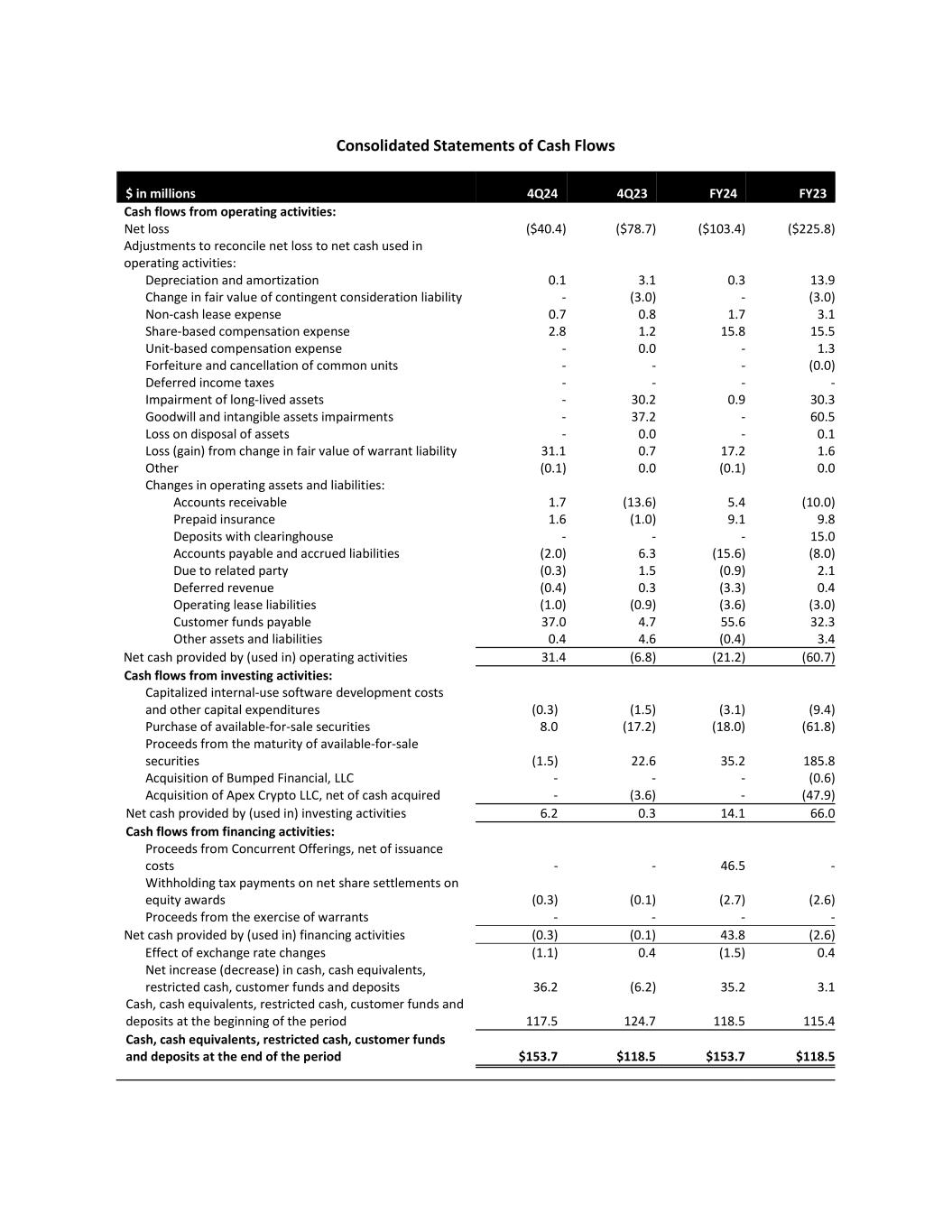 Consolidated Statements of Cash Flows $ in millions 4Q24 4Q23 FY24 FY23 Cash flows from operating activities: Net loss ($40.4) ($78.7) ($103.4) ($225.8) Adjustments to reconcile net loss to net cash used in operating activities: Depreciation and amortization 0.1 3.1 0.3 13.9 Change in fair value of contingent consideration liability - (3.0) - (3.0) Non-cash lease expense 0.7 0.8 1.7 3.1 Share-based compensation expense 2.8 1.2 15.8 15.5 Unit-based compensation expense - 0.0 - 1.3 Forfeiture and cancellation of common units - - - (0.0) Deferred income taxes - - - - Impairment of long-lived assets - 30.2 0.9 30.3 Goodwill and intangible assets impairments - 37.2 - 60.5 Loss on disposal of assets - 0.0 - 0.1 Loss (gain) from change in fair value of warrant liability 31.1 0.7 17.2 1.6 Other (0.1) 0.0 (0.1) 0.0 Changes in operating assets and liabilities: Accounts receivable 1.7 (13.6) 5.4 (10.0) Prepaid insurance 1.6 (1.0) 9.1 9.8 Deposits with clearinghouse - - - 15.0 Accounts payable and accrued liabilities (2.0) 6.3 (15.6) (8.0) Due to related party (0.3) 1.5 (0.9) 2.1 Deferred revenue (0.4) 0.3 (3.3) 0.4 Operating lease liabilities (1.0) (0.9) (3.6) (3.0) Customer funds payable 37.0 4.7 55.6 32.3 Other assets and liabilities 0.4 4.6 (0.4) 3.4 Net cash provided by (used in) operating activities 31.4 (6.8) (21.2) (60.7) Cash flows from investing activities: Capitalized internal-use software development costs and other capital expenditures (0.3) (1.5) (3.1) (9.4) Purchase of available-for-sale securities 8.0 (17.2) (18.0) (61.8) Proceeds from the maturity of available-for-sale securities (1.5) 22.6 35.2 185.8 Acquisition of Bumped Financial, LLC - - - (0.6) Acquisition of Apex Crypto LLC, net of cash acquired - (3.6) - (47.9) Net cash provided by (used in) investing activities 6.2 0.3 14.1 66.0 Cash flows from financing activities: Proceeds from Concurrent Offerings, net of issuance costs - - 46.5 - Withholding tax payments on net share settlements on equity awards (0.3) (0.1) (2.7) (2.6) Proceeds from the exercise of warrants - - - - Net cash provided by (used in) financing activities (0.3) (0.1) 43.8 (2.6) Effect of exchange rate changes (1.1) 0.4 (1.5) 0.4 Net increase (decrease) in cash, cash equivalents, restricted cash, customer funds and deposits 36.2 (6.2) 35.2 3.1 Cash, cash equivalents, restricted cash, customer funds and deposits at the beginning of the period 117.5 124.7 118.5 115.4 Cash, cash equivalents, restricted cash, customer funds and deposits at the end of the period $153.7 $118.5 $153.7 $118.5