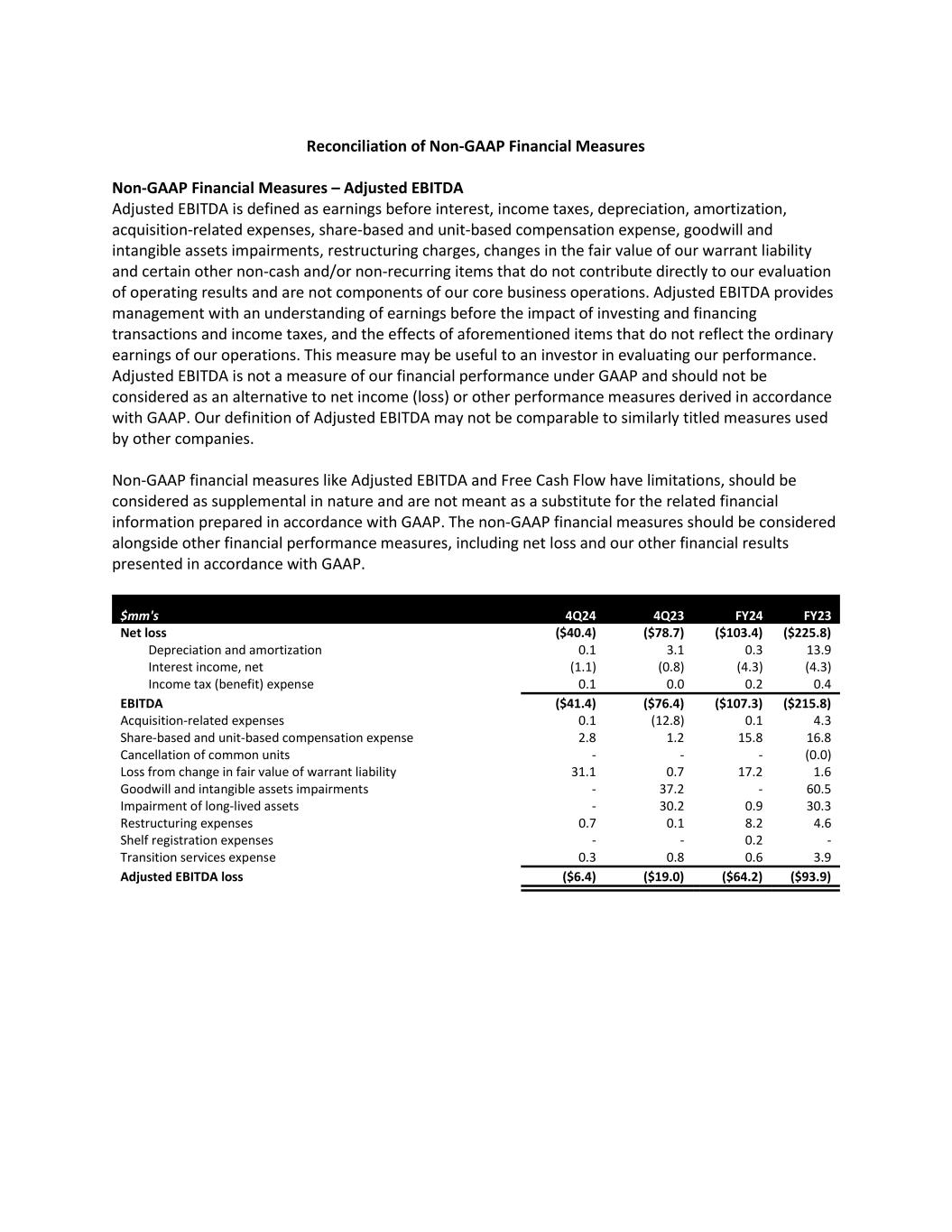 Reconciliation of Non-GAAP Financial Measures Non-GAAP Financial Measures – Adjusted EBITDA Adjusted EBITDA is defined as earnings before interest, income taxes, depreciation, amortization, acquisition-related expenses, share-based and unit-based compensation expense, goodwill and intangible assets impairments, restructuring charges, changes in the fair value of our warrant liability and certain other non-cash and/or non-recurring items that do not contribute directly to our evaluation of operating results and are not components of our core business operations. Adjusted EBITDA provides management with an understanding of earnings before the impact of investing and financing transactions and income taxes, and the effects of aforementioned items that do not reflect the ordinary earnings of our operations. This measure may be useful to an investor in evaluating our performance. Adjusted EBITDA is not a measure of our financial performance under GAAP and should not be considered as an alternative to net income (loss) or other performance measures derived in accordance with GAAP. Our definition of Adjusted EBITDA may not be comparable to similarly titled measures used by other companies. Non-GAAP financial measures like Adjusted EBITDA and Free Cash Flow have limitations, should be considered as supplemental in nature and are not meant as a substitute for the related financial information prepared in accordance with GAAP. The non-GAAP financial measures should be considered alongside other financial performance measures, including net loss and our other financial results presented in accordance with GAAP. $mm's 4Q24 4Q23 FY24 FY23 Net loss ($40.4) ($78.7) ($103.4) ($225.8) Depreciation and amortization 0.1 3.1 0.3 13.9 Interest income, net (1.1) (0.8) (4.3) (4.3) Income tax (benefit) expense 0.1 0.0 0.2 0.4 EBITDA ($41.4) ($76.4) ($107.3) ($215.8) Acquisition-related expenses 0.1 (12.8) 0.1 4.3 Share-based and unit-based compensation expense 2.8 1.2 15.8 16.8 Cancellation of common units - - - (0.0) Loss from change in fair value of warrant liability 31.1 0.7 17.2 1.6 Goodwill and intangible assets impairments - 37.2 - 60.5 Impairment of long-lived assets - 30.2 0.9 30.3 Restructuring expenses 0.7 0.1 8.2 4.6 Shelf registration expenses - - 0.2 - Transition services expense 0.3 0.8 0.6 3.9 Adjusted EBITDA loss ($6.4) ($19.0) ($64.2) ($93.9)