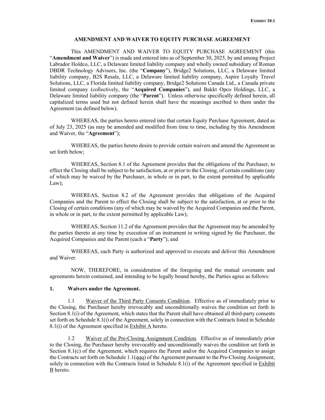 EXHIBIT 10.1 AMENDMENT AND WAIVER TO EQUITY PURCHASE AGREEMENT This AMENDMENT AND WAIVER TO EQUITY PURCHASE AGREEMENT (this “Amendment and Waiver”) is made and entered into as of September 30, 2025, by and among Project Labrador Holdco, LLC, a Delaware limited liability company and wholly owned subsidiary of Roman DBDR Technology Advisors, Inc. (the “Company”), Bridge2 Solutions, LLC, a Delaware limited liability company, B2S Resale, LLC, a Delaware limited liability company, Aspire Loyalty Travel Solutions, LLC, a Florida limited liability company, Bridge2 Solutions Canada Ltd., a Canada private limited company (collectively, the “Acquired Companies”), and Bakkt Opco Holdings, LLC, a Delaware limited liability company (the “Parent”). Unless otherwise specifically defined herein, all capitalized terms used but not defined herein shall have the meanings ascribed to them under the Agreement (as defined below). WHEREAS, the parties hereto entered into that certain Equity Purchase Agreement, dated as of July 23, 2025 (as may be amended and modified from time to time, including by this Amendment and Waiver, the “Agreement”); WHEREAS, the parties hereto desire to provide certain waivers and amend the Agreement as set forth below; WHEREAS, Section 8.1 of the Agreement provides that the obligations of the Purchaser, to effect the Closing shall be subject to be satisfaction, at or prior to the Closing, of certain conditions (any of which may be waived by the Purchaser, in whole or in part, to the extent permitted by applicable Law); WHEREAS, Section 8.2 of the Agreement provides that obligations of the Acquired Companies and the Parent to effect the Closing shall be subject to the satisfaction, at or prior to the Closing of certain conditions (any of which may be waived by the Acquired Companies and the Parent, in whole or in part, to the extent permitted by applicable Law); WHEREAS, Section 11.2 of the Agreement provides that the Agreement may be amended by the parties thereto at any time by execution of an instrument in writing signed by the Purchaser, the Acquired Companies and the Parent (each a “Party”); and WHEREAS, each Party is authorized and approved to execute and deliver this Amendment and Waiver. NOW, THEREFORE, in consideration of the foregoing and the mutual covenants and agreements herein contained, and intending to be legally bound hereby, the Parties agree as follows: 1. Waivers under the Agreement. 1.1 Waiver of the Third Party Consents Condition. Effective as of immediately prior to the Closing, the Purchaser hereby irrevocably and unconditionally waives the condition set forth in Section 8.1(i) of the Agreement, which states that the Parent shall have obtained all third-party consents set forth on Schedule 8.1(i) of the Agreement, solely in connection with the Contracts listed in Schedule 8.1(i) of the Agreement specified in Exhibit A hereto. 1.2 Waiver of the Pre-Closing Assignment Condition. Effective as of immediately prior to the Closing, the Purchaser hereby irrevocably and unconditionally waives the condition set forth in Section 8.1(c) of the Agreement, which requires the Parent and/or the Acquired Companies to assign the Contracts set forth on Schedule 1.1(qqq) of the Agreement pursuant to the Pre-Closing Assignment, solely in connection with the Contracts listed in Schedule 8.1(i) of the Agreement specified in Exhibit B hereto.